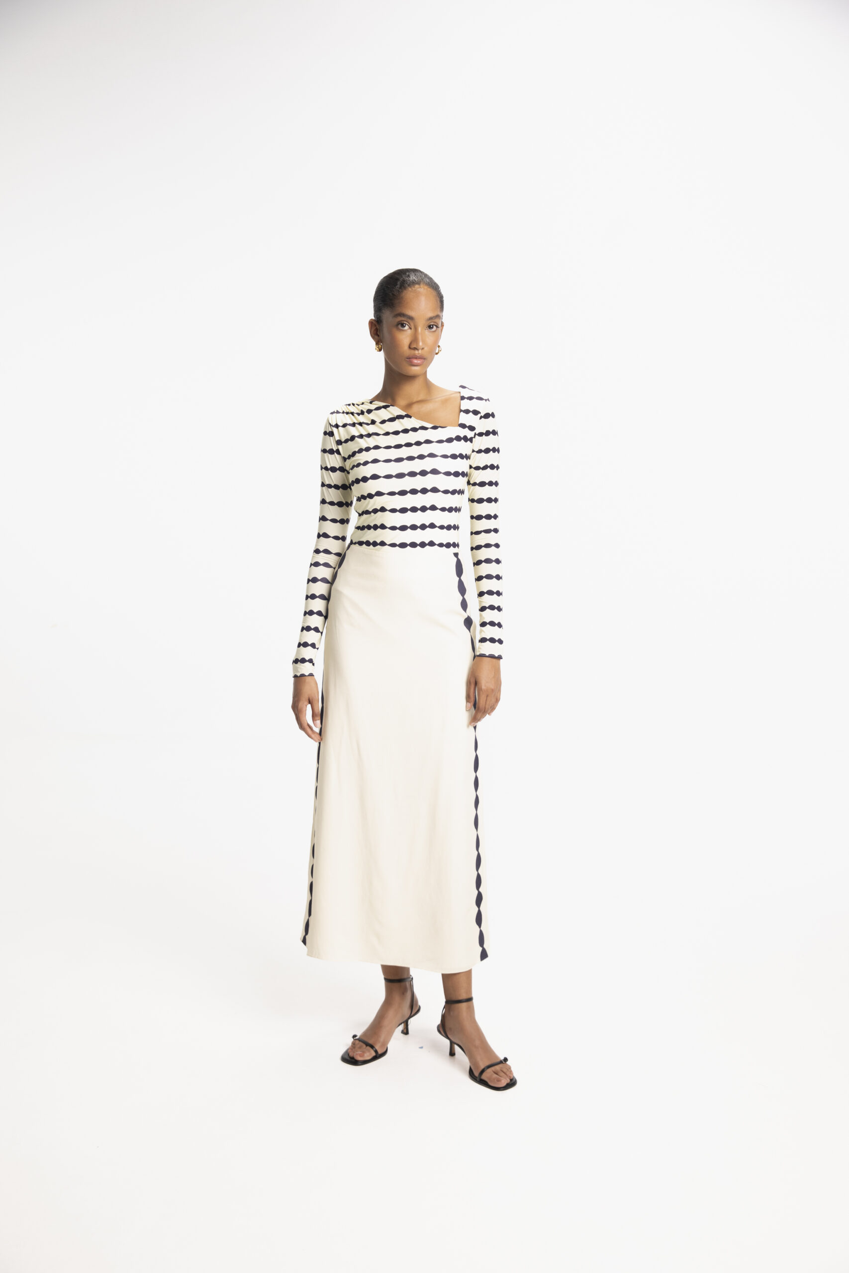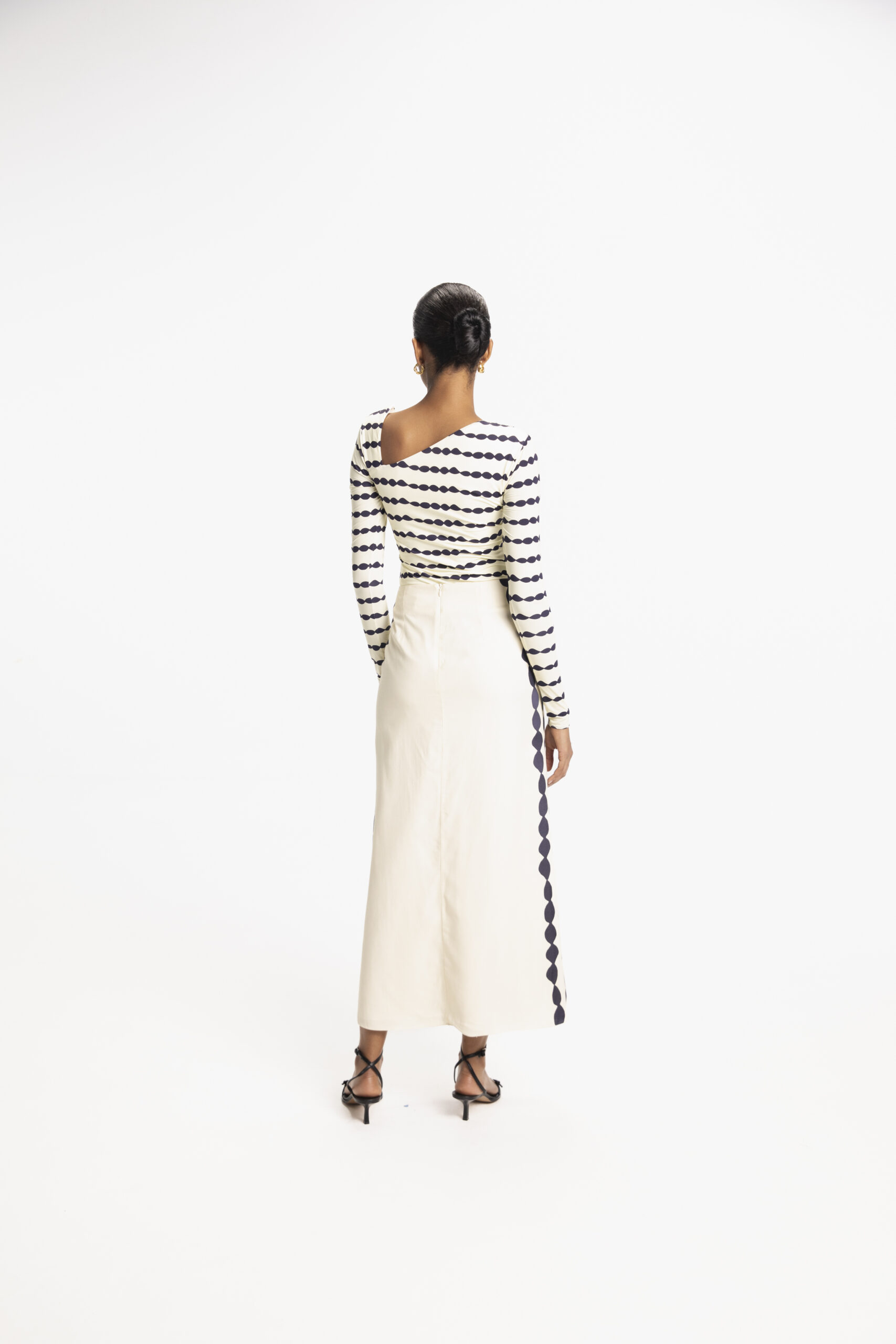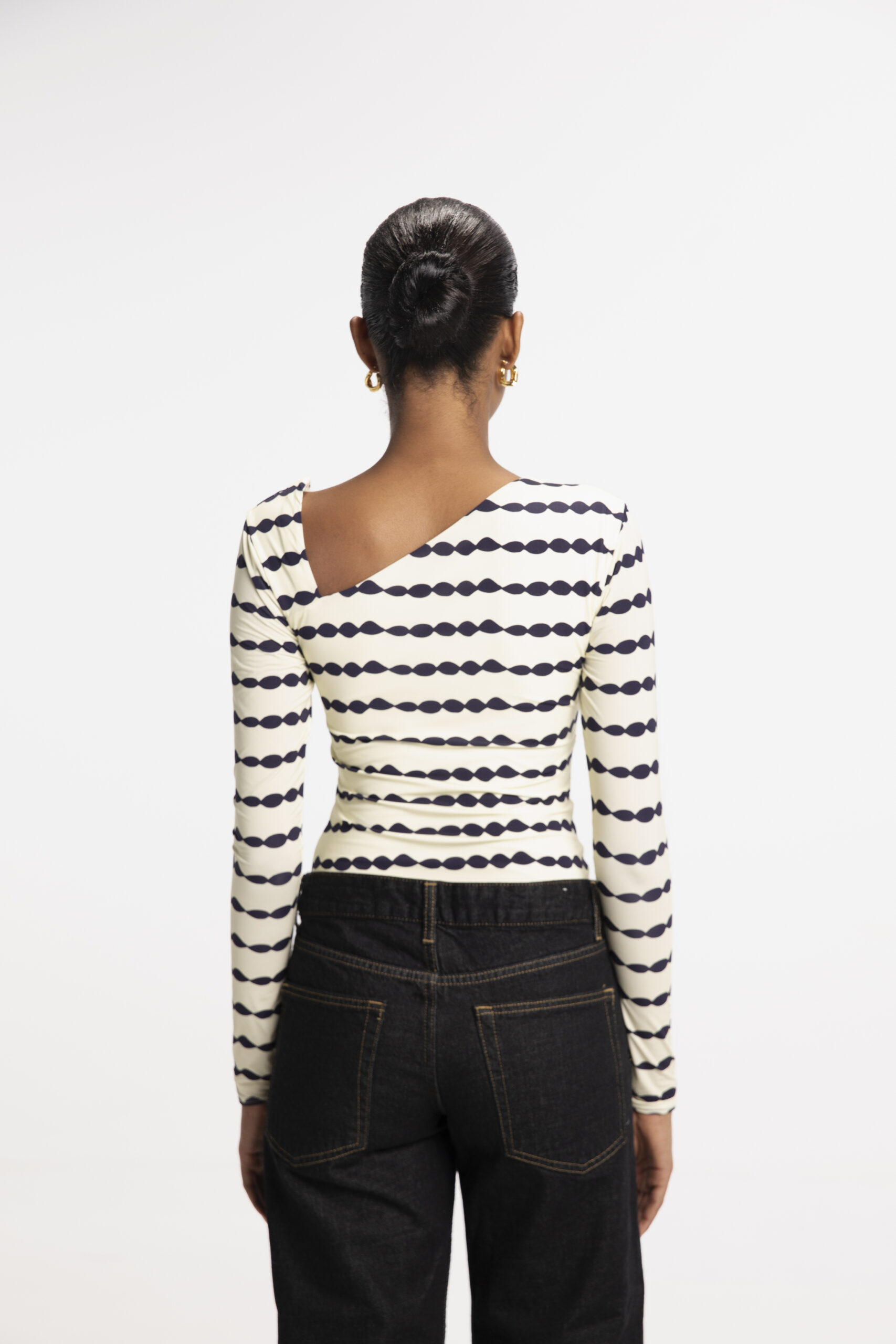 Assymetrical neckline long sleeve top. Made from 95% Polyester 5% Elastane.