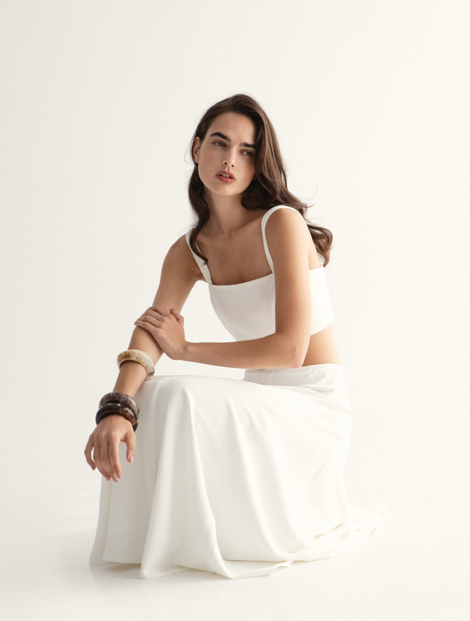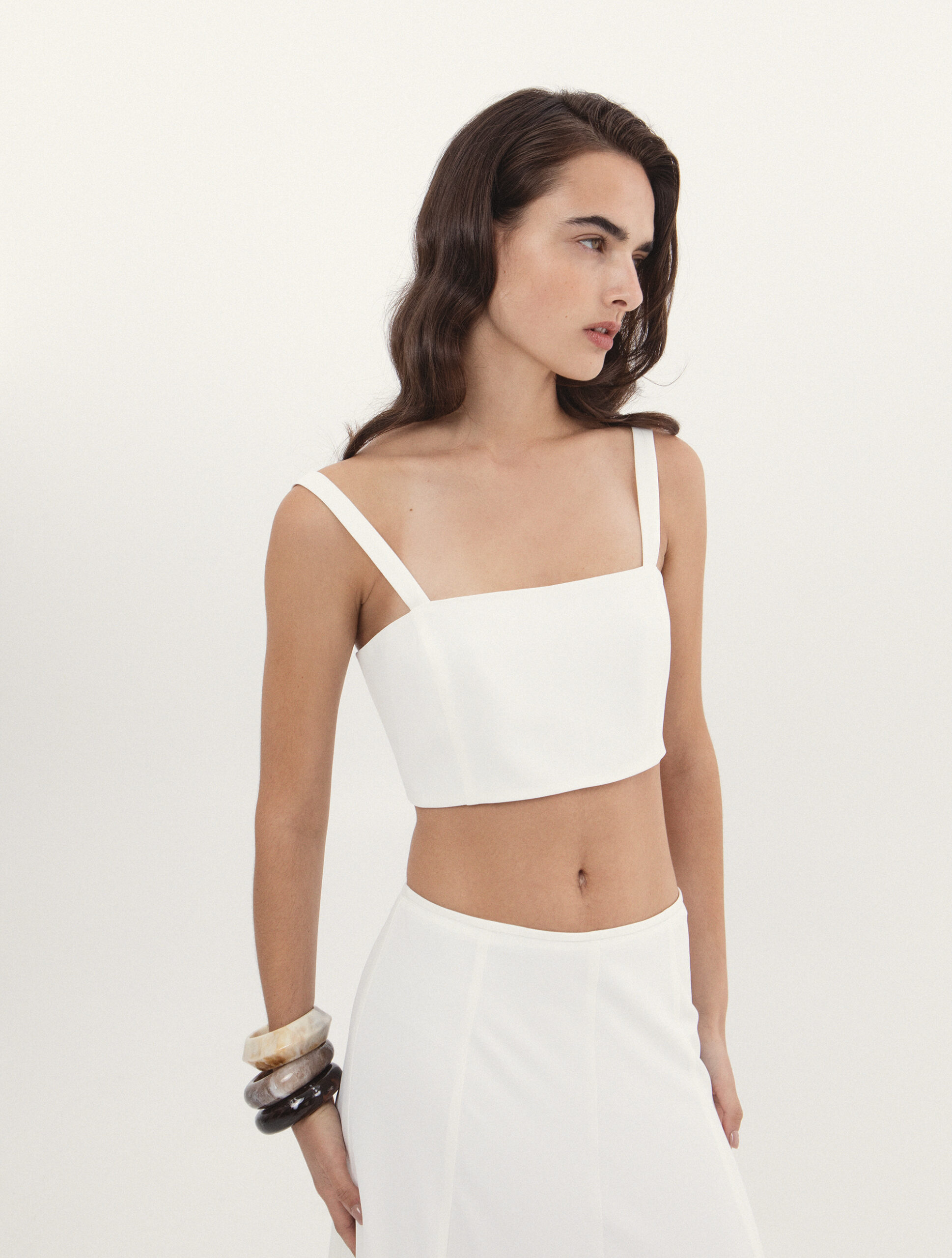 Το σύνολο αποτελείται από εφαρμοστό crop top με τιράντες και maxi φούστα με ανάλαφρη κίνηση, δημιουργώντας μια σιλουέτα που αναδεικνύει το σώμα με κομψότητα.