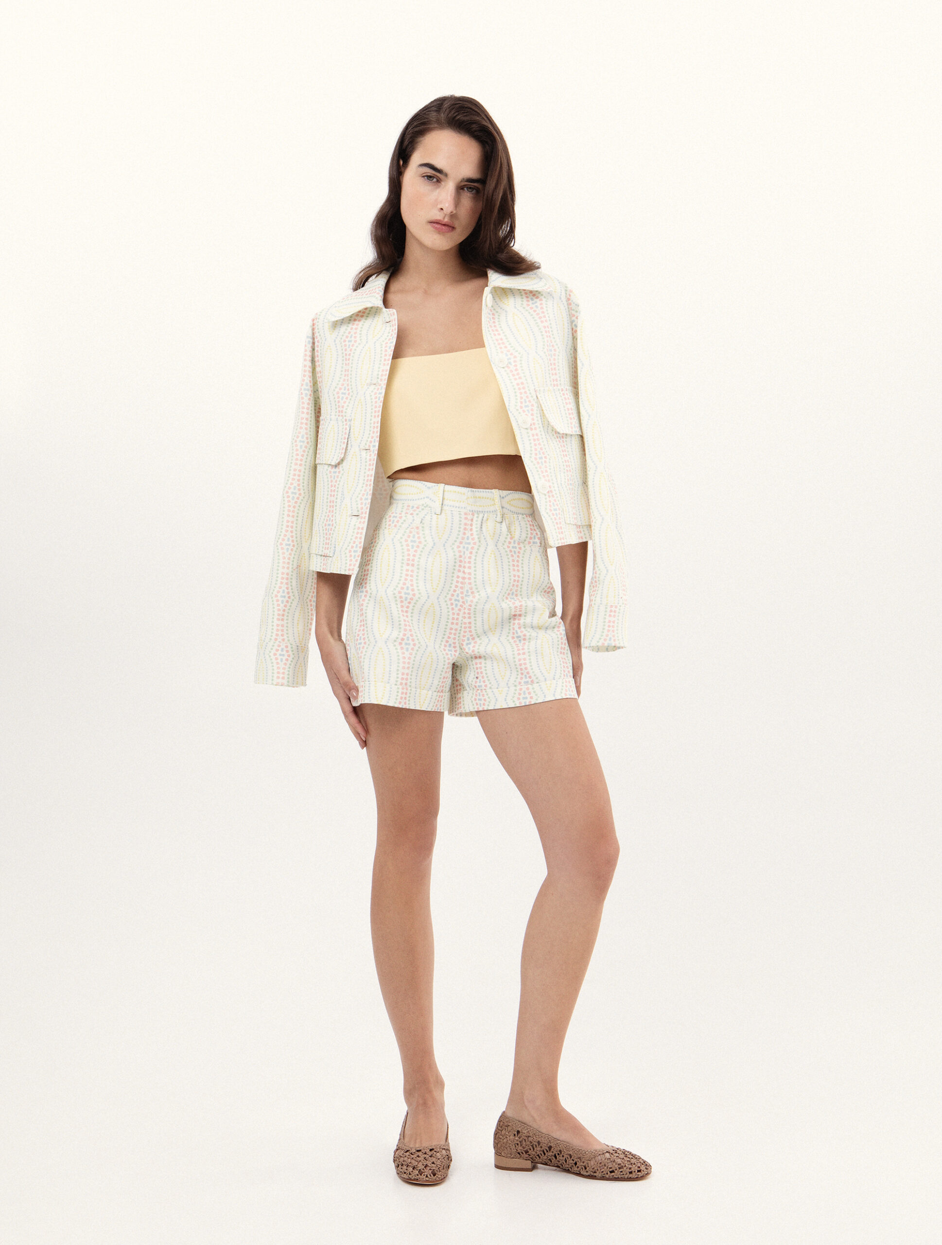Ψηλόμεσο printed σορτς με άνετη γραμμή και σταθερό ρεβέρ στο τελείωμα που χαρίζει ένα προσεγμένο και ταυτόχρονα ένα casual στυλ. Το μοναδικό μοτίβο σε παστέλ αποχρώσεις το καθιστά ιδανικό κομμάτι για τις ζεστές ημέρες. Διαθέτει θηλάκια για ζώνη και κλείσιμο μπροστά, αποτελώντας το τέλειο match για το αντίστοιχο cropped τζάκετ.