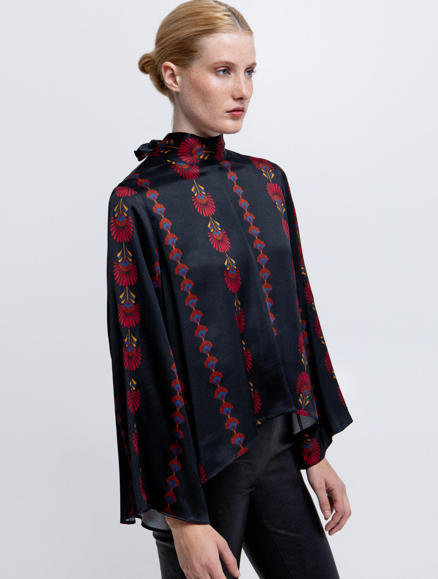 Striking red floral embroidery covers the chest, cuffs and button placket, while snap buttons underline its Western reference. The contrast feels bold yet crafted.