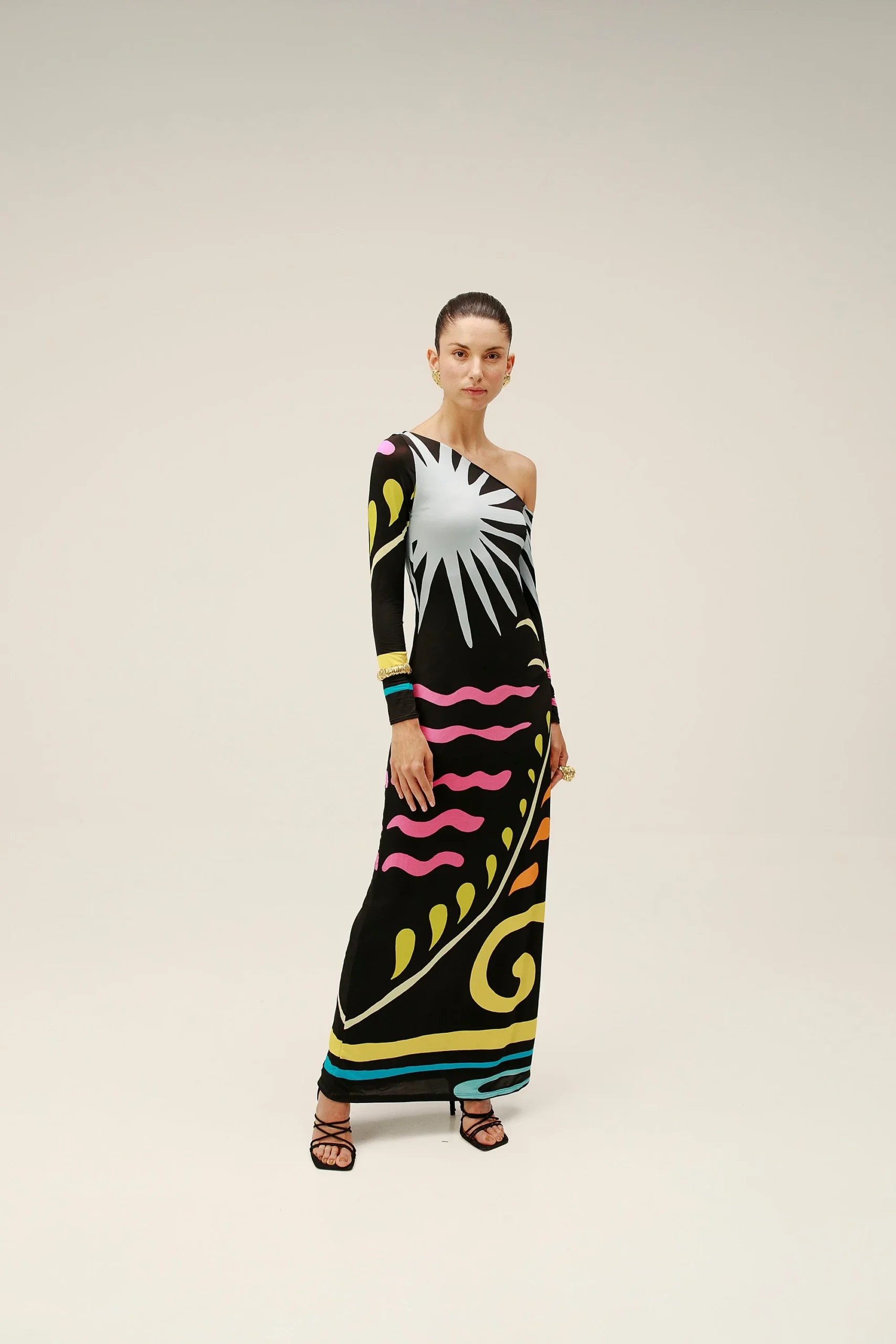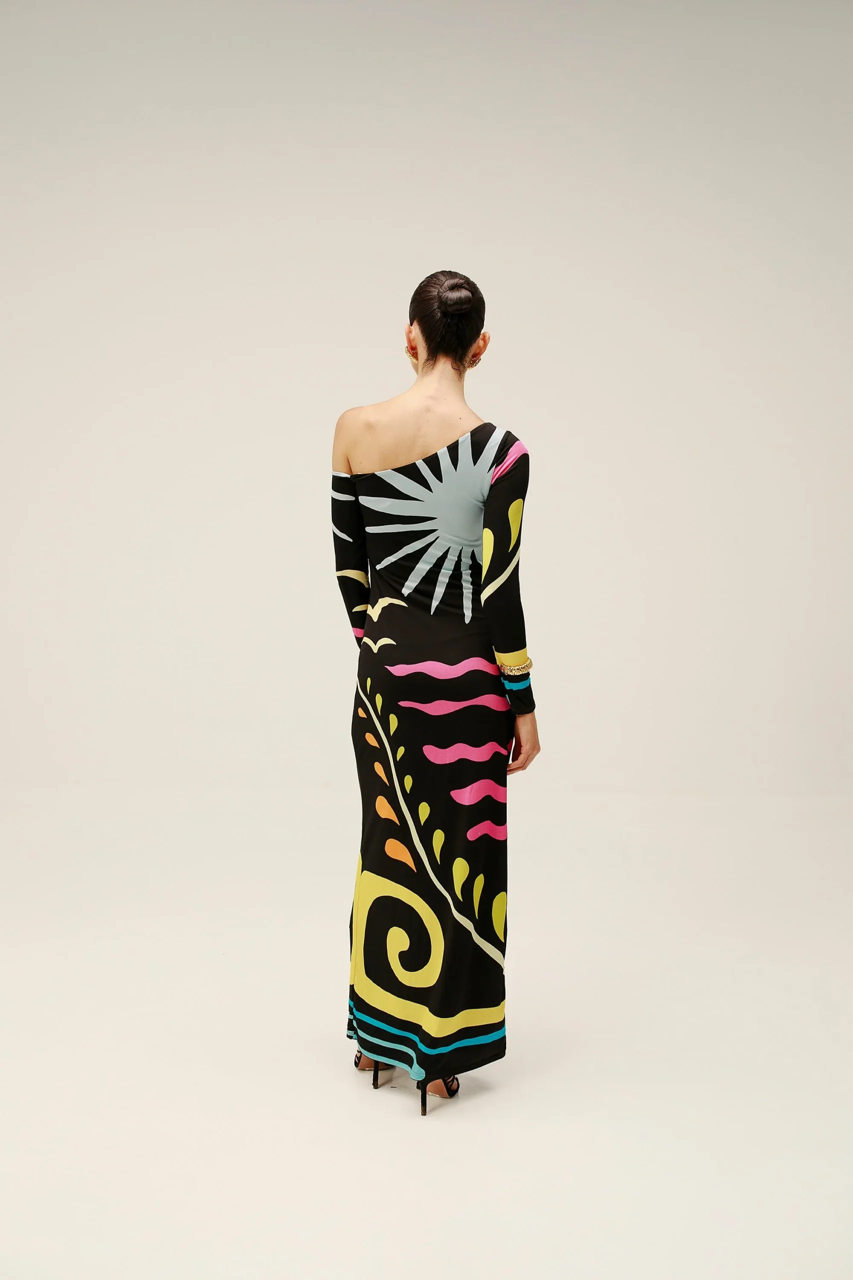 Long dress with an asymmetric neckline and long sleeve. Fully lined. Made from 90% viscose 10% elastane.