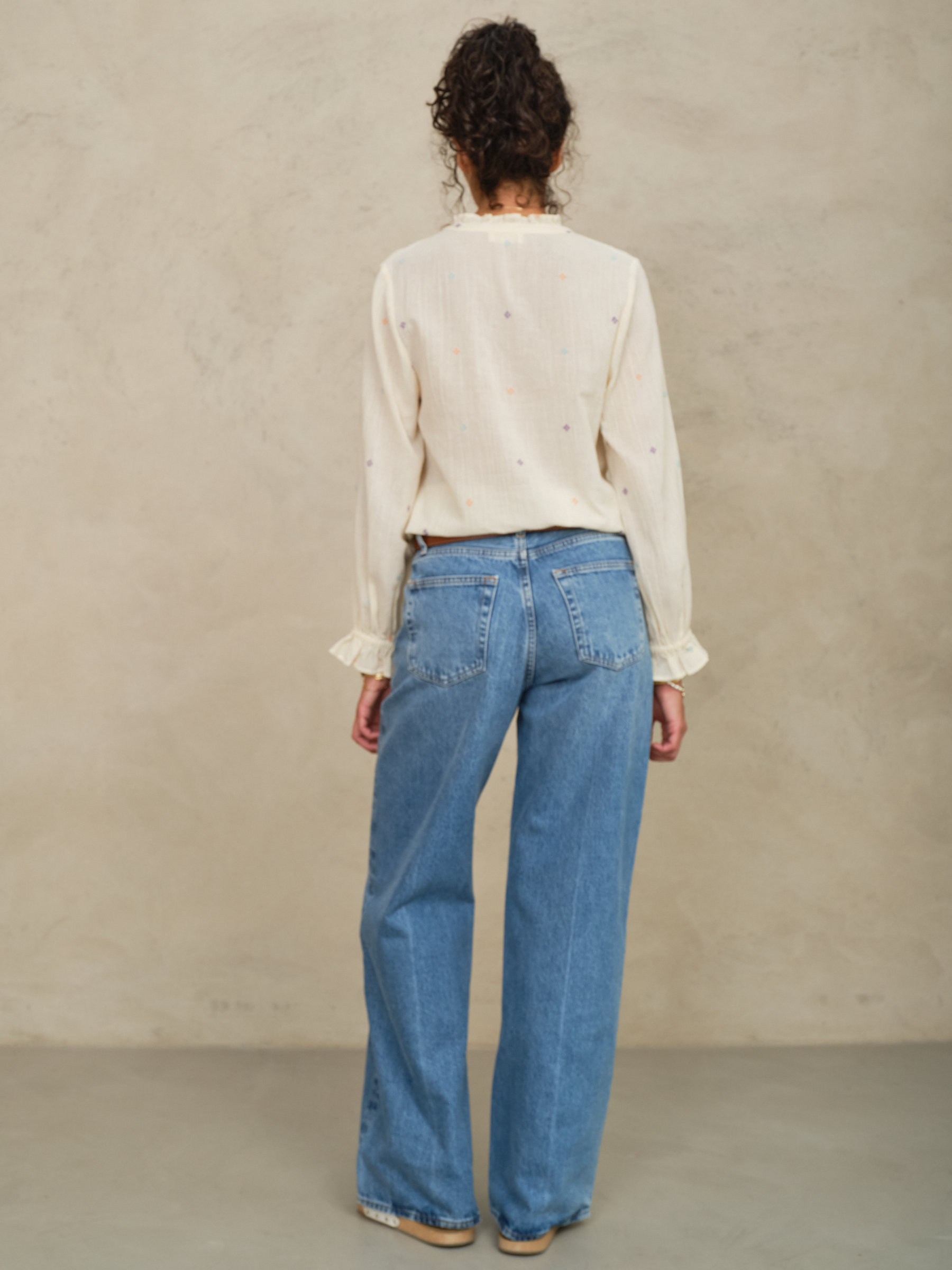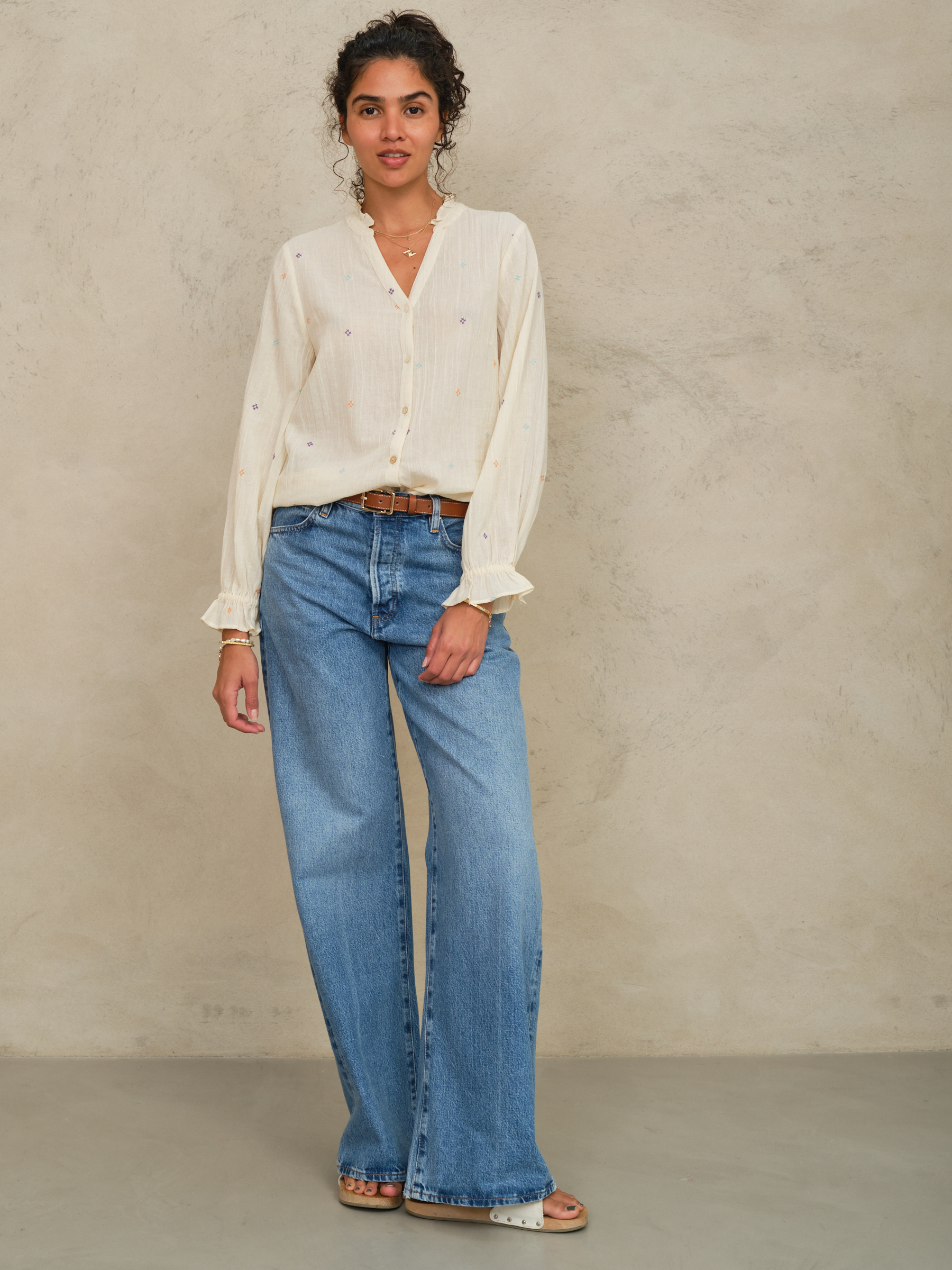 Designed with embroidered geometric motifs the Lucca top is made from textured cotton. It is detailed with a frill collar and sleeves and cut in an easy to wear and relaxed fit.