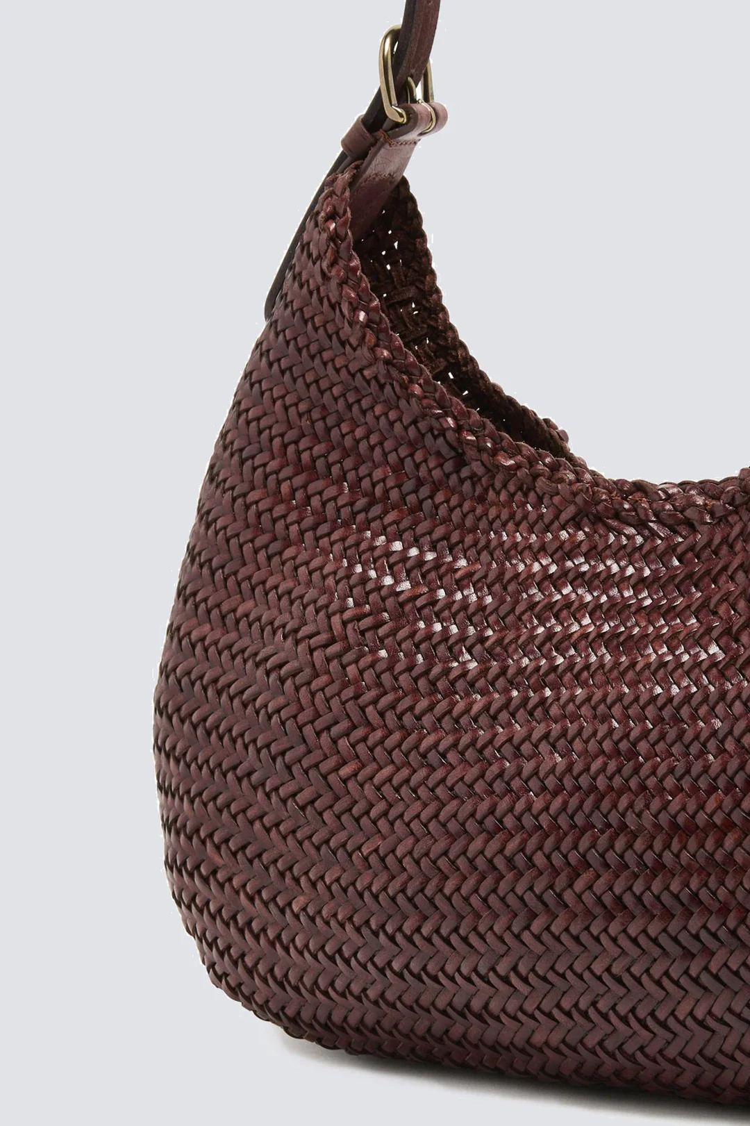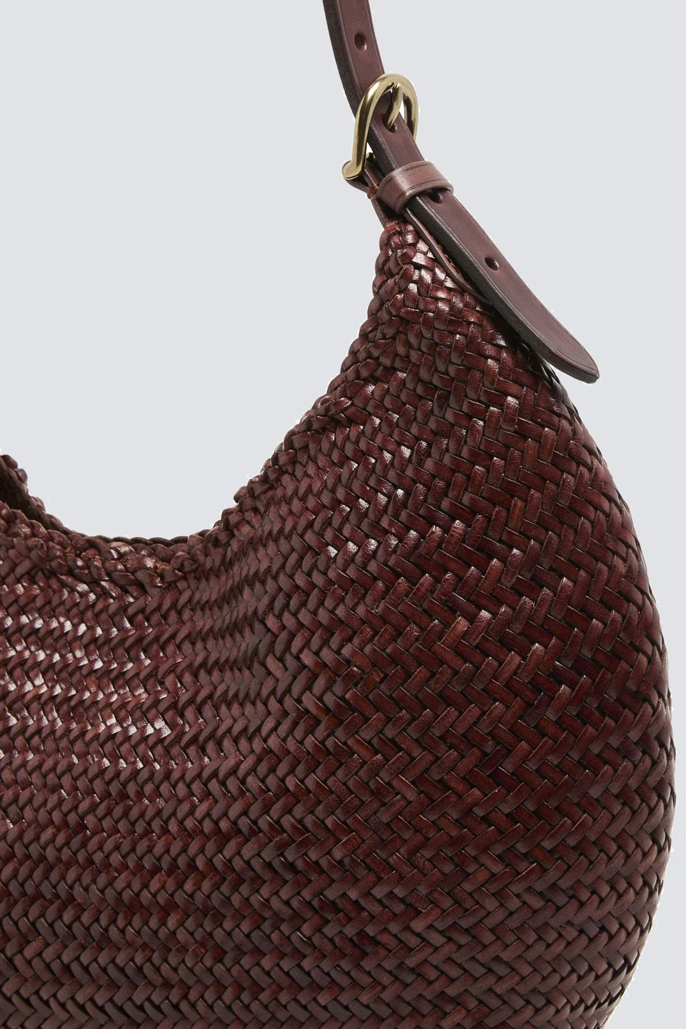 The "Luna Mezza" mirrors the unique round and supple design of its larger counterpart, the Luna Piena, crafted from Buff Calf leather straps. This medium-sized tote balances space and portability, featuring an adjustable flat leather strap for comfortable shoulder wear. Its distinctive round shape makes it a stylish choice for those seeking a practical yet eye-catching accessory.