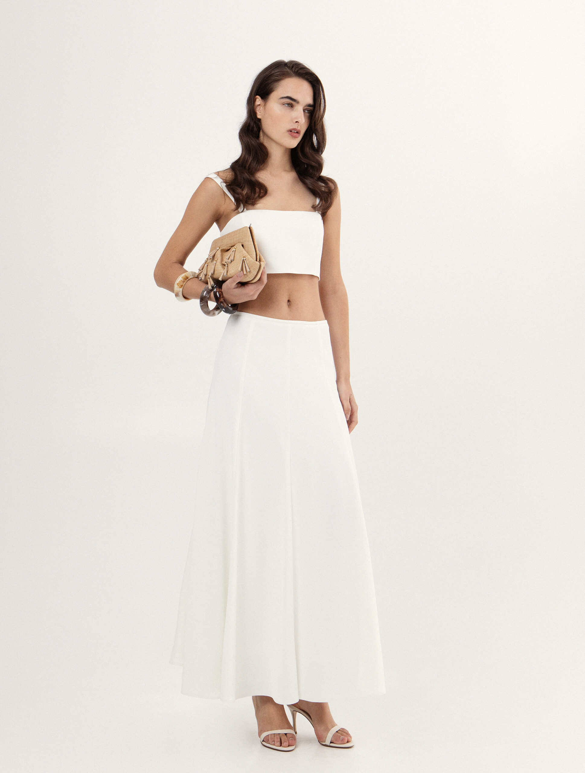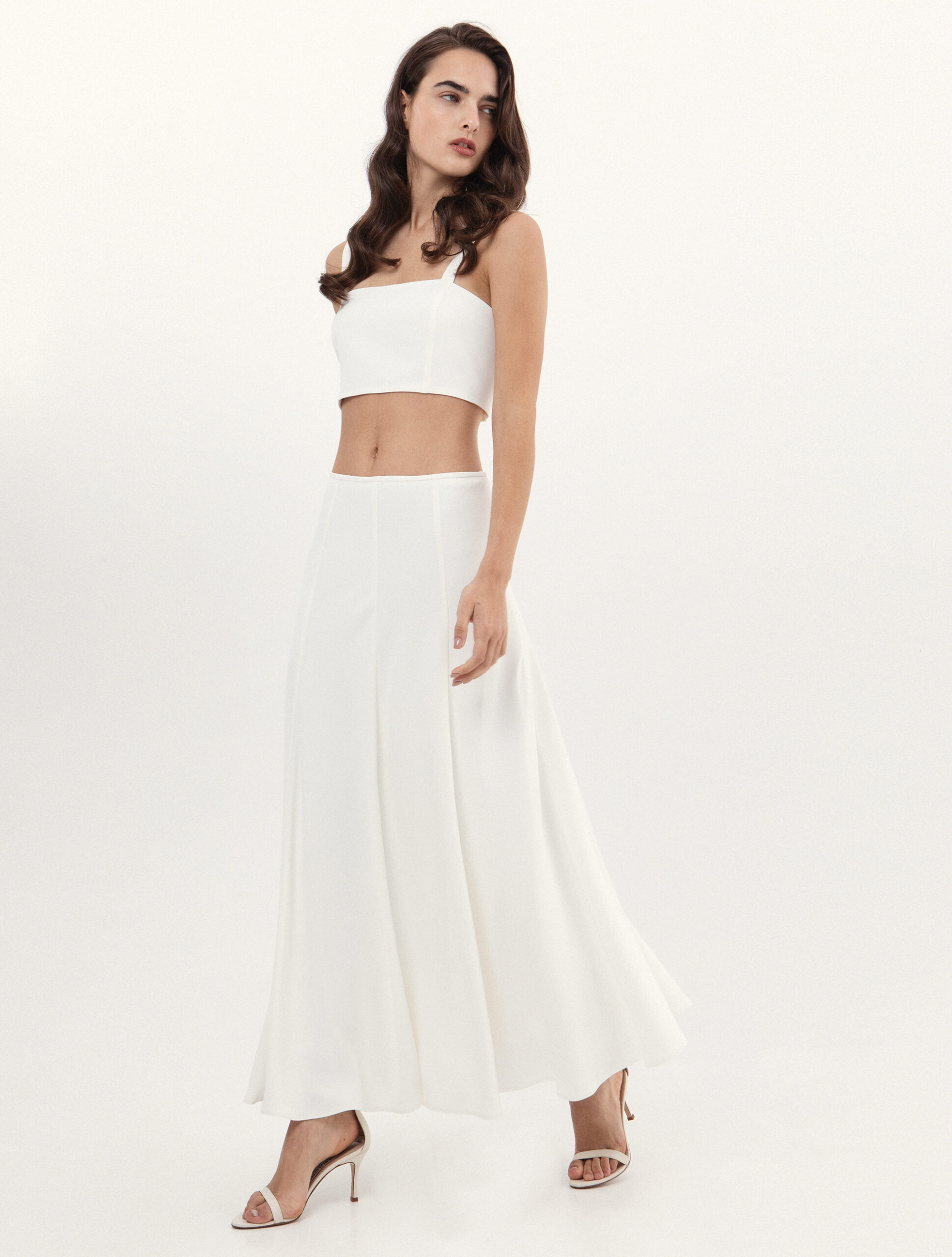 Το σύνολο αποτελείται από εφαρμοστό crop top με τιράντες και maxi φούστα με ανάλαφρη κίνηση, δημιουργώντας μια σιλουέτα που αναδεικνύει το σώμα με κομψότητα.