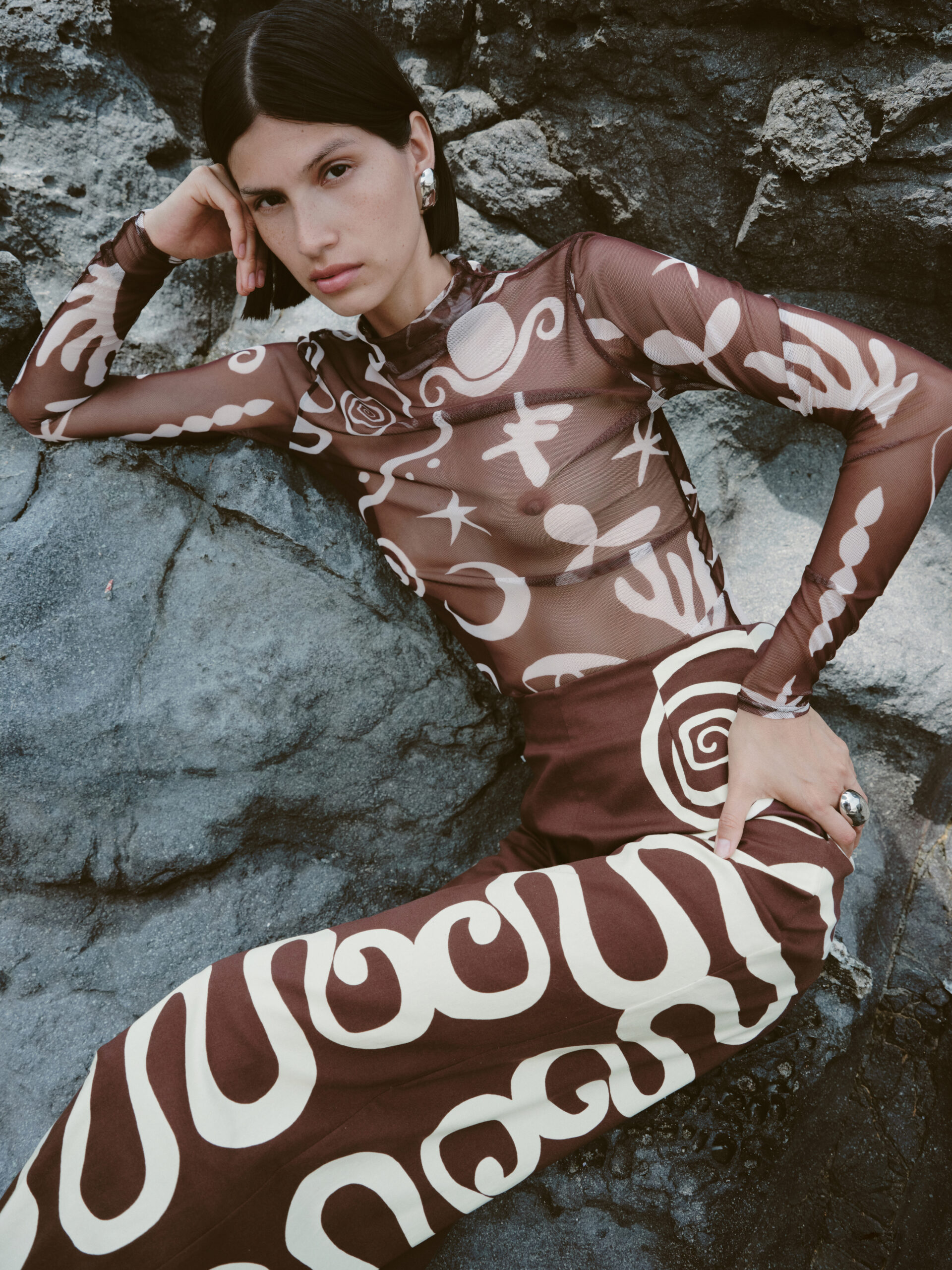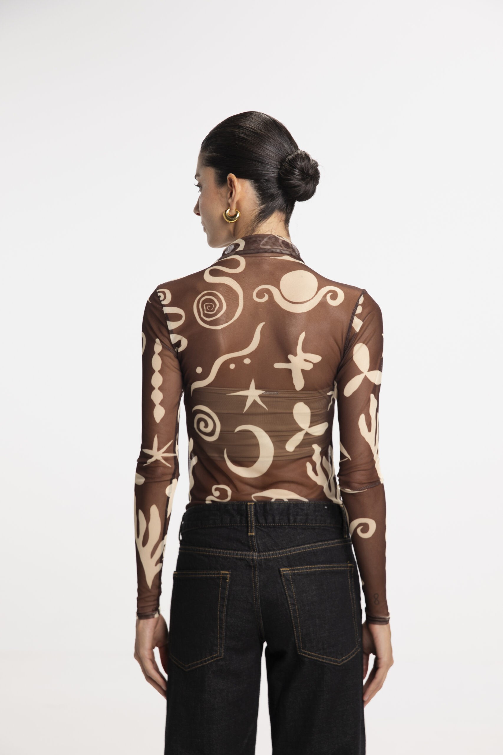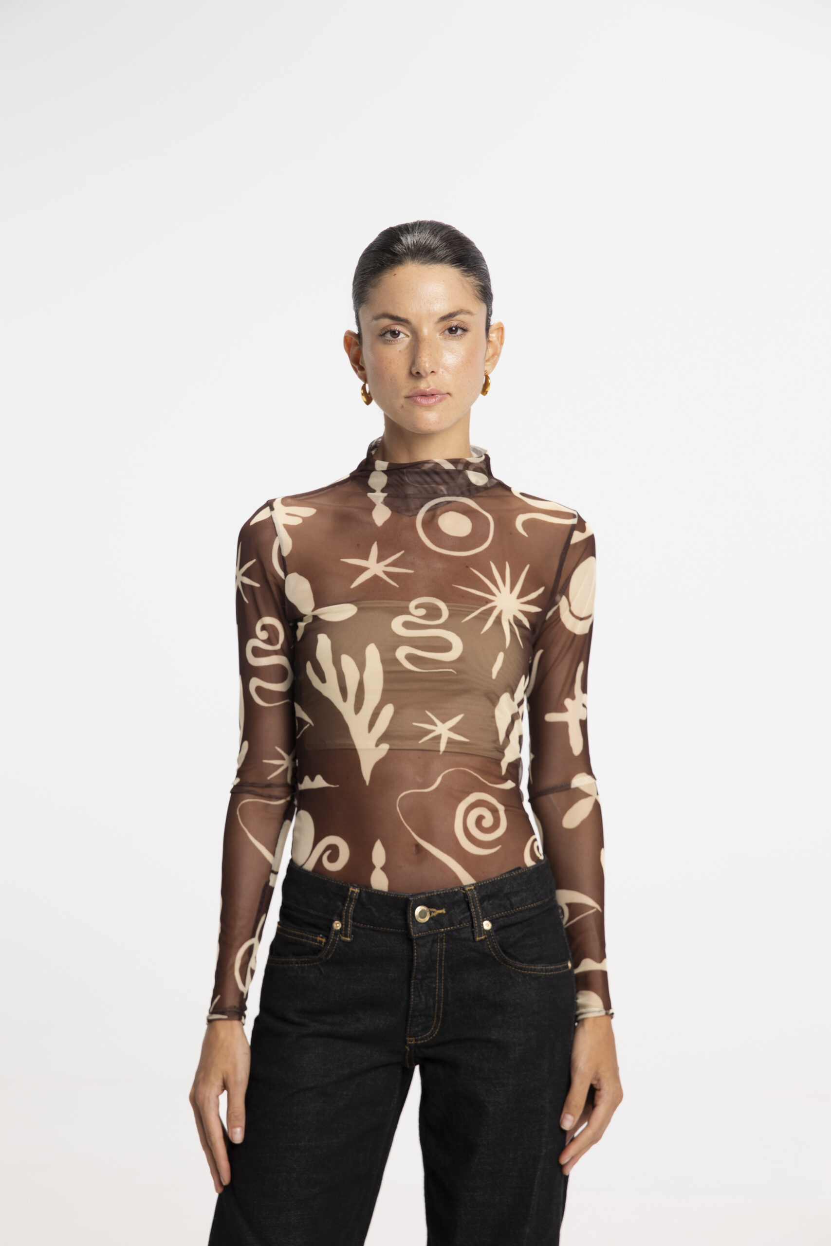 Sheer long sleeve turtleneck top. Made from 50% Recycled Polyester 44% Polyester 6% Elastane.