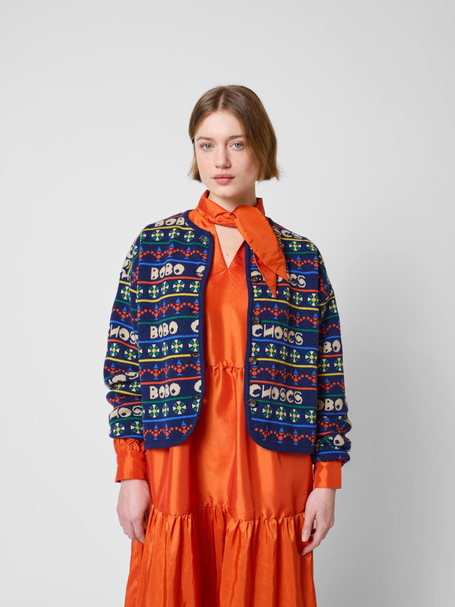 5% Recycled Cashmere, 35% Recycled Polyamide, 30% Recycled Viscose, 30% Recycled Wool Multicolor cardigan. Designed with designed for a relaxed fit and stretchy fabric. Fits true to size, take your normal size. Made in Spain.