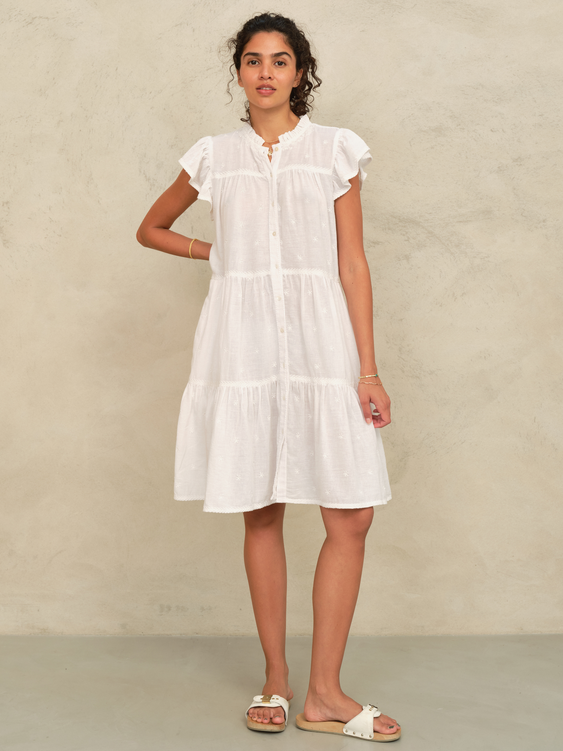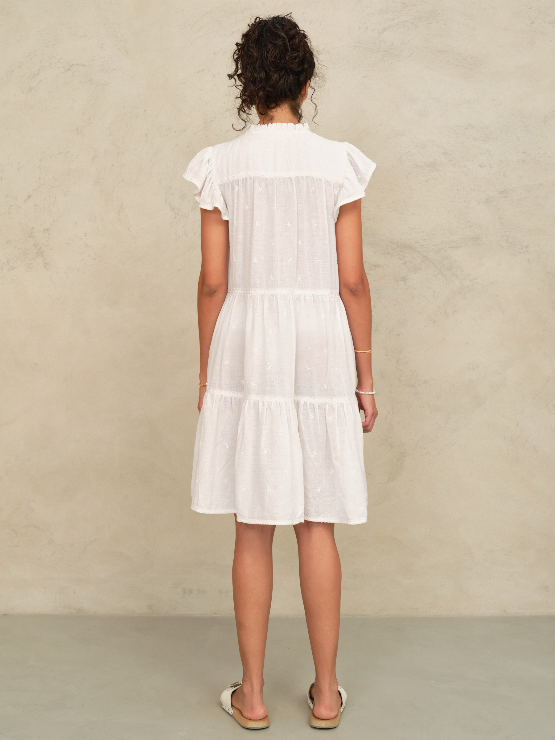 Made from cotton the Navi sundress is detailed with tonal floral and boarder embroidery. Designed in a tiered breezy silhouette for a free and easy fit it is finished with frill collar and sleeves.