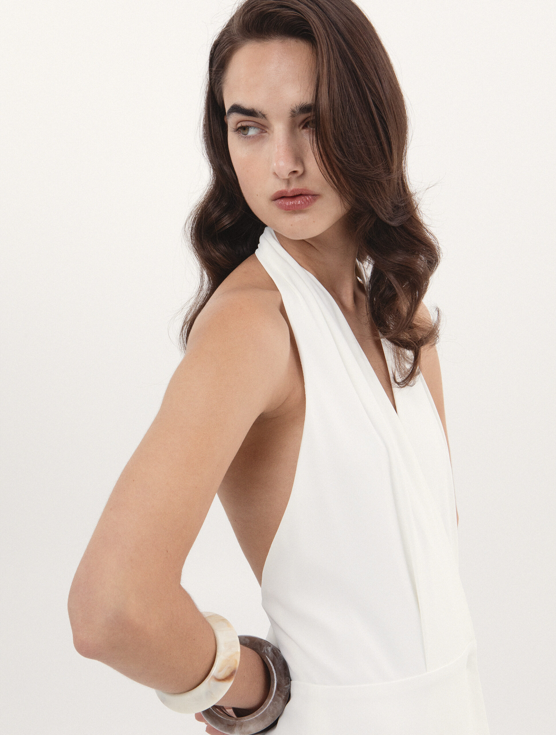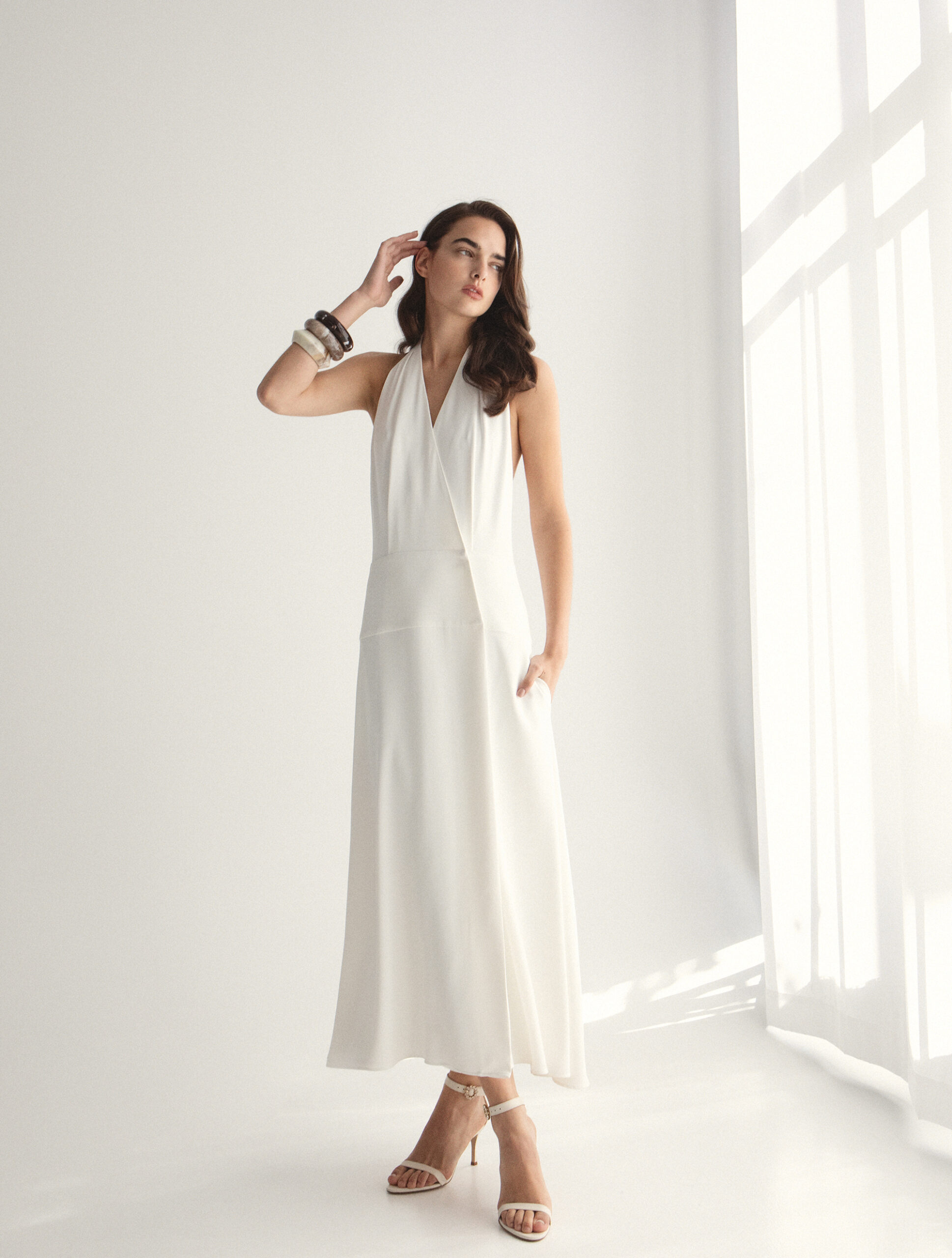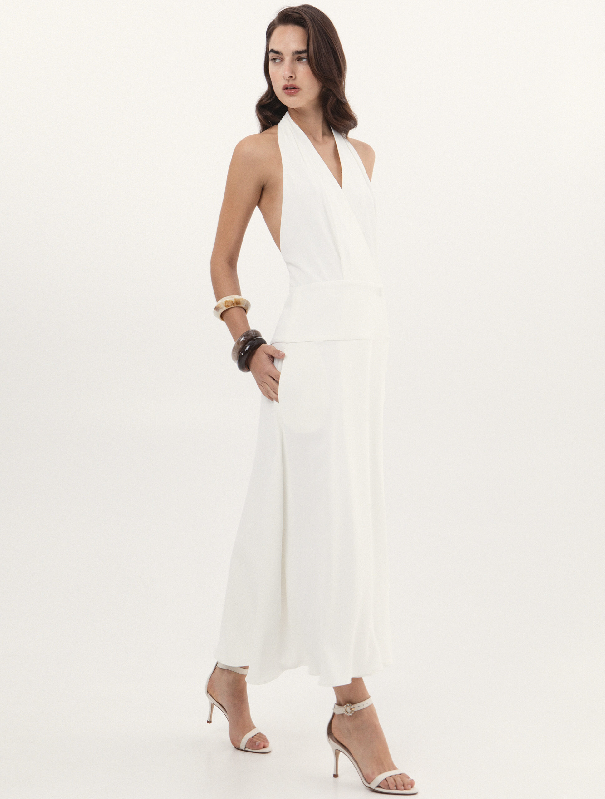Αέρινο και κομψό φόρεμα, διαθέτει hatler λαιμόκοψη που αναδεικνύει τους ώμους, ενώ η ανοιχτή πλάτη με διακριτική λεπτομέρεια προσθέτει μια εκλεπτυσμένη και σύγχρονη λεπτομέρεια στο σύνολο.