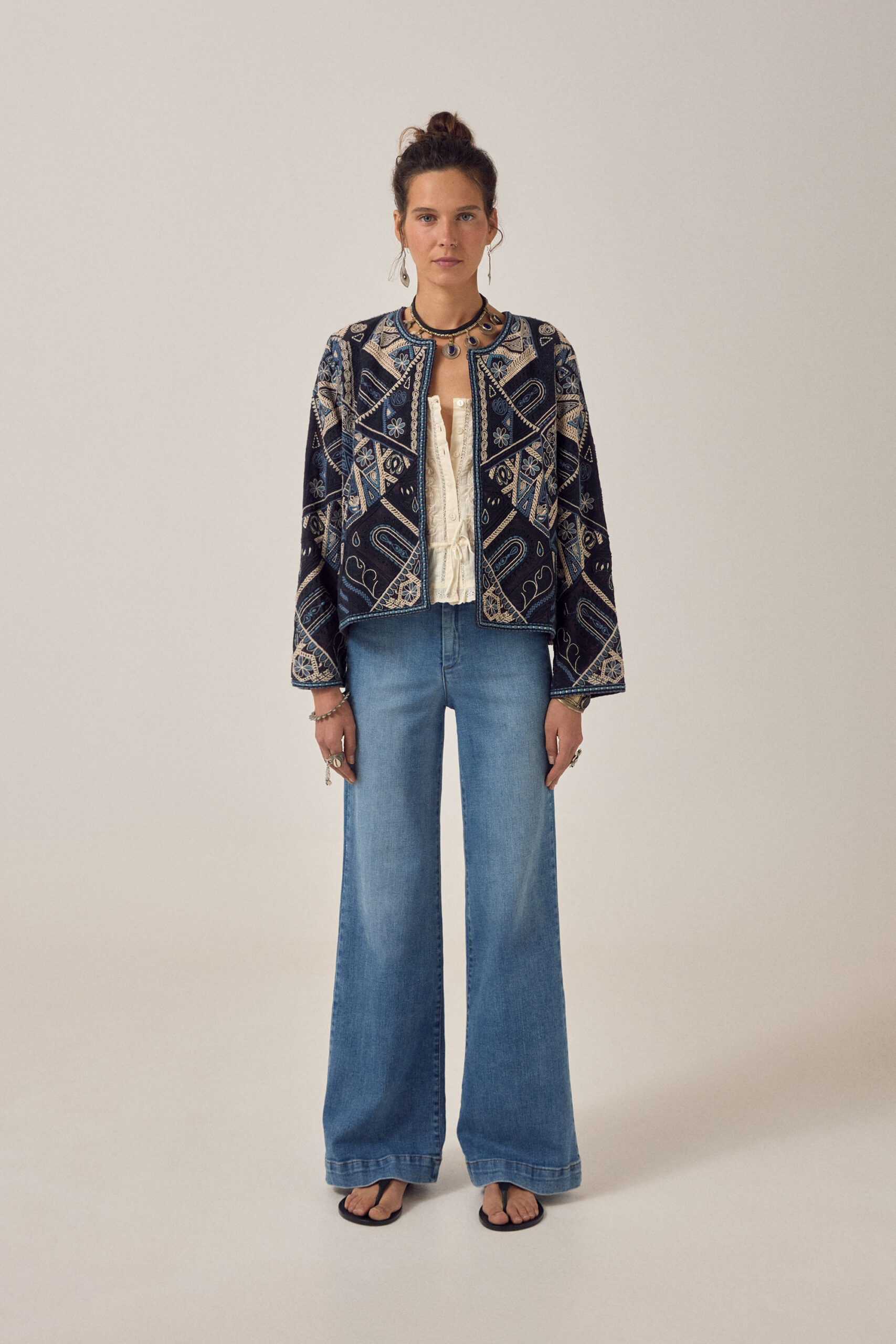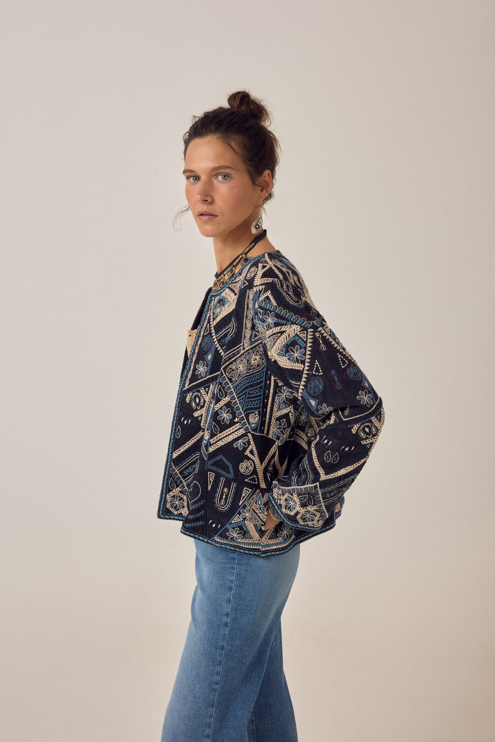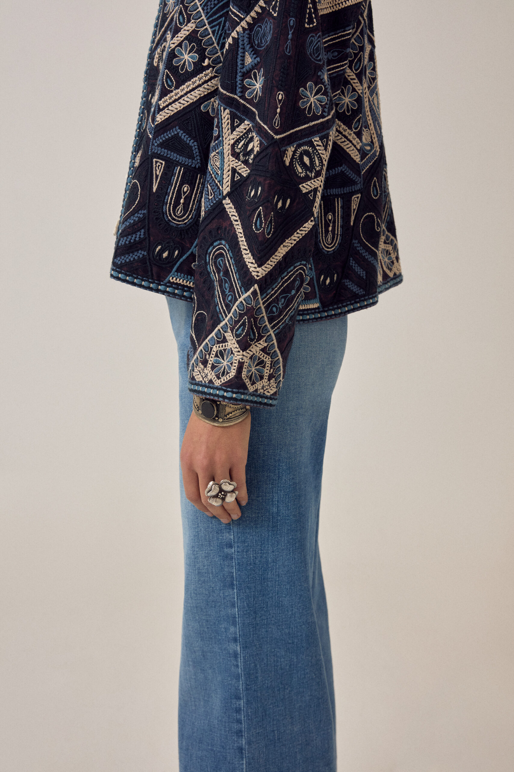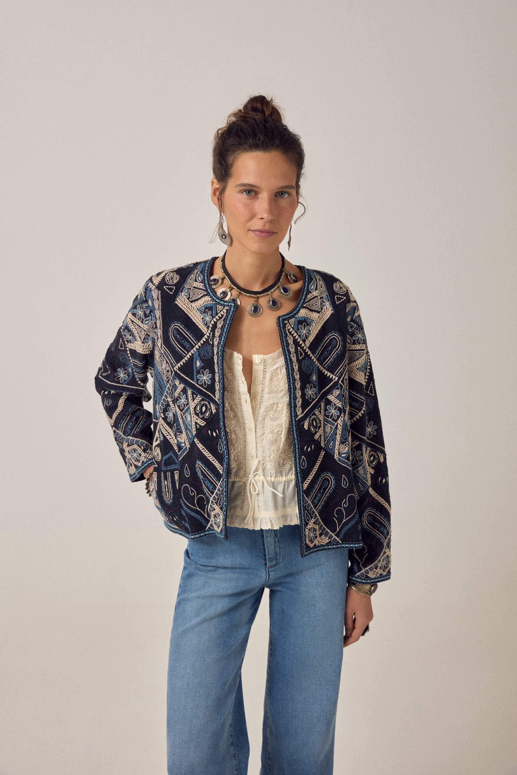 Cropped open-front jacket in deep indigo, fully embroidered in ivory, soft teal, and washed ink. The coverage is total — geometric panels, floral motifs, chain-stitch borders — all hand-worked across every surface. No base fabric showing through. The palette stays tonal and muted, nothing bright.
