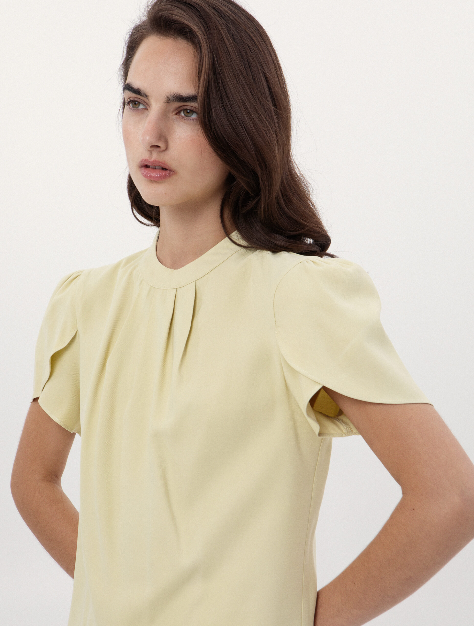 Κομψή μπλούζα που διαθέτει εντυπωσιακές πιέτες στη λαιμόκοψη, που δημιουργούν μια όμορφη πτύχωση, ενώ τα κοντά μανίκια τύπου πέταλο προσθέτουν μια μοντέρνα και ανάλαφρη νότα. Κατασκευασμένο από ύφασμα με απαλή υφή και χυτή εφαρμογή.