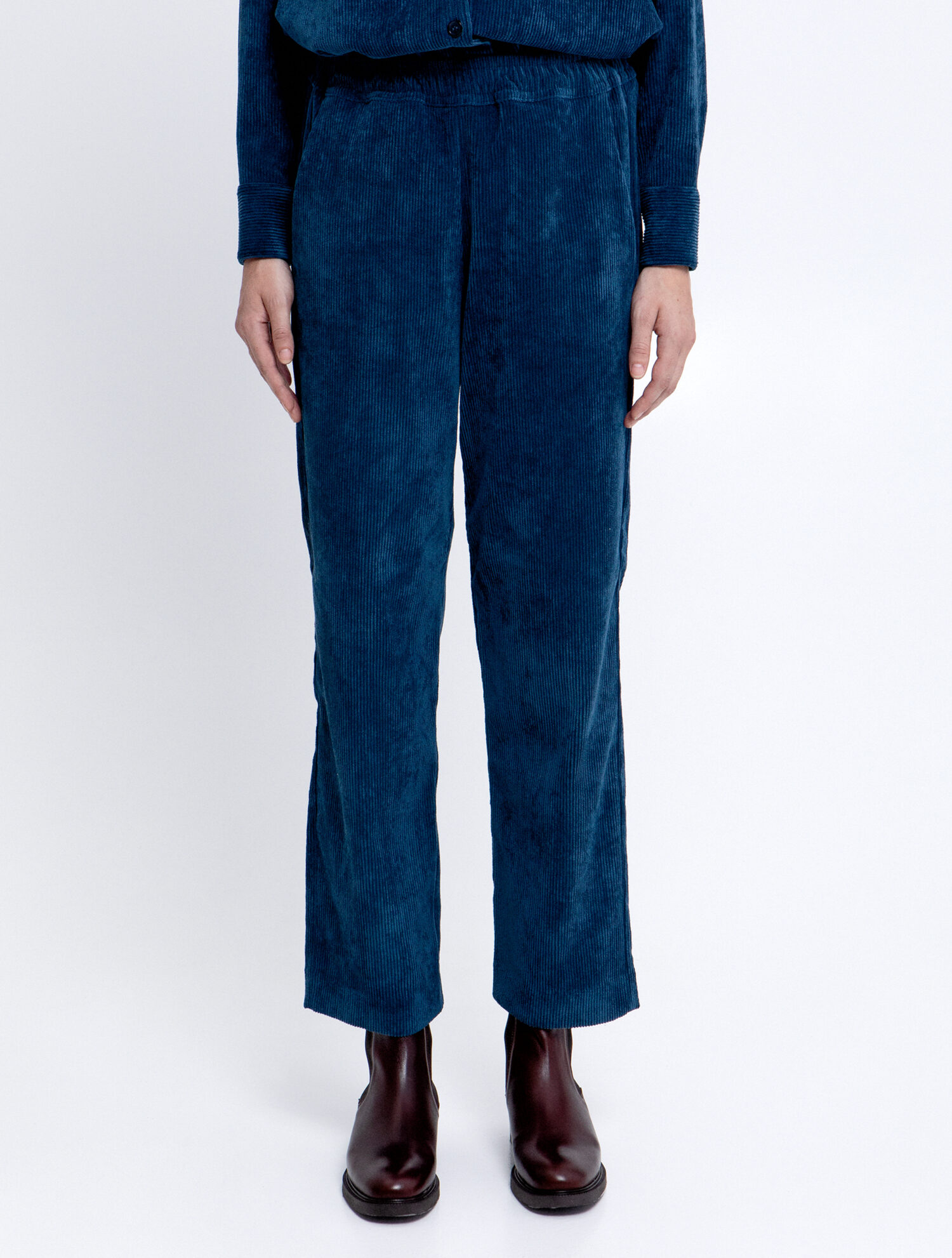 Mid-waist trousers with a loose fit and flared leg. Elasticated waistband. Slits at the cuffs. Fully lined.
