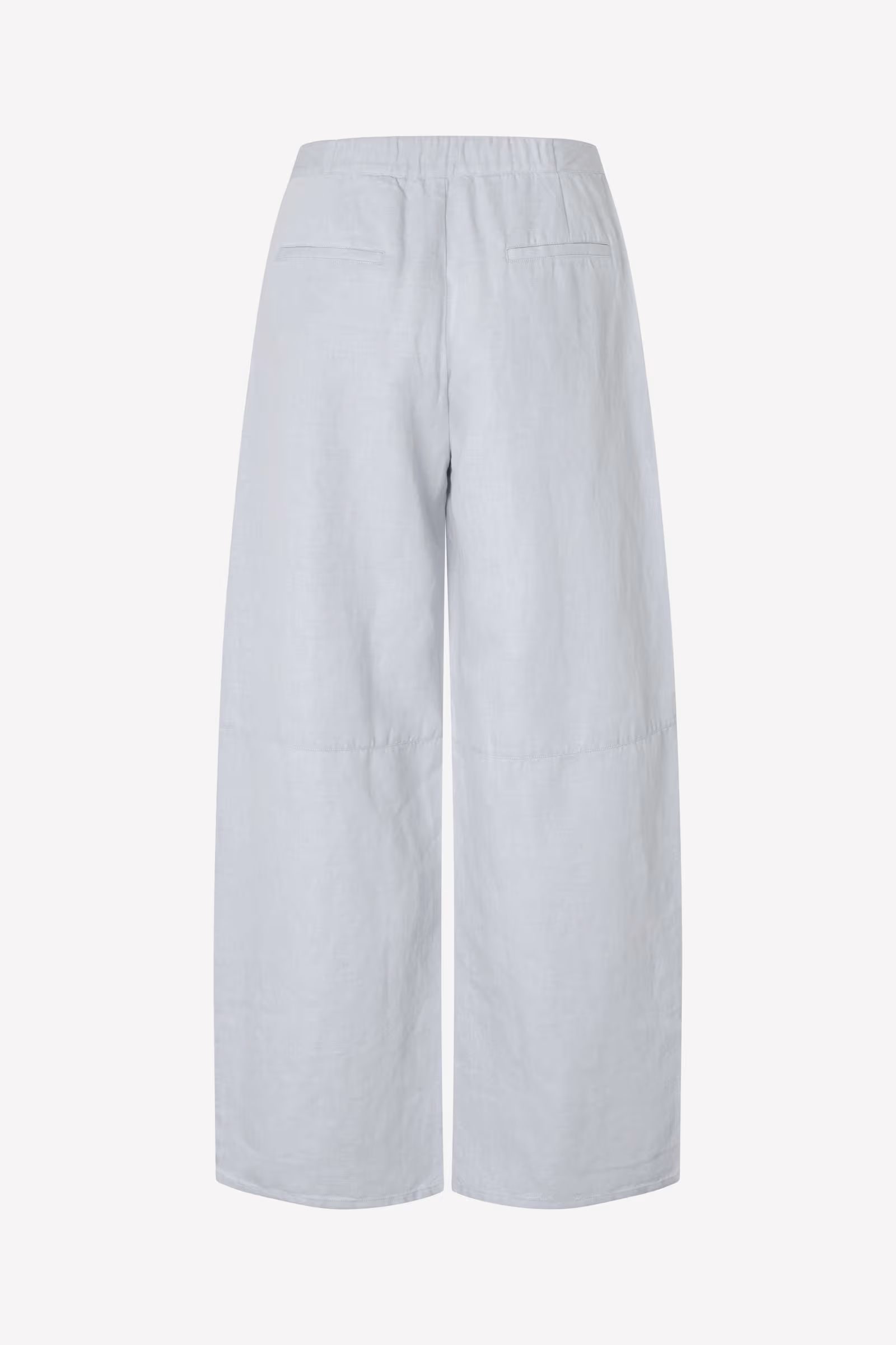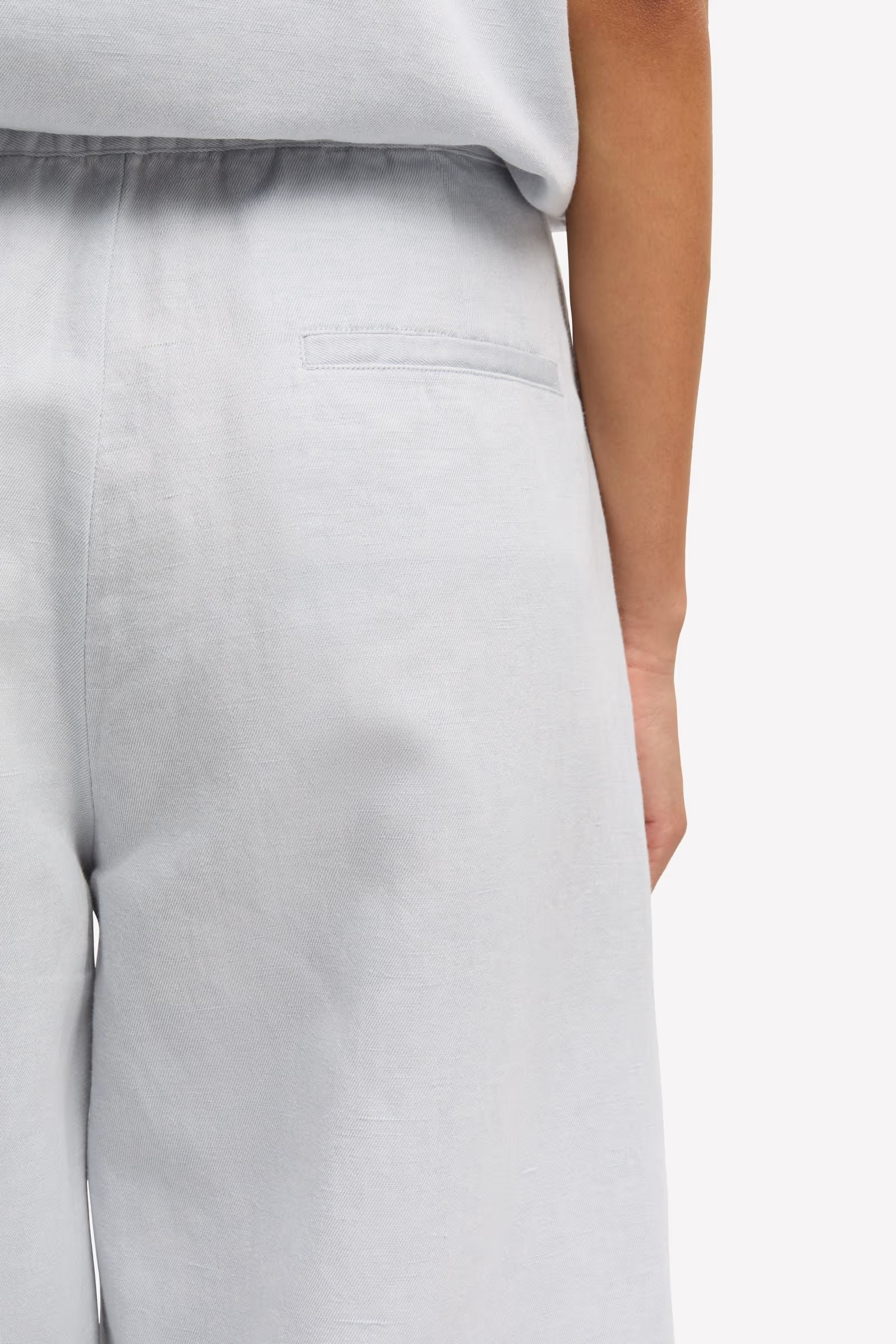 Trousers with a loose fit and wide leg. Hidden hook and zipper closure at the fly. Welt pockets on the back. Main material made from a blend of organic cotton and linen.