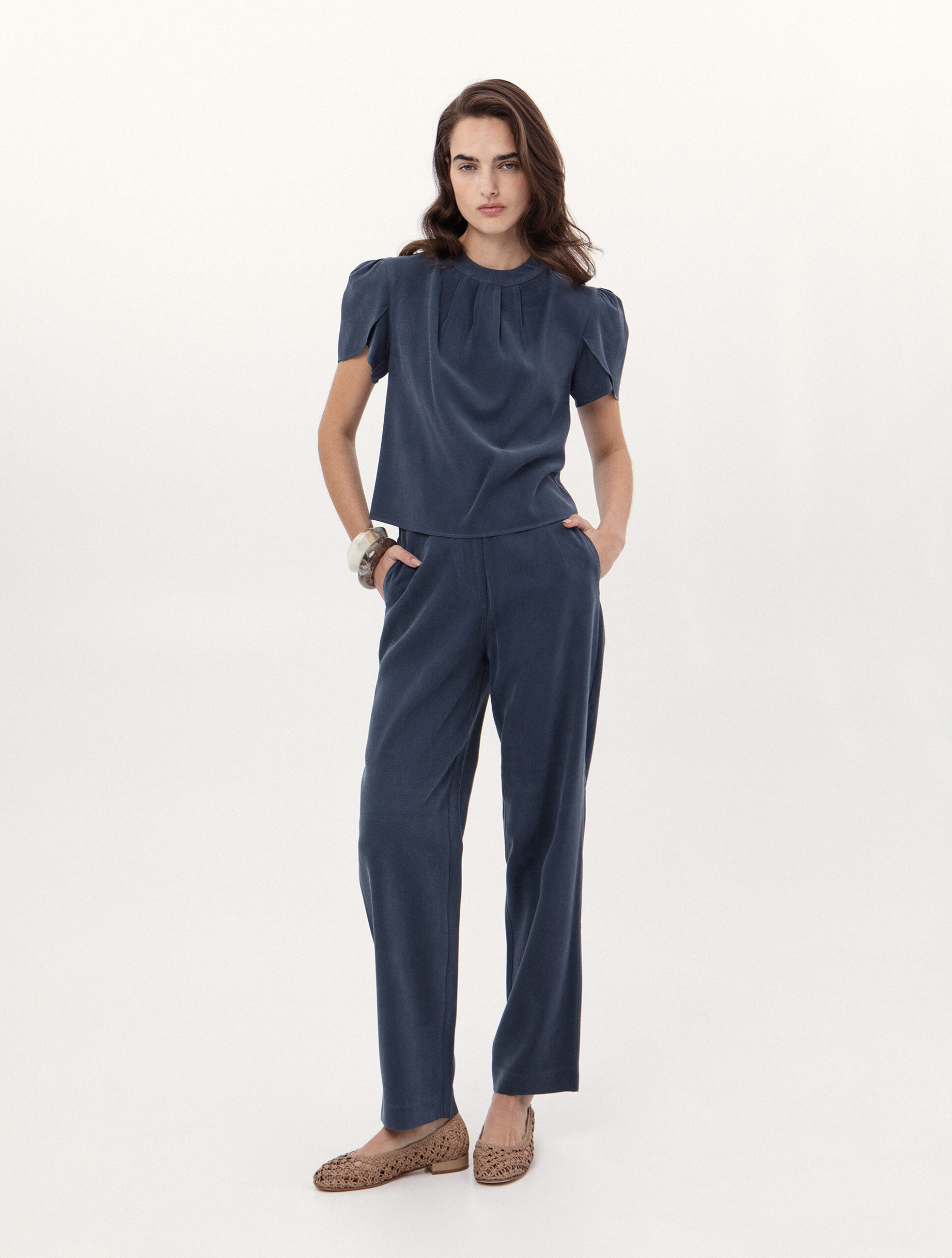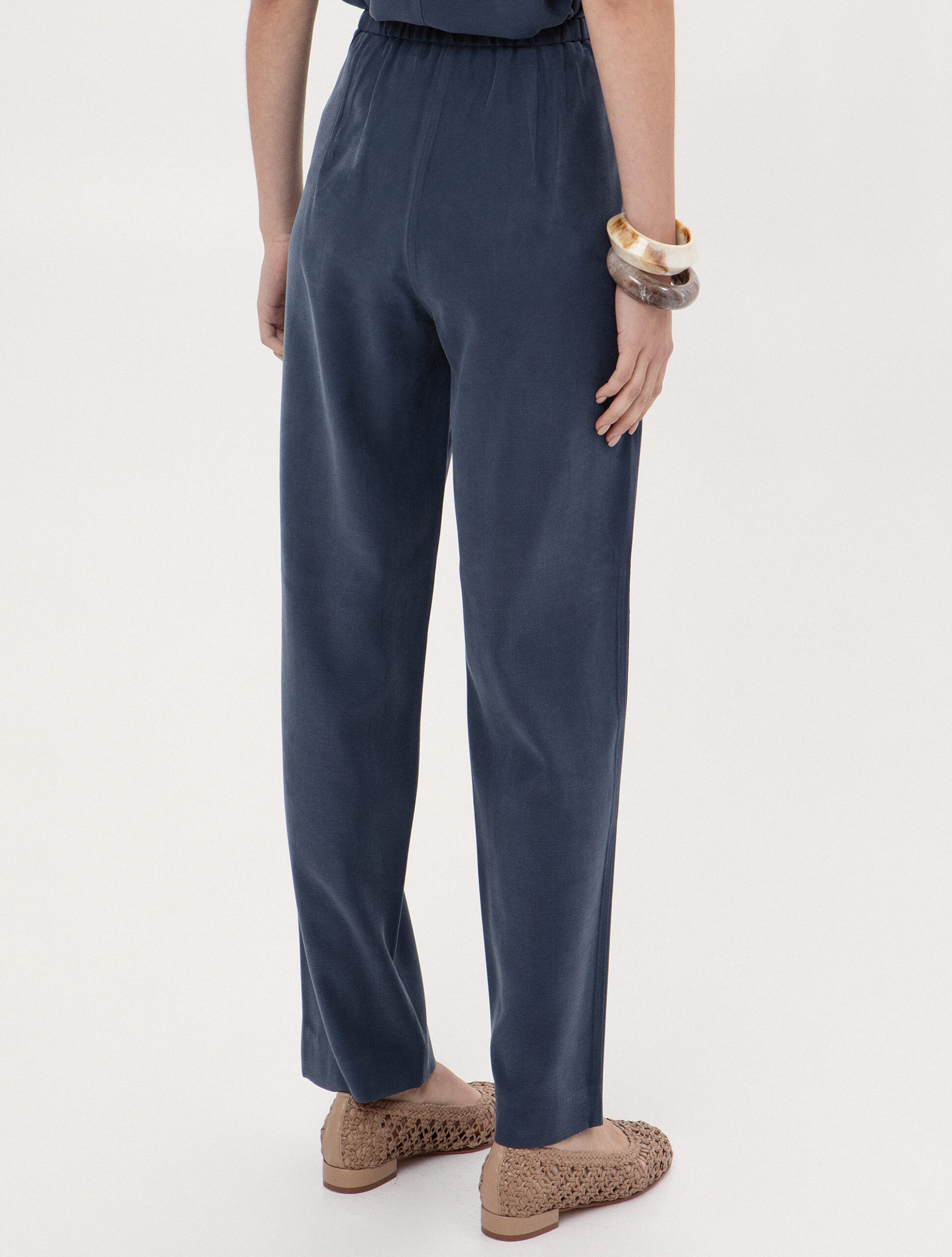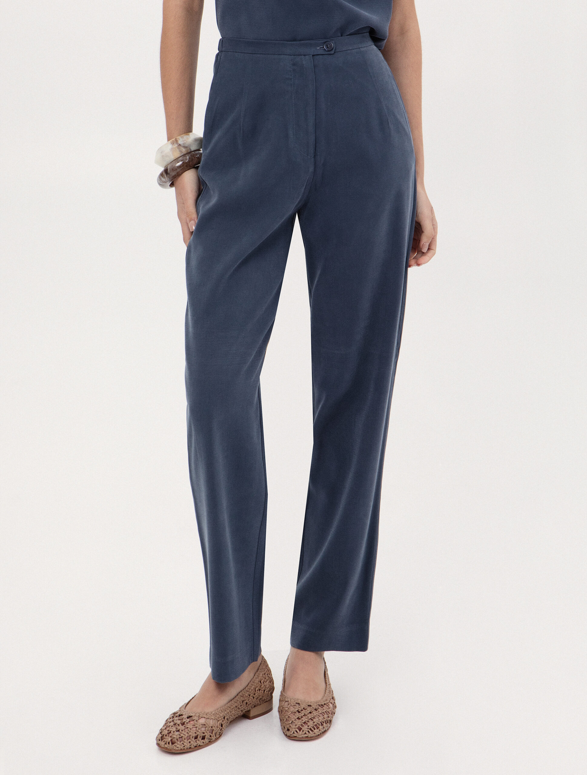 Ψηλόμεσο παντελόνι σε ίσια γραμμή. Διαθέτει πλαϊνές τσέπες και κλείσιμο με κουμπί στη μέση, προσφέροντας μια προσεγμένη "tailored" εμφάνιση.