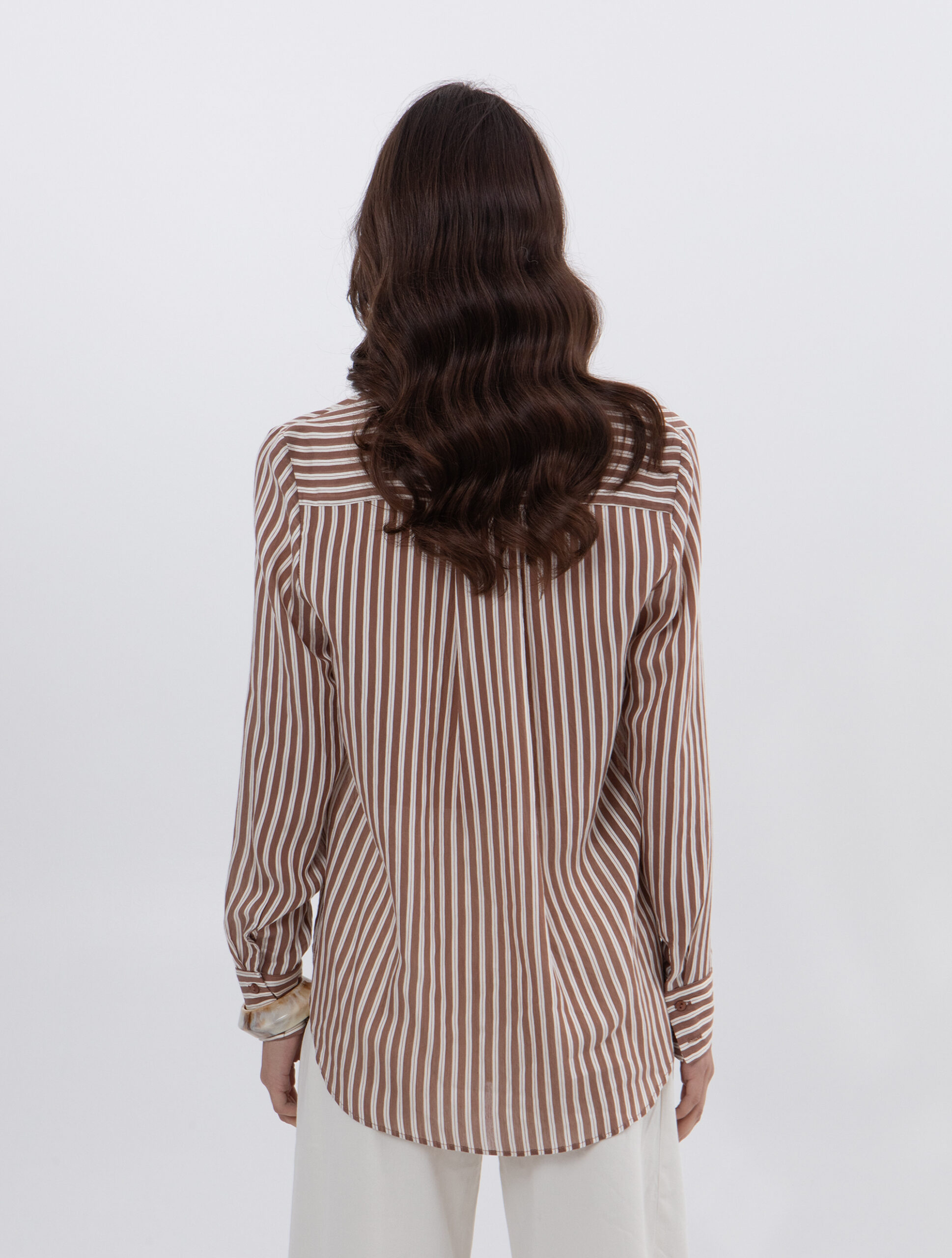 Αέρινο πουκάμισο με γιακά μάο, με ημιδιάφανη όψη και κάθετες ανάγλυφες ρίγες που χαρίζουν μια αίσθηση πολυτέλειας και άνεσης, καθιστώντας το ιδανικό για layering ή για να φορεθεί μόνο του.