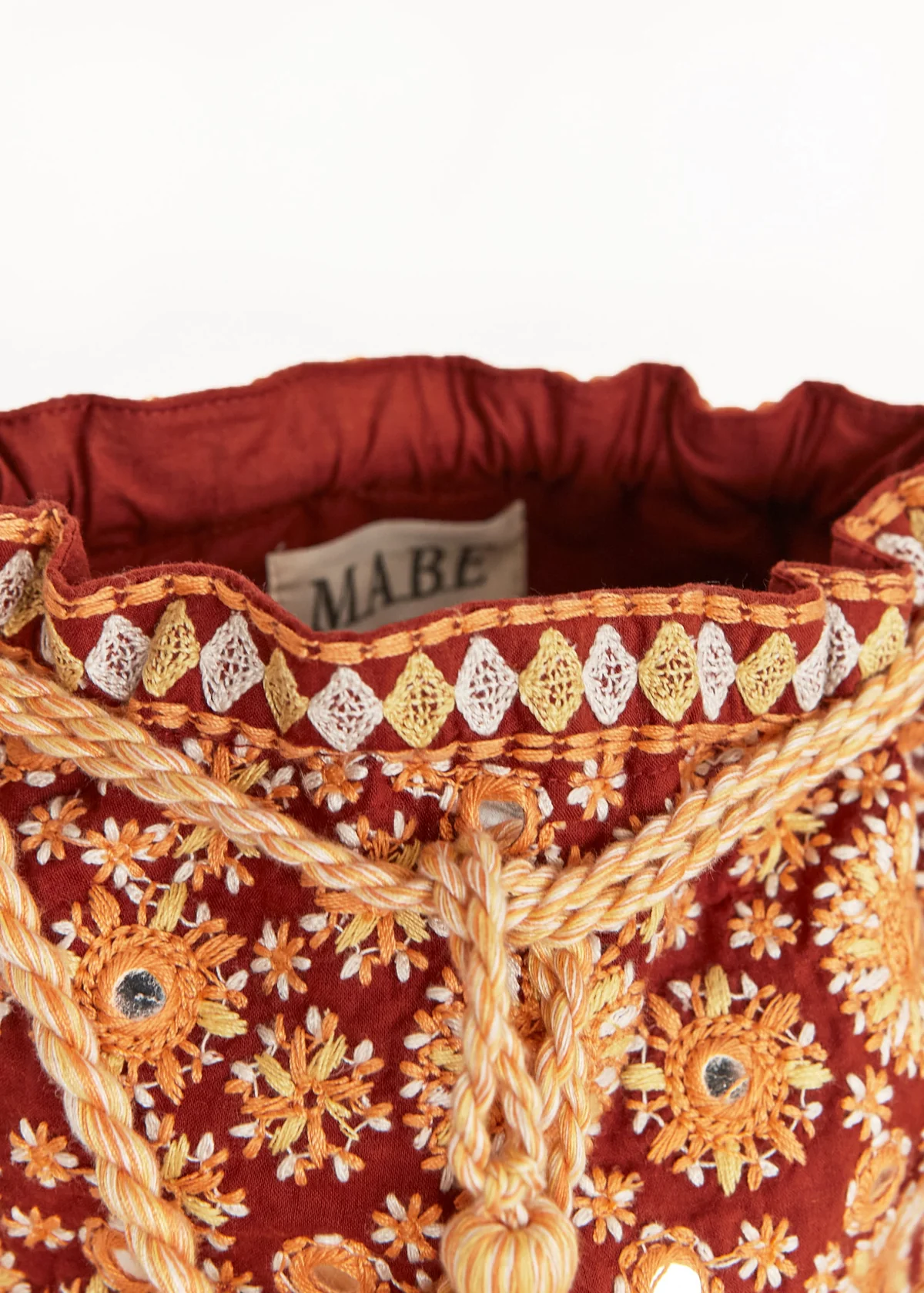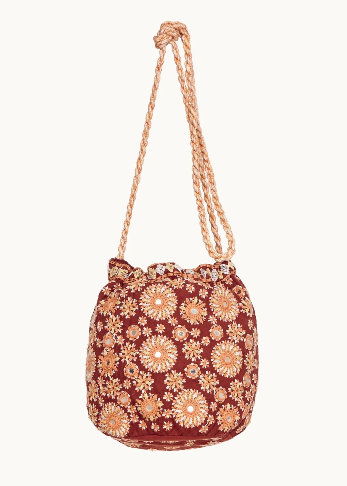 The Suri pouch blends intricate floral embroidery with shimmering mirrors for a romantic allure. The lightweight cotton base, multi-coloured cord, and tassel details give a soft, bohemian elegance, perfect to compliment your summer wardrobe. Wear it cross body or simply tie the cord and wear over one shoulder.