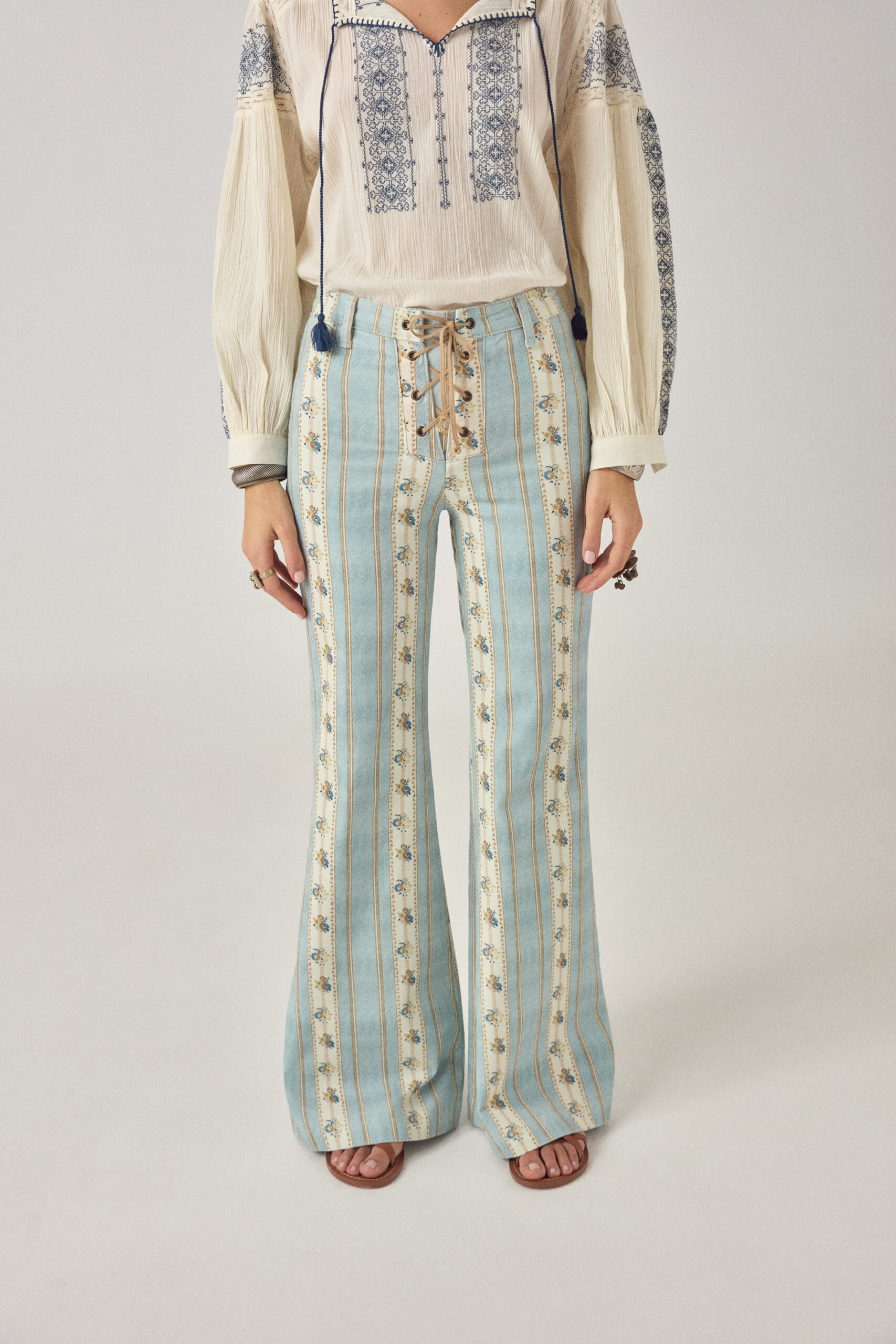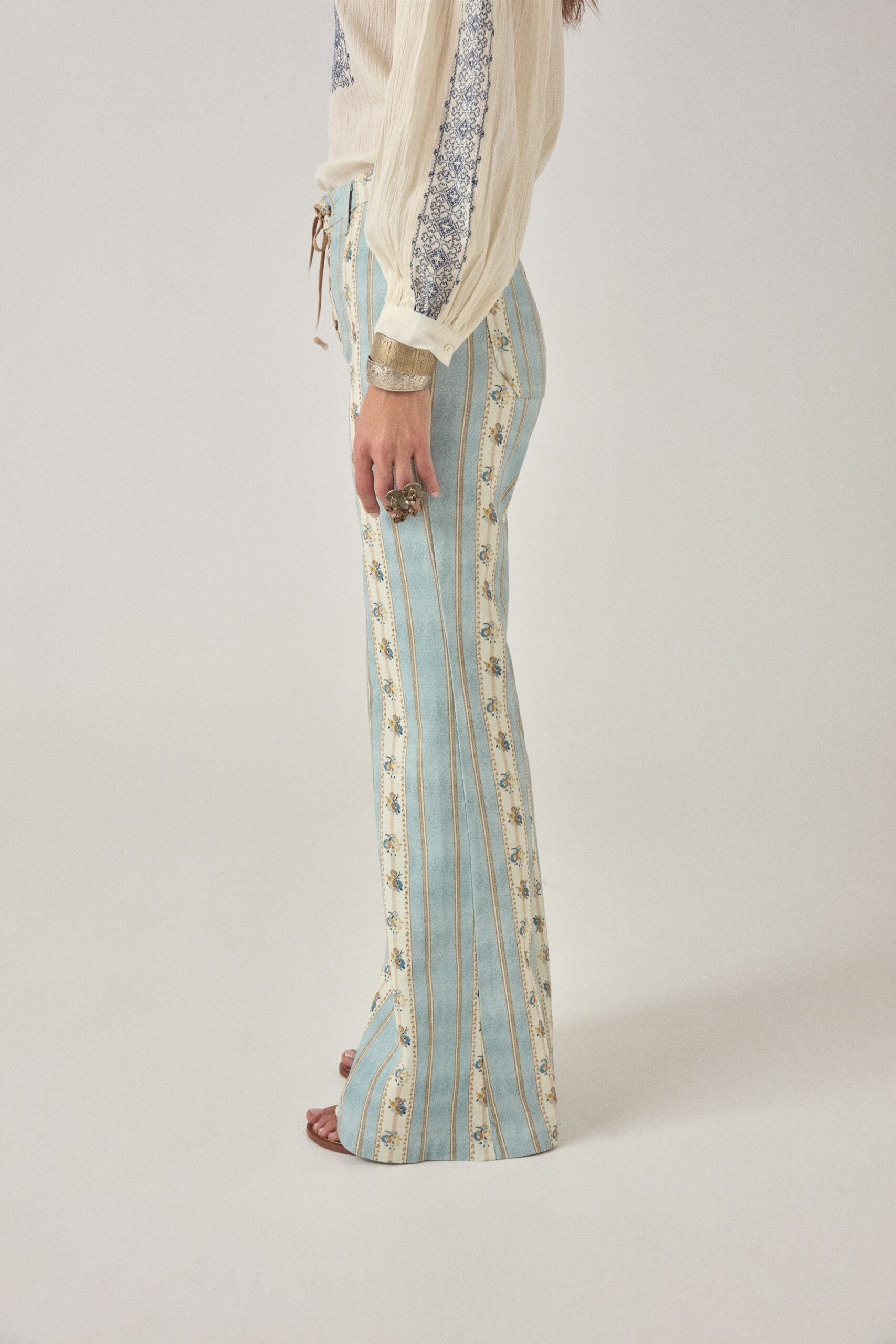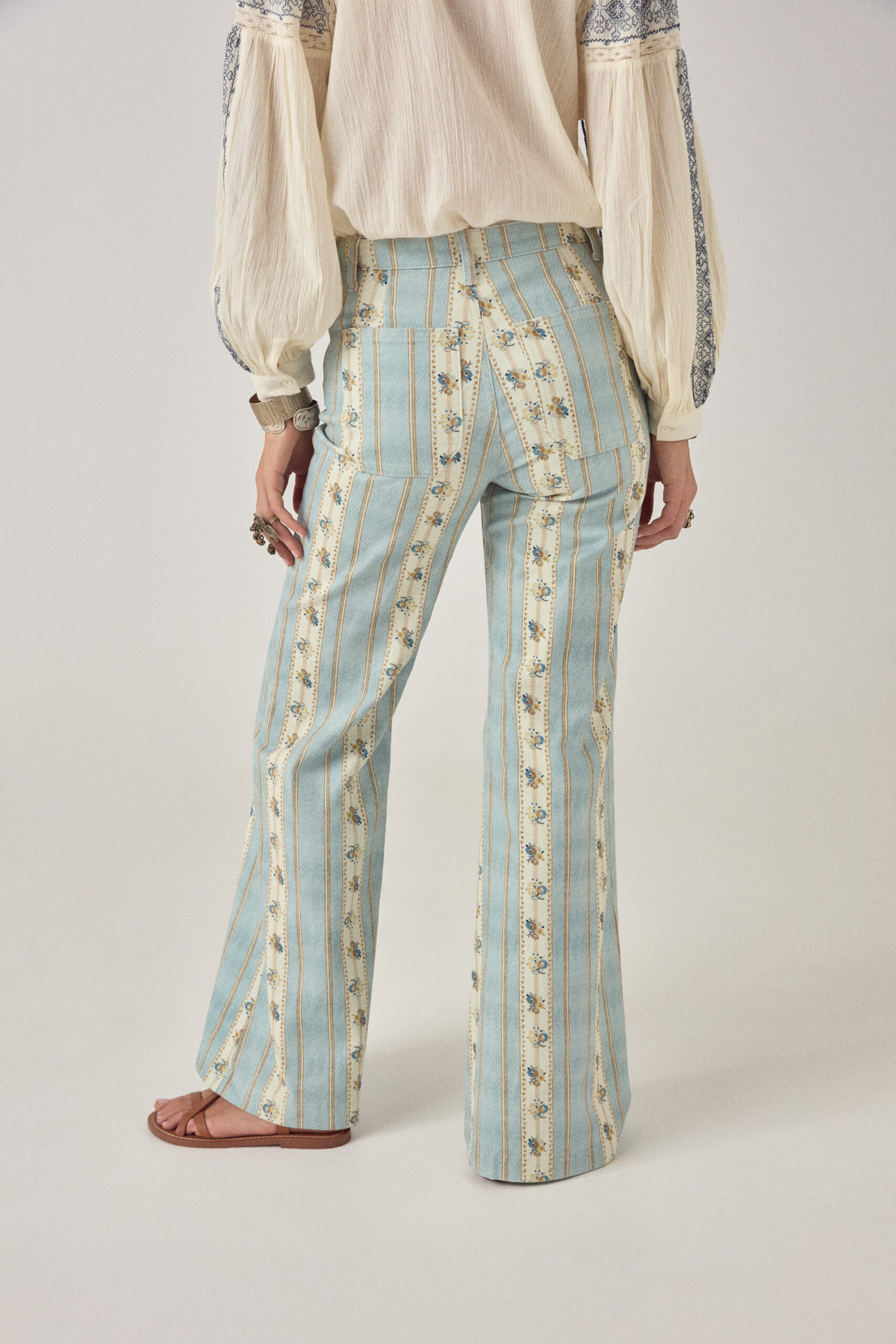This pant does more than it seems. The vertical striped print is packed with small floral details that only show up when you get closer — that’s the trick.