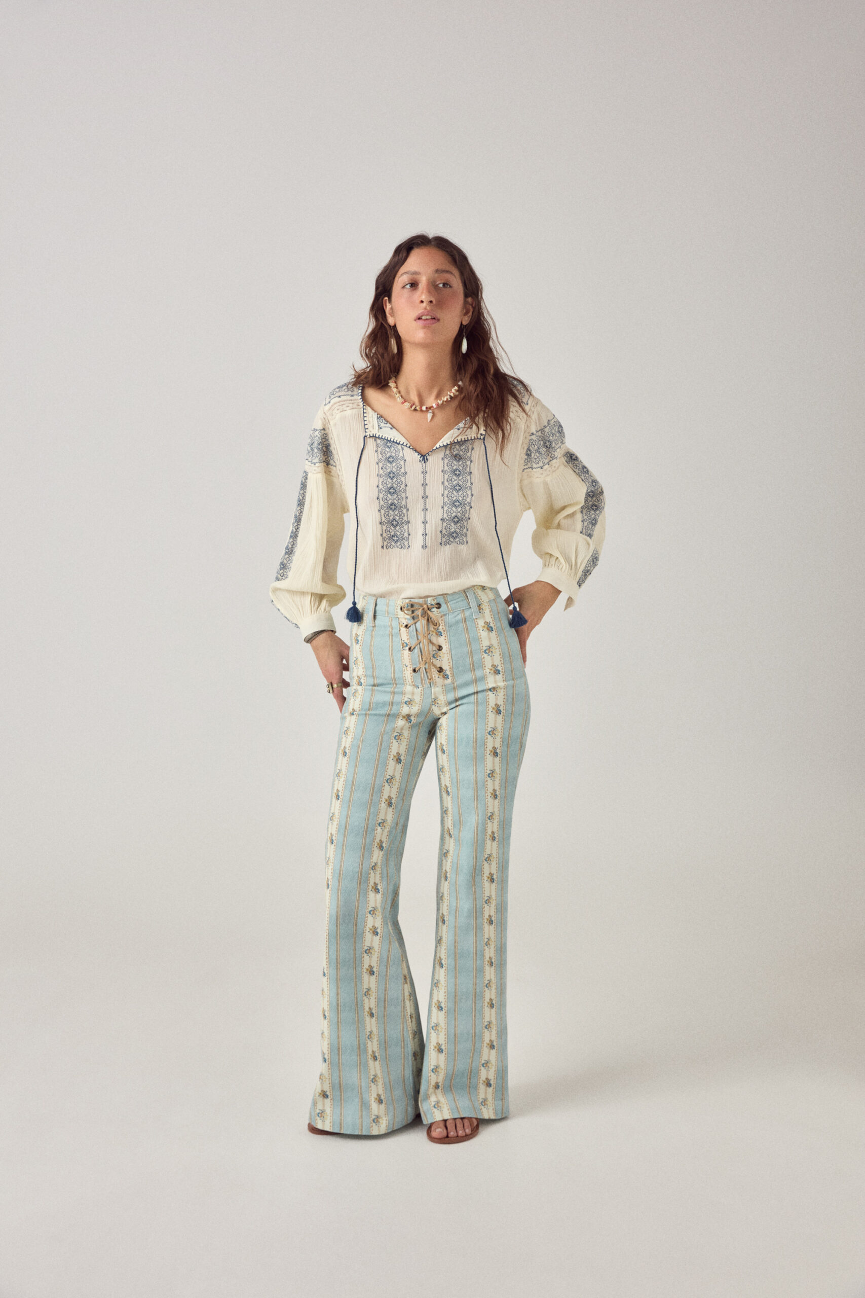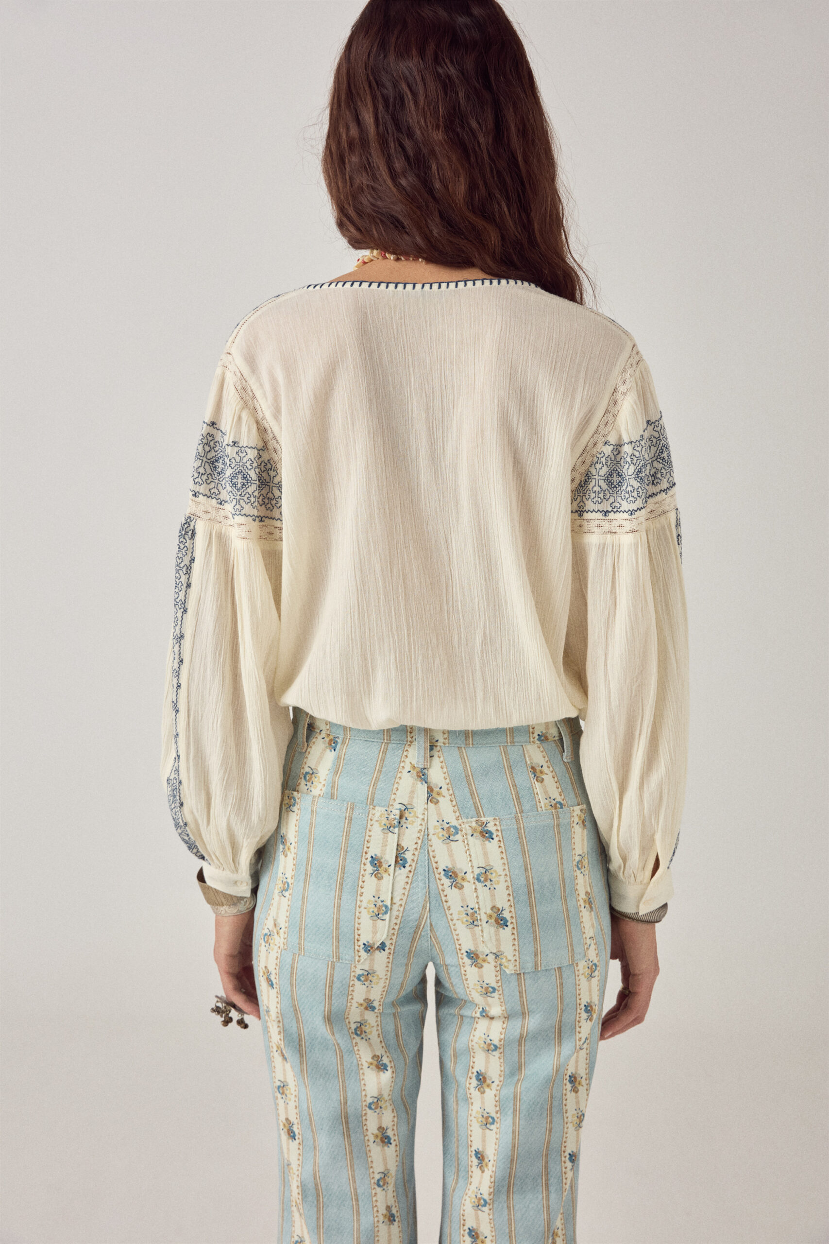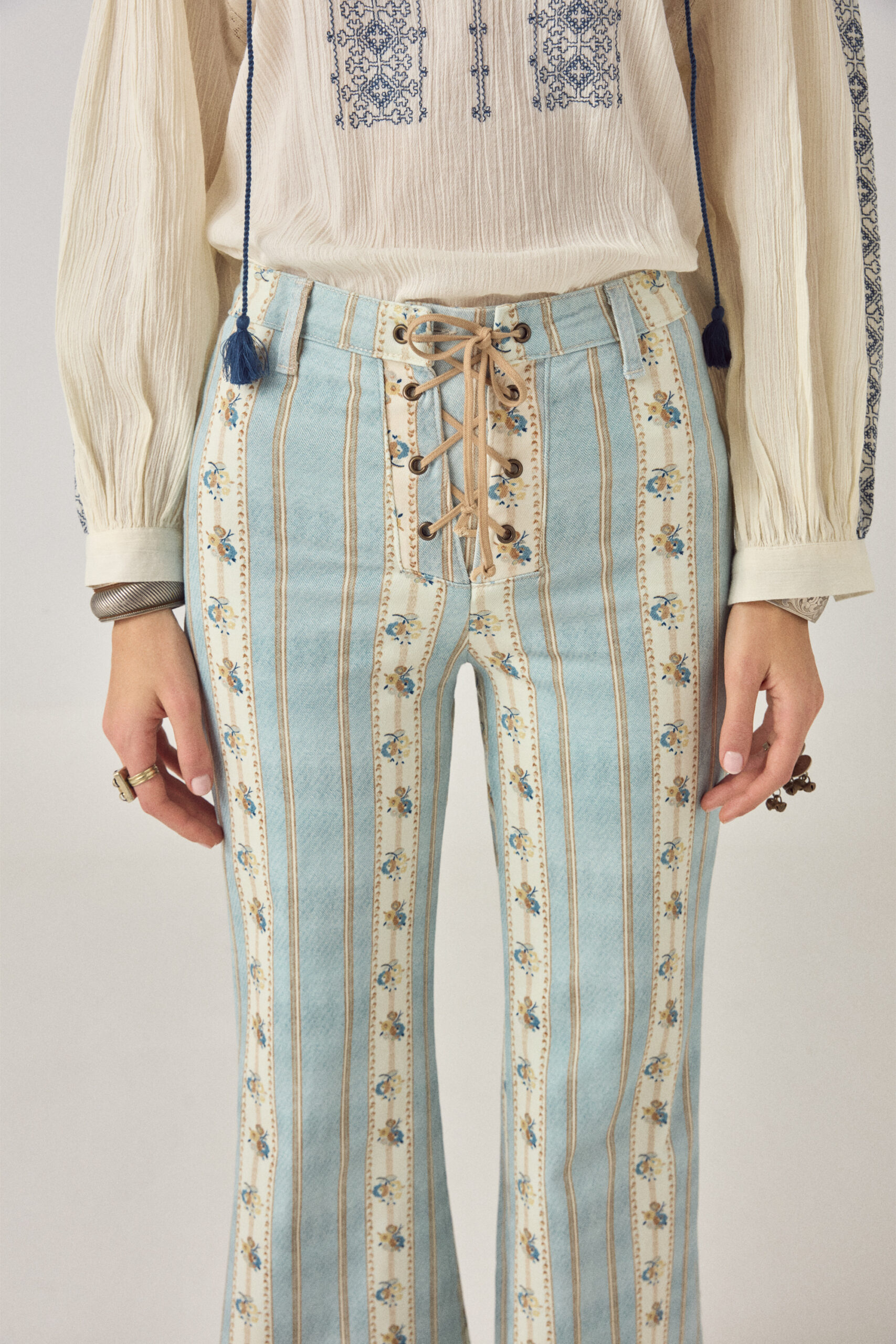 This pant does more than it seems. The vertical striped print is packed with small floral details that only show up when you get closer — that’s the trick.