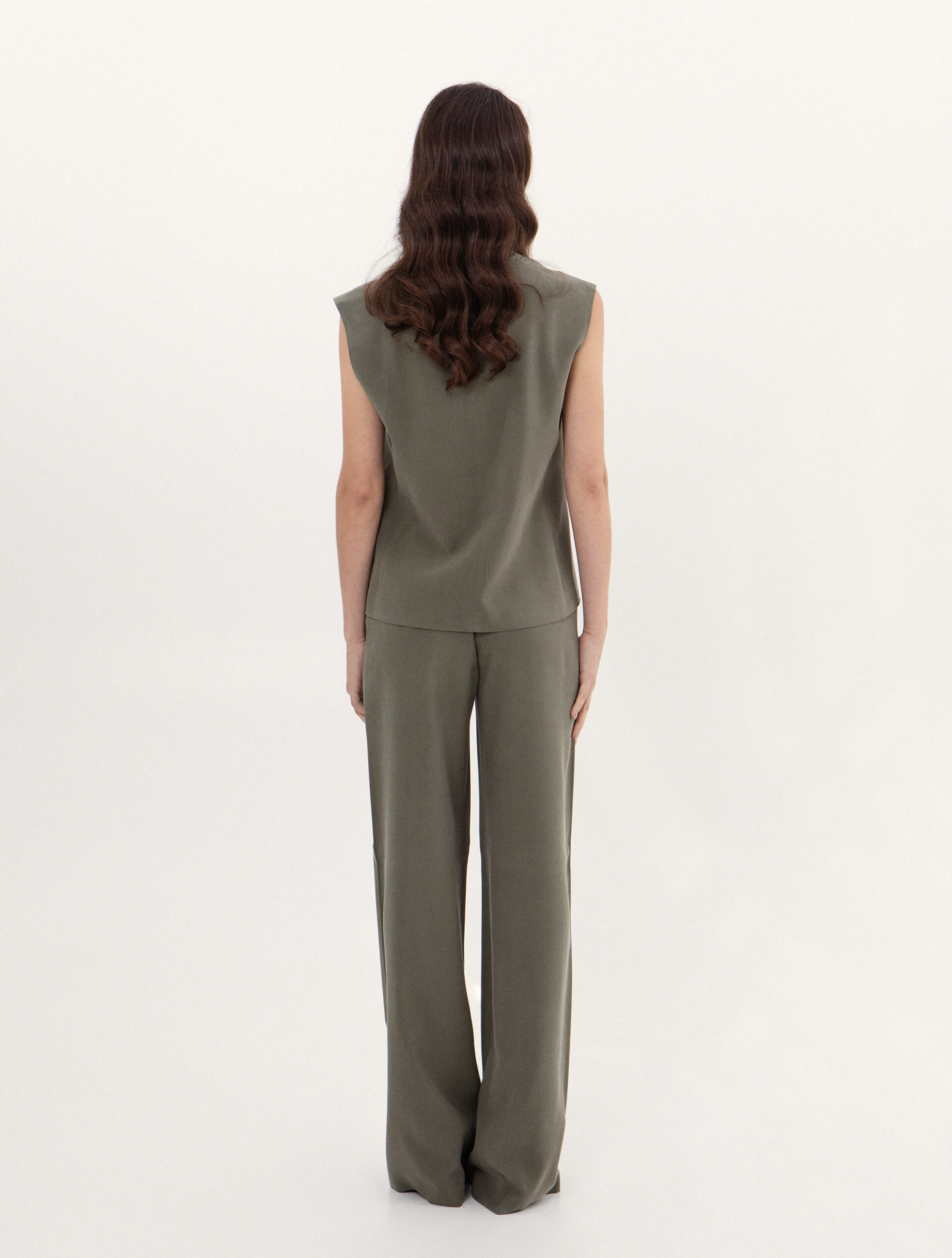 Παντελόνι ψηλόμεσο σε φαρδιά γραμμή. Διαθέτει θηλάκια για ζώνη, πλαϊνές τσέπες και κρυφό κούμπωμα, στοιχεία που το καθιστούν ιδανικό για "tailored" εμφανίσεις.
