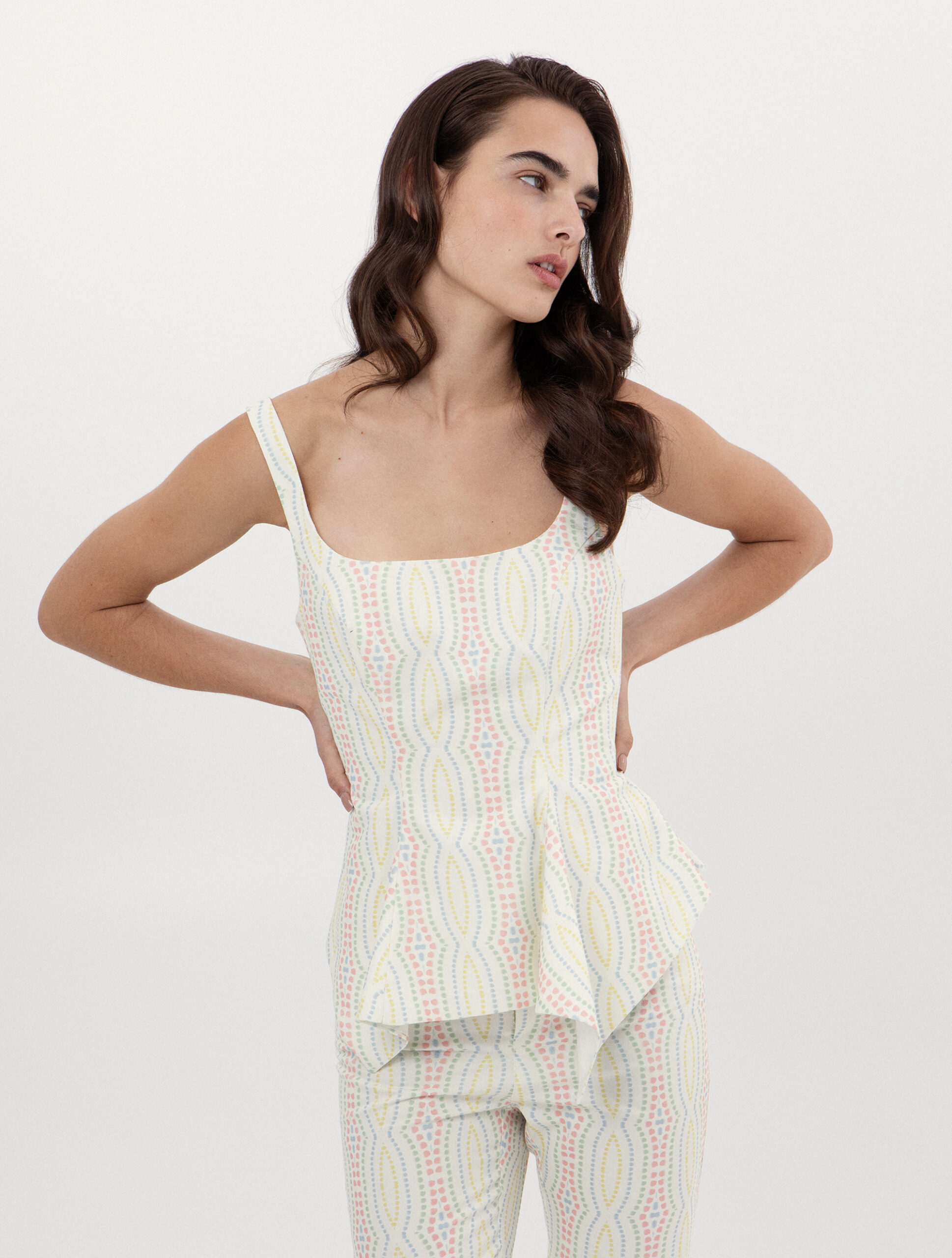 Αναδείξτε τη θηλυκότητα σας με αυτό το εντυπωσιακό αμάνικο peplum τοπ. Διαθέτει μοντέρνα τετράγωνη λαιμόκοψη και ένα μοναδικό μοτίβο που προσθέτει βάθος και πολυτέλεια στο ύφασμα. Η εφαρμοστή γραμμή στον κορμό που καταλήγει σε ένα αέρινο βολάν στη μέση δημιουργεί μια κολακευτική σιλουέτα, καθιστώντας το ιδανικό για να συνδυαστεί με το αντίστοιχο παντελόνι του.