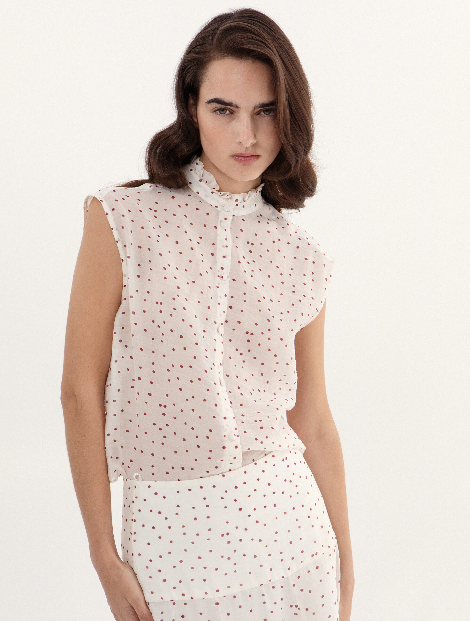 Αμάνικο τοπ με ψηλό λαιμό και λεπτομέρειες στον γιακά. Ημιδιάφανο ύφασμα με πουά print και loose fit εφαρμογή που προσφέρει άνεση και κομψότητα, ιδανική για να φορεθεί μέσα ή έξω από την φούστα. Συνδυάστε το με την αντίστοιχη πουά φούστα για ένα ολοκληρωμένο total look.