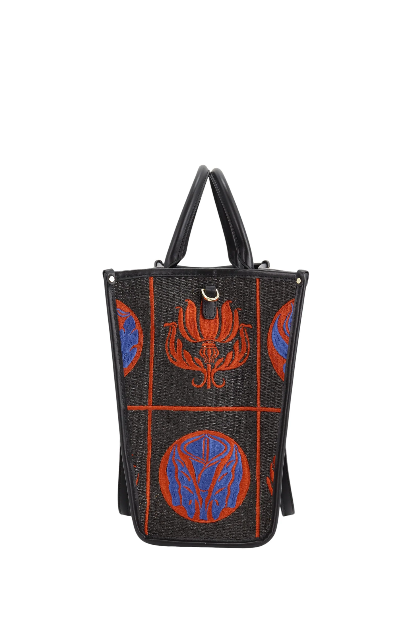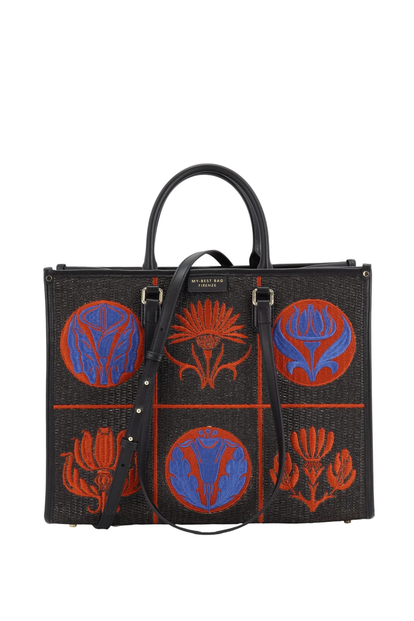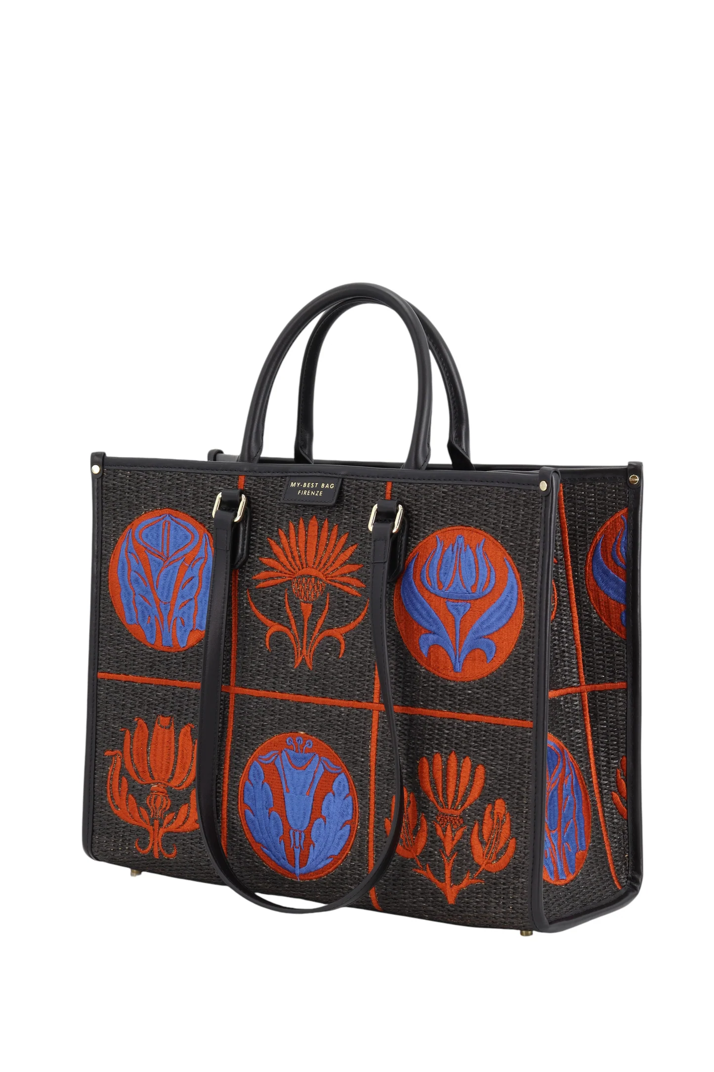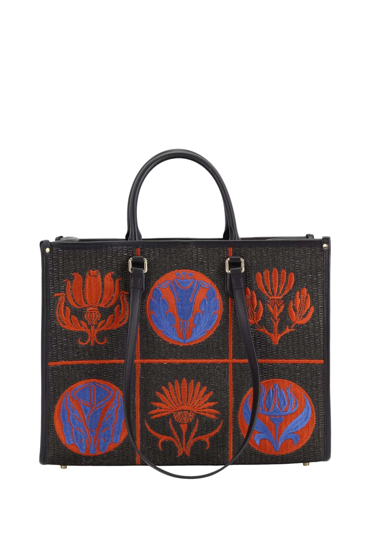 This tote bag interprets contemporary elegance through a defined and harmonious structure, designed to express personality and presence. The wide, well-constructed silhouette meets striking motifs, transforming the accessory into a truly distinctive style statement.