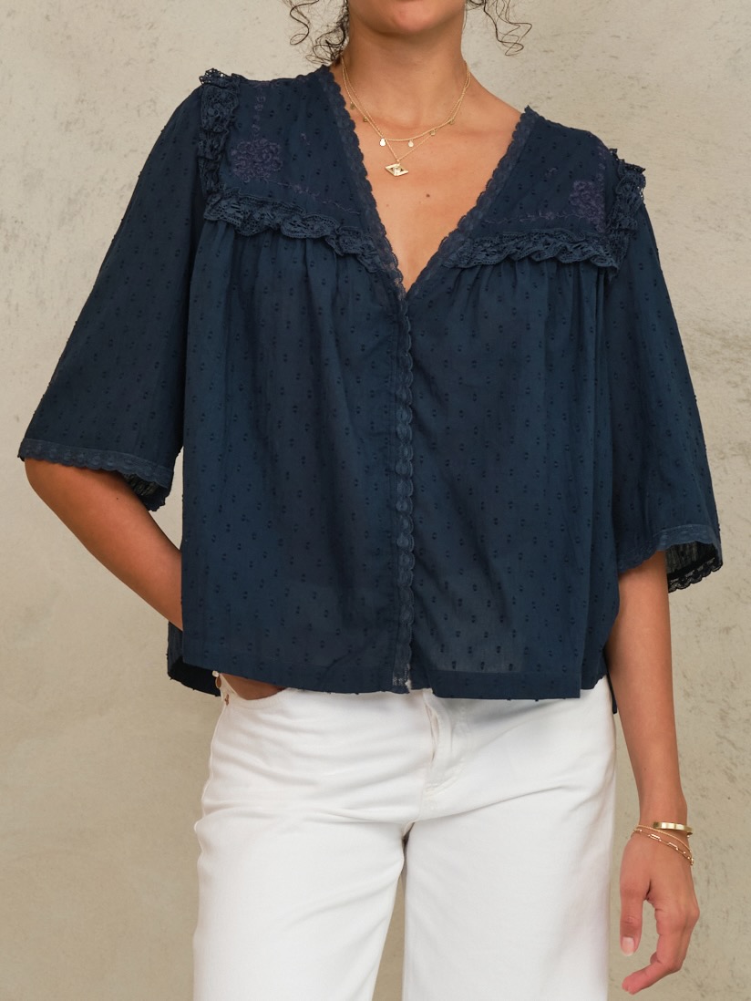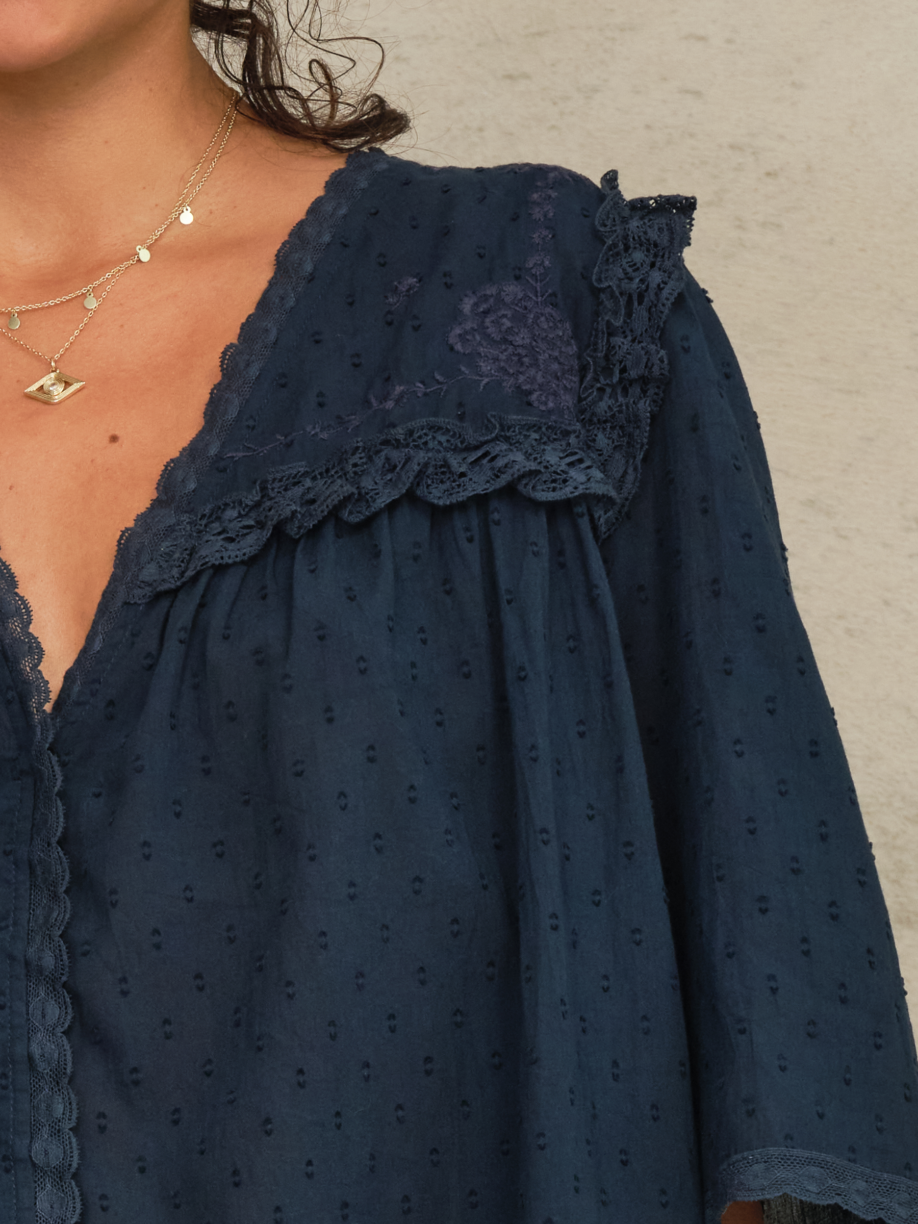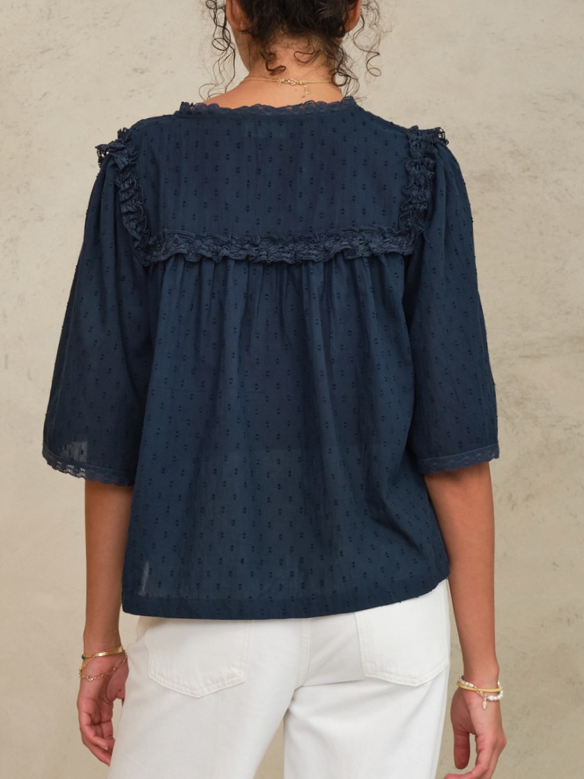 Made from pretty dotty textured cotton the Brea frill top is detailed with tonal floral embroidery, lace trims and draped sleeves. The delicate gathers give a very soft style.