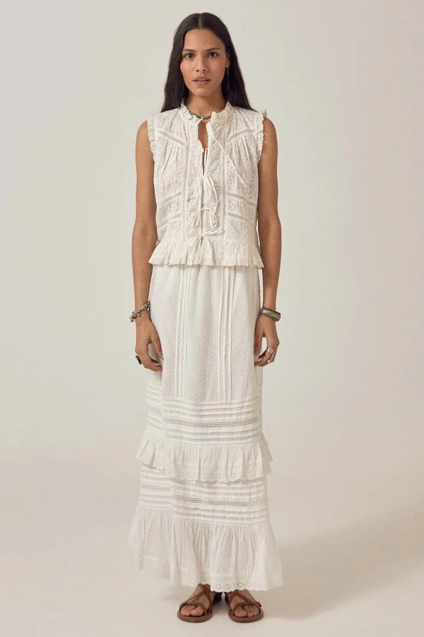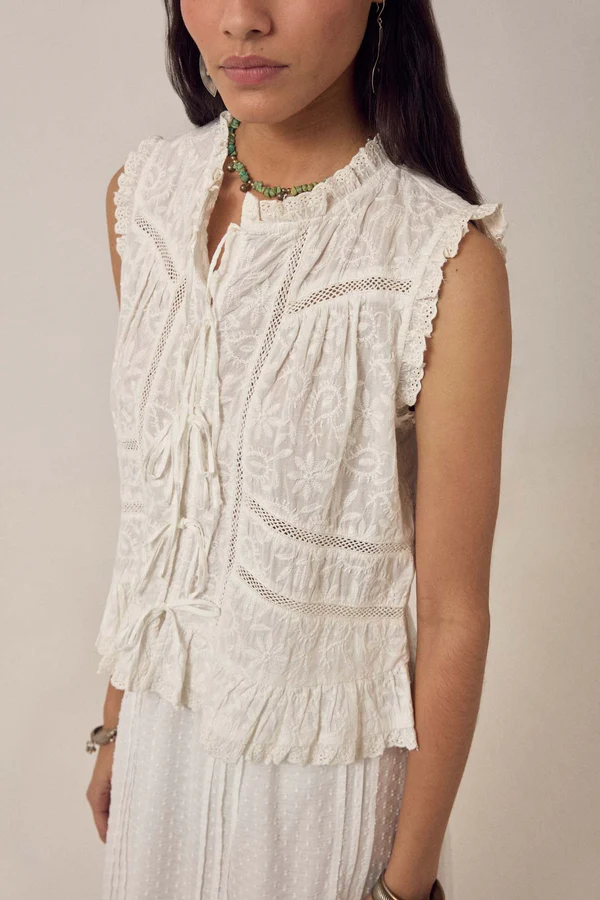 The schiffli fabric has eyelet perforations throughout, light and breathable. Lace-up front adds structure to the cropped silhouette. Ruffle at the hem softens the look. Full moon is warm ivory, not stark white