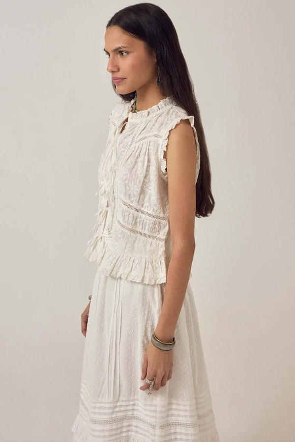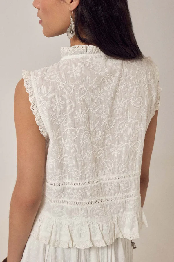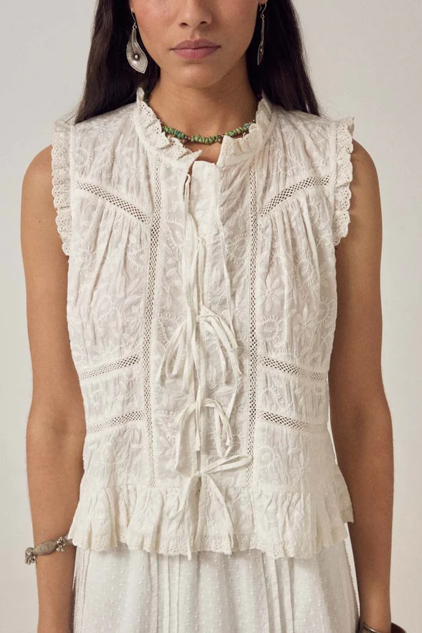 Cropped sleeveless top in ivory cotton schiffli with lace-up front. Round neckline with ruffle trim, lace-up closure down the center, finished with a ruffle peplum at the hem. Lace trim details frame the front panel and edges.
