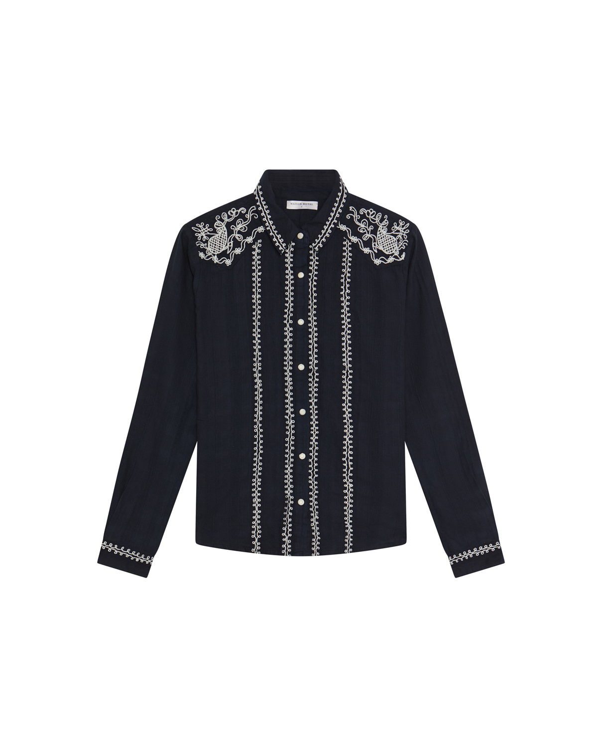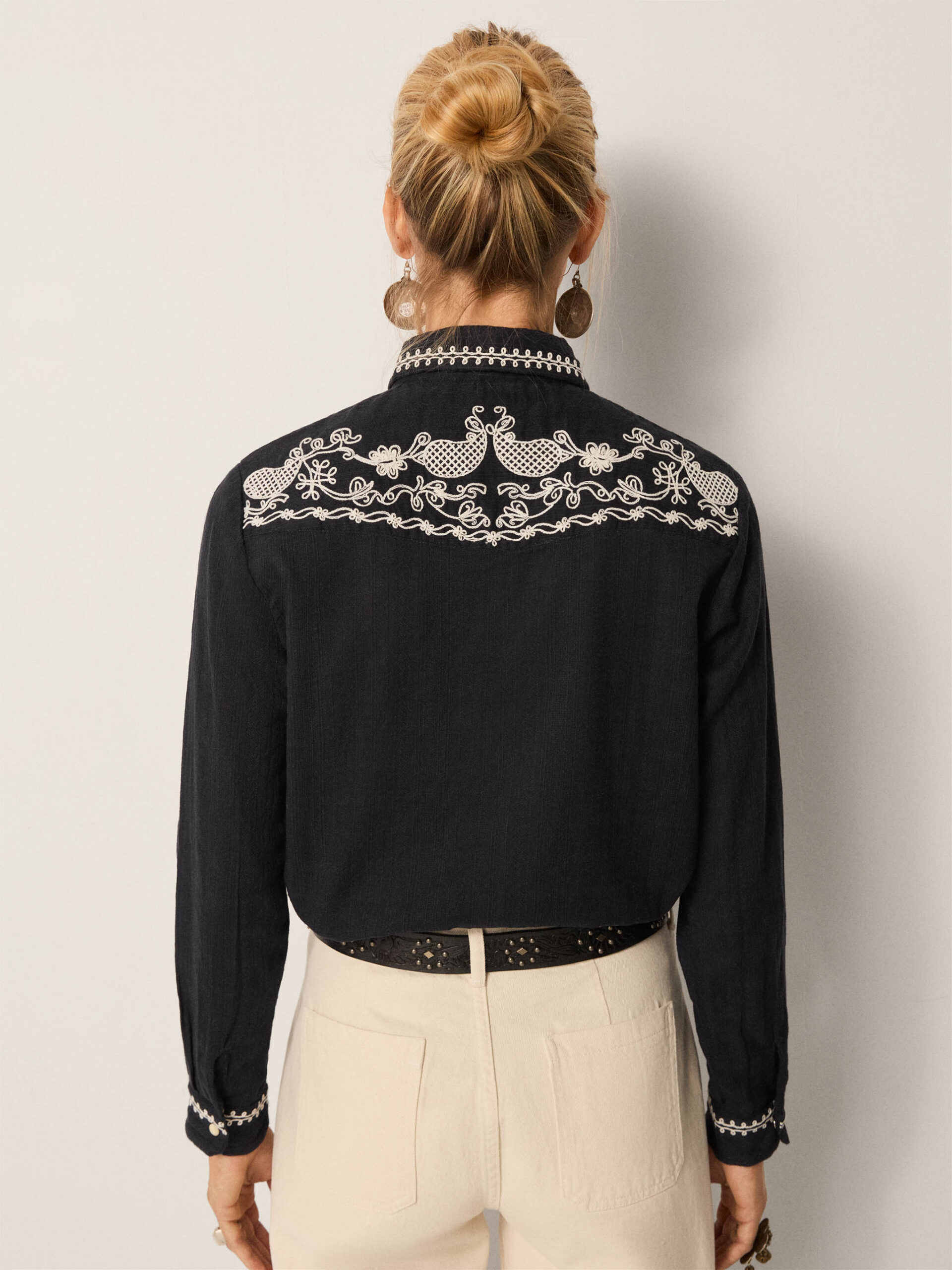 Light cotton with a natural grain, steady but breathable to wear. Its dark ground gives presence and sharp contrast to embroidery.