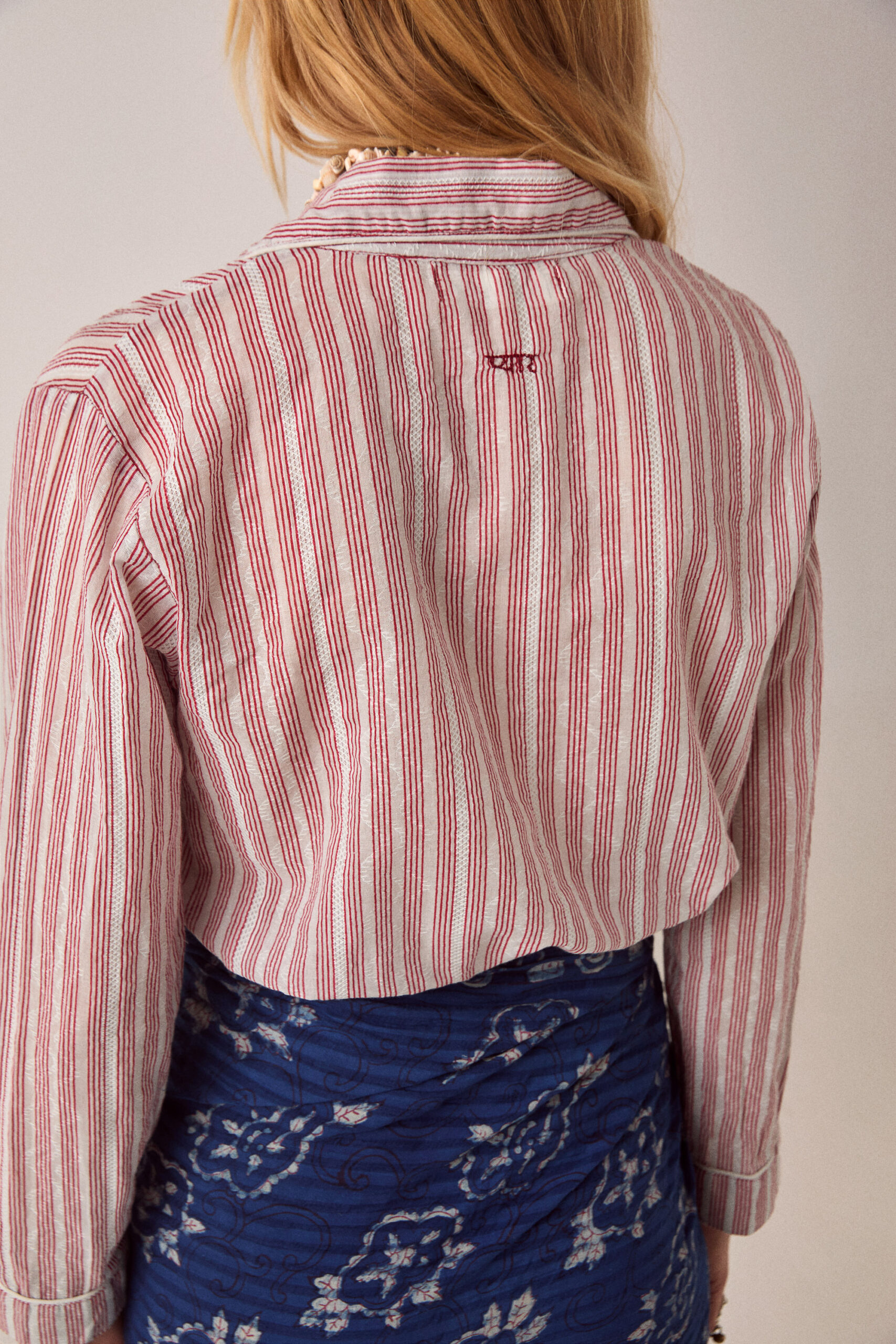 Light blue base with vertical wine-colored stripes—warm and deep, relaxed rather than polished. Draws from vintage pajama shirts and inherited pieces. The stripes feel intimate and familiar, like fabric borrowed from another time.