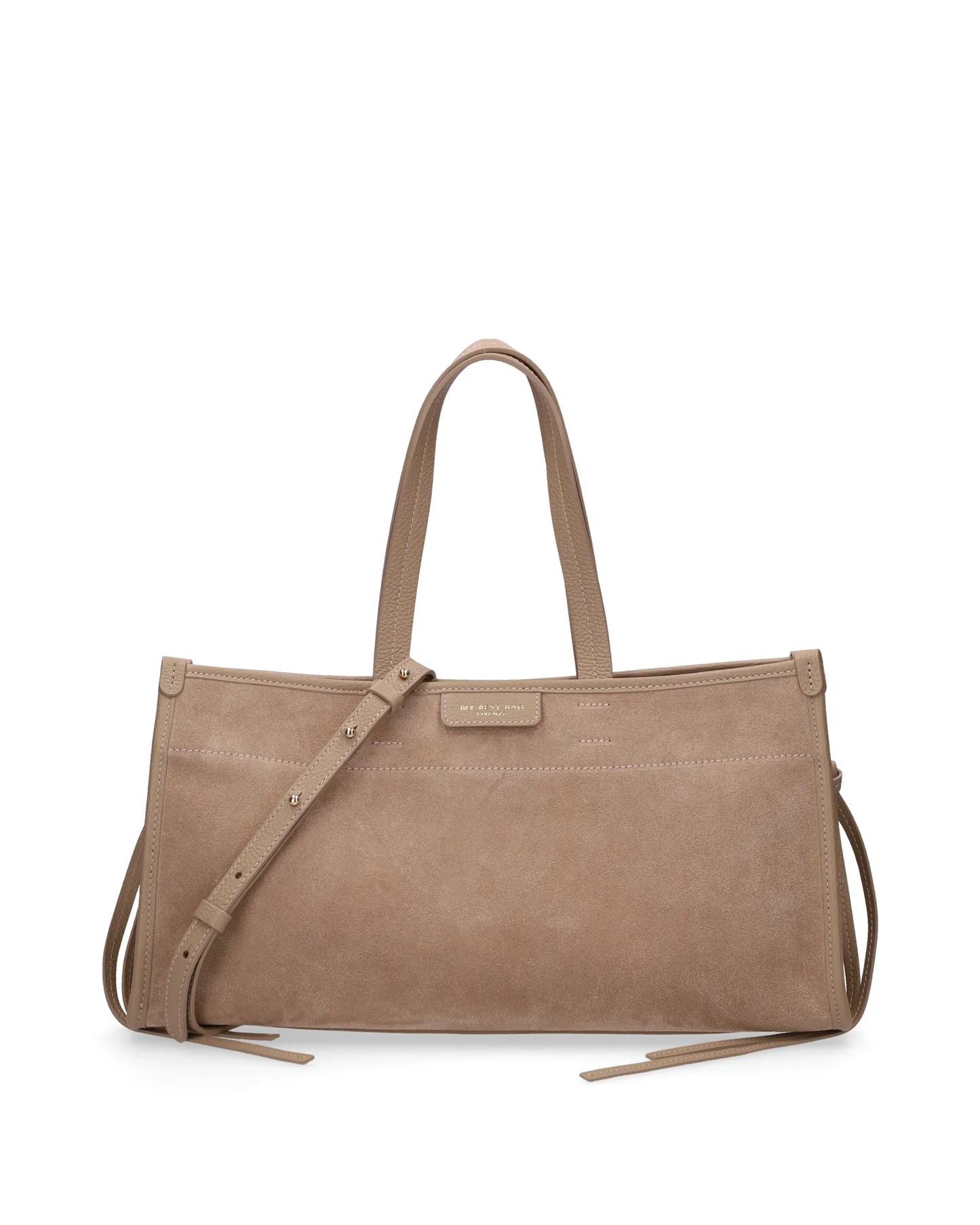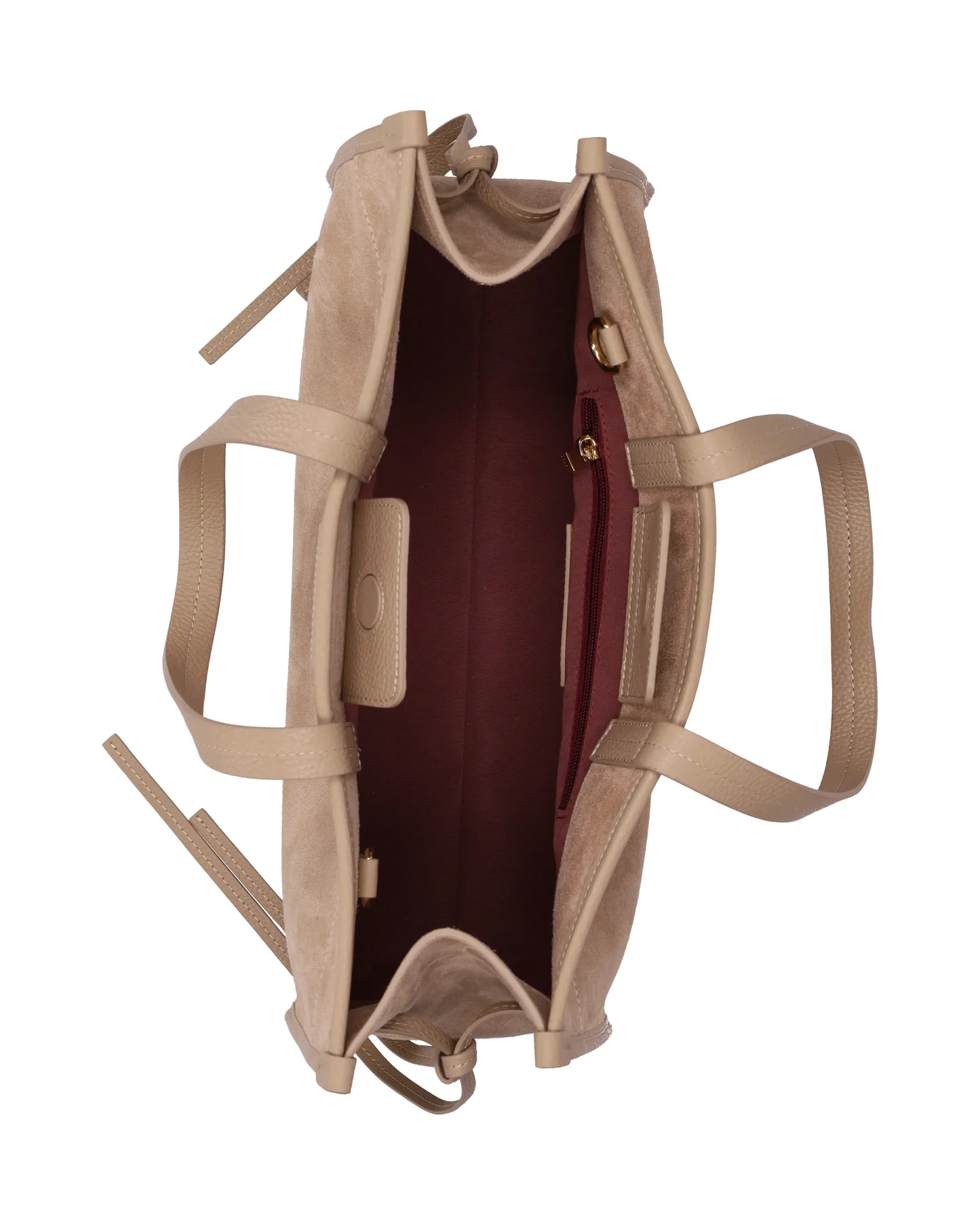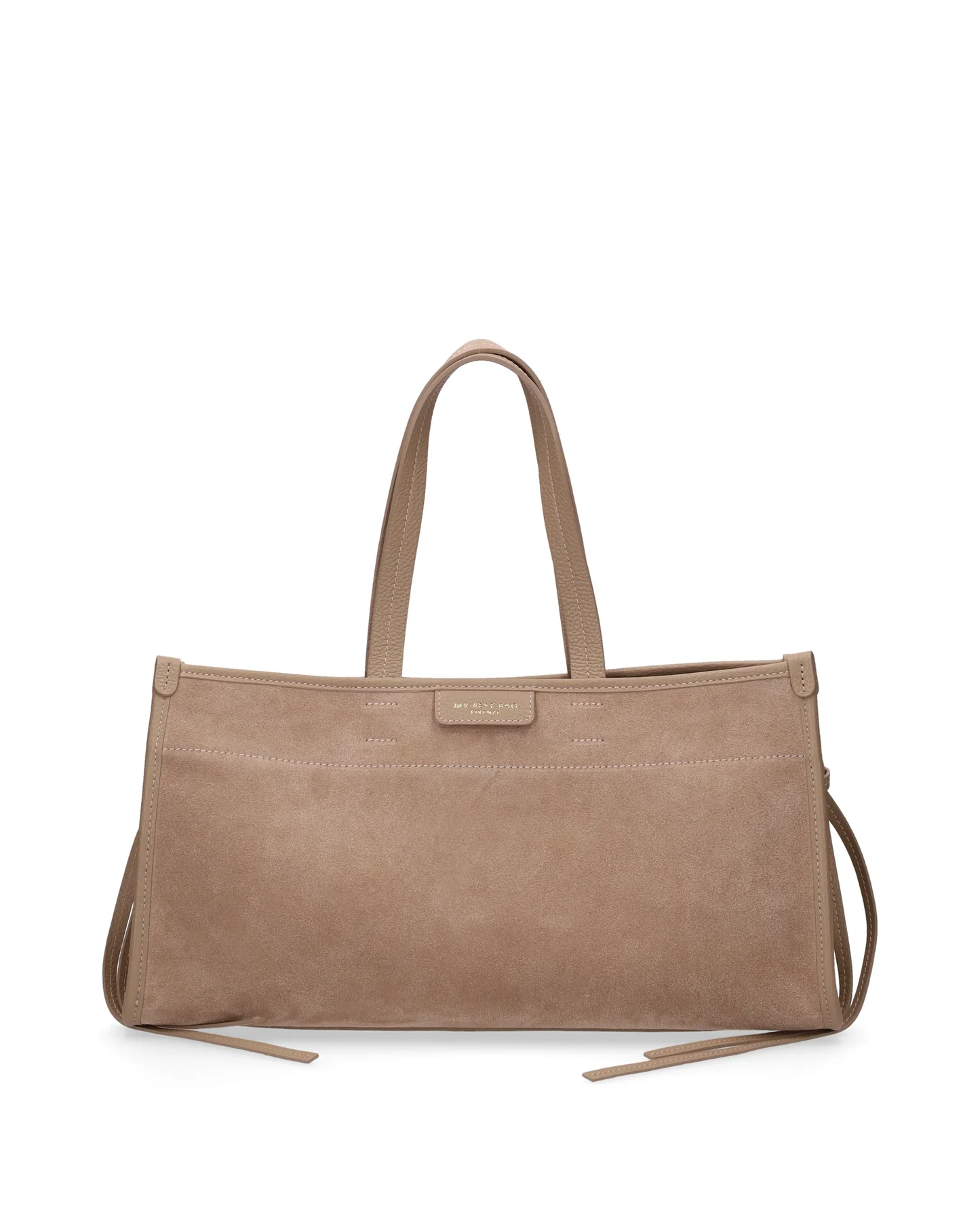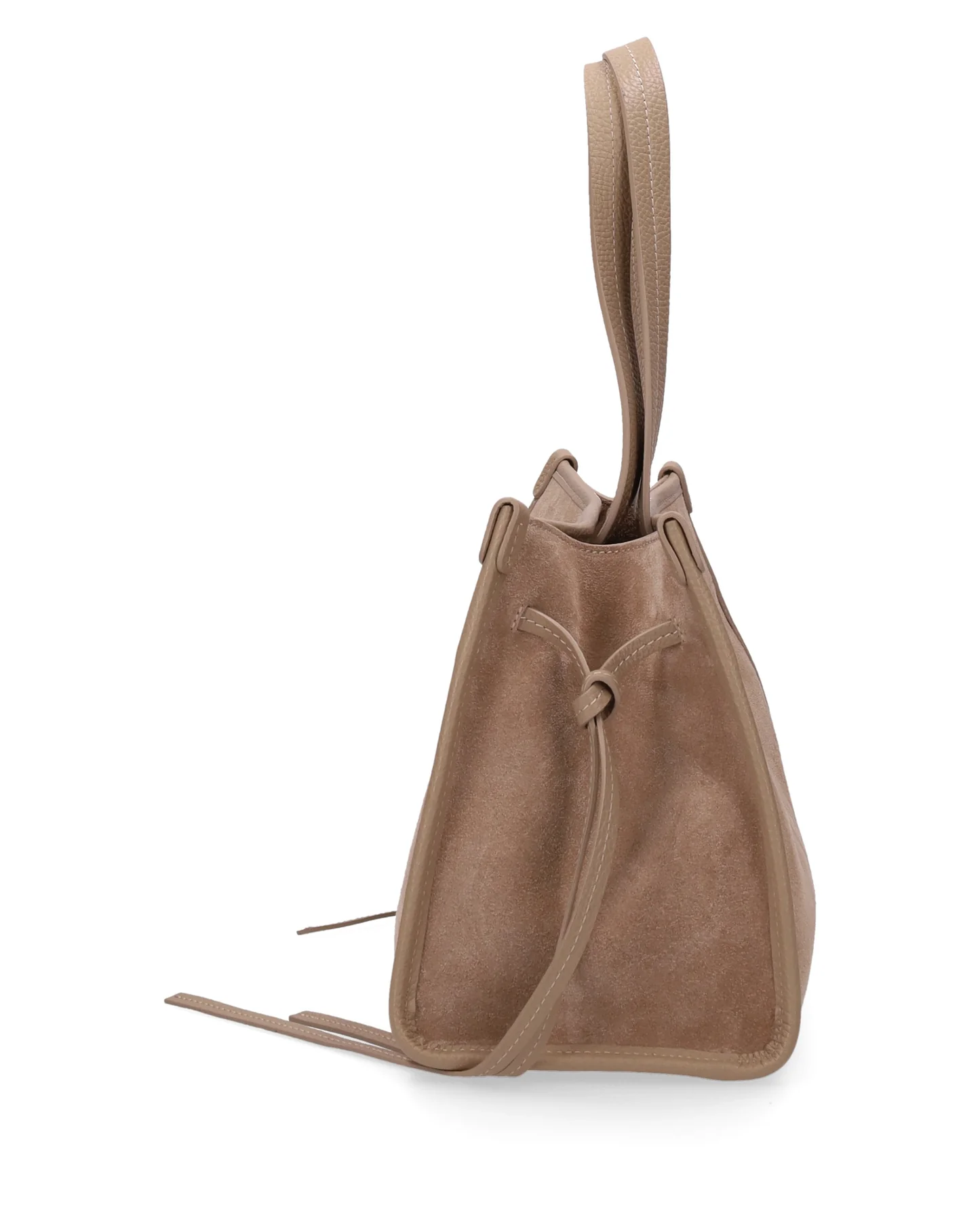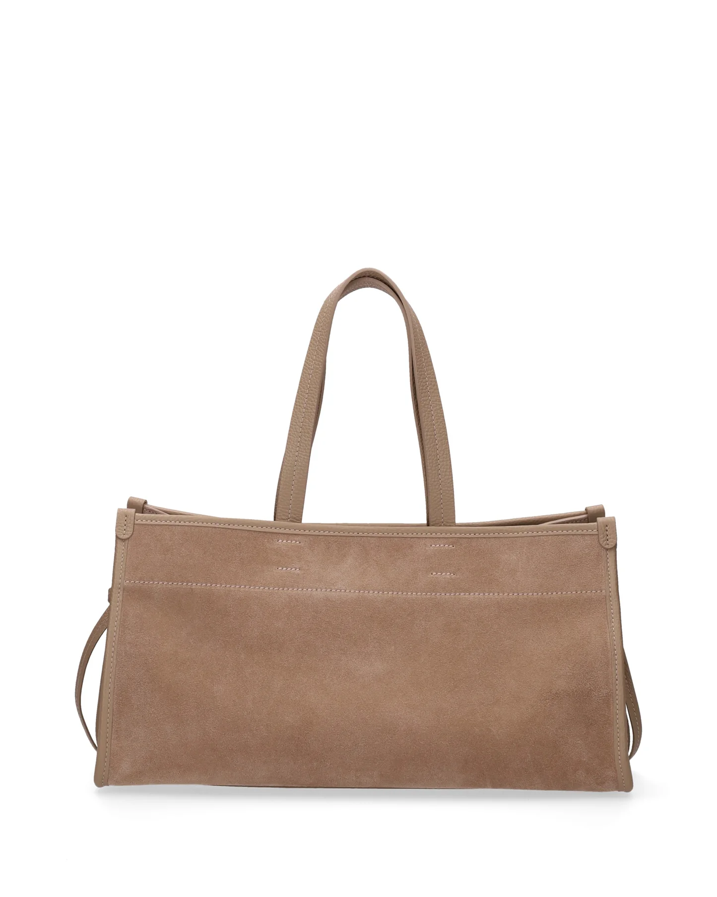 Made of soft suede, it is embellished with genuine leather details, edges and handles.