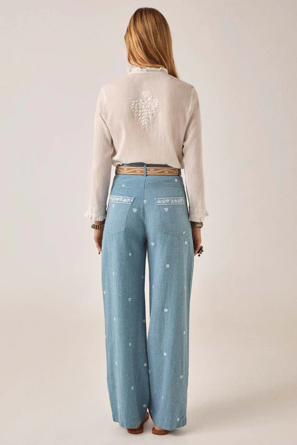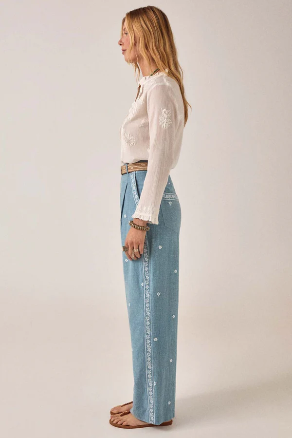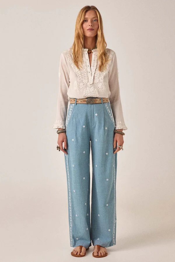 The cut is relaxed and fluid, made to move with the body rather than hold its shape. Worn loose, slightly open at the neckline, sleeves falling naturally as the day unfolds. The embroidery brings just enough structure, anchoring the lightness of the fabric without weighing it down.
