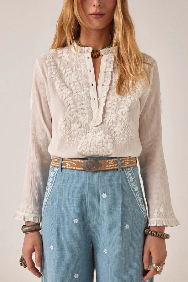 Gabriela feels alive in movement. A white blouse worn while walking, catching light as it shifts between trees and shadow. The tone is soft and natural, never stark — a white that feels warm against the skin. Embroidery runs across the front like a quiet relief, adding texture without interrupting the flow.