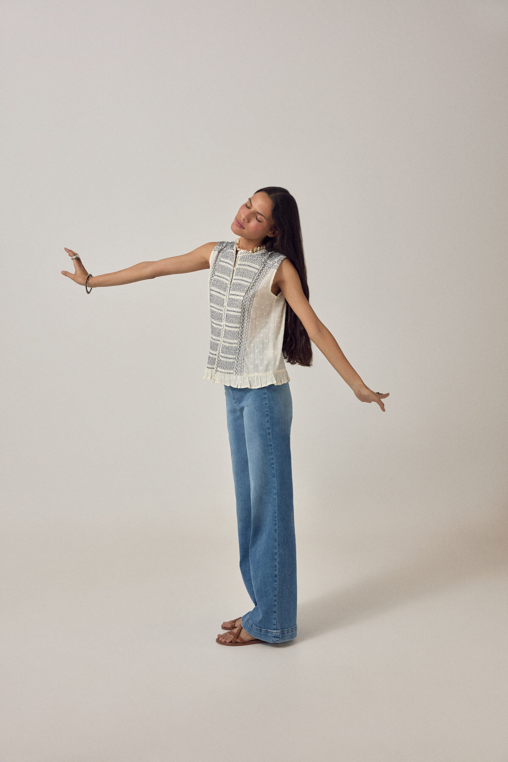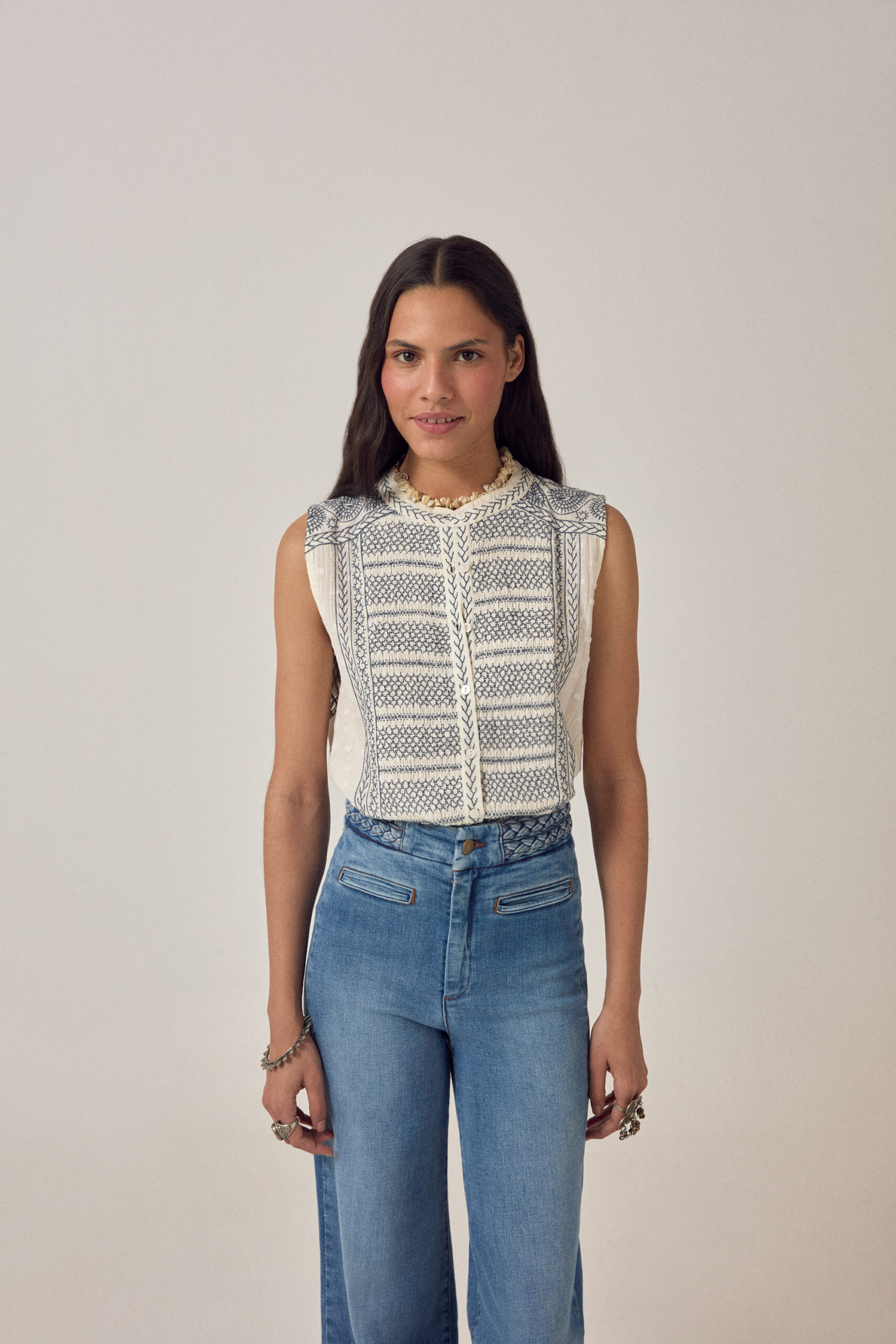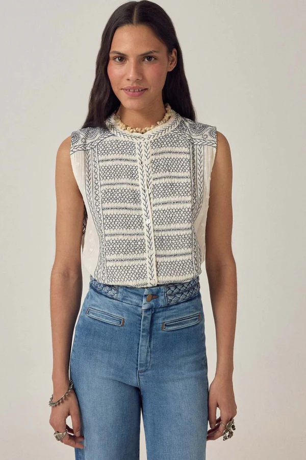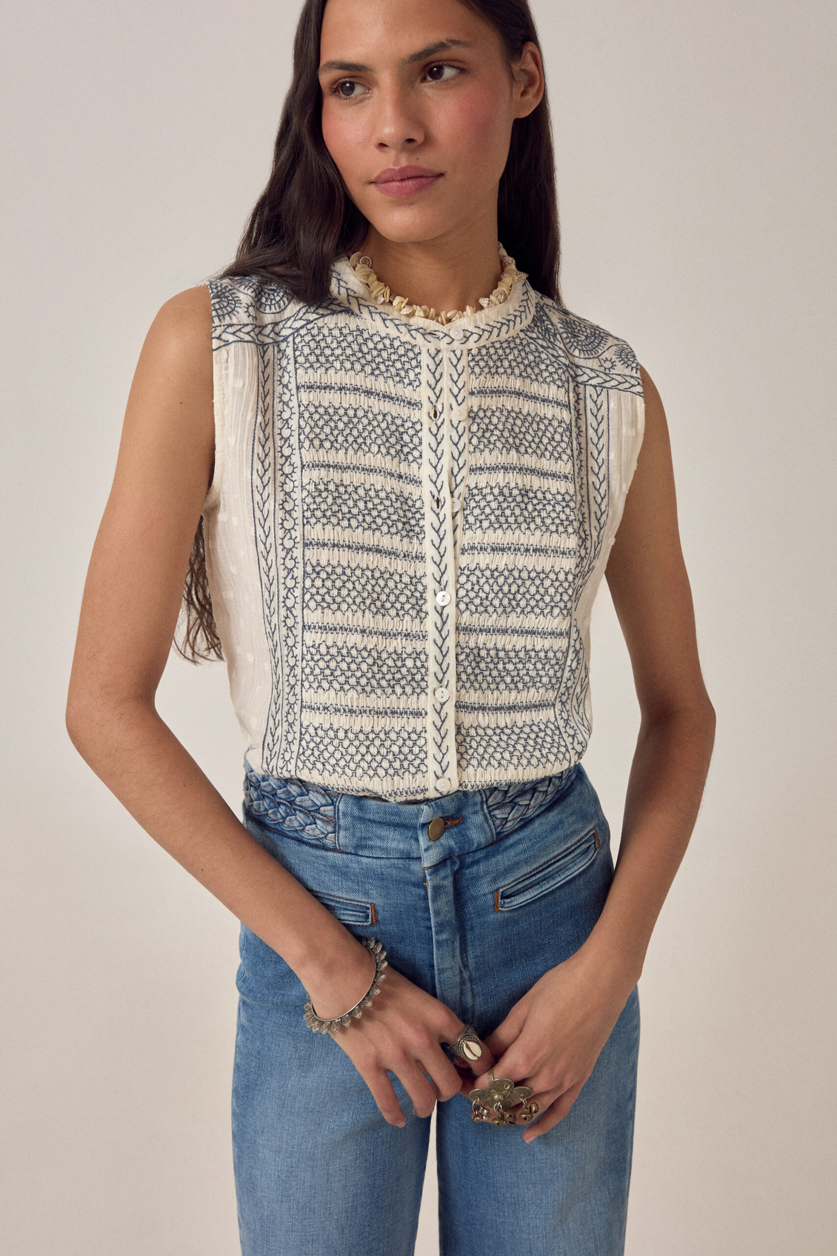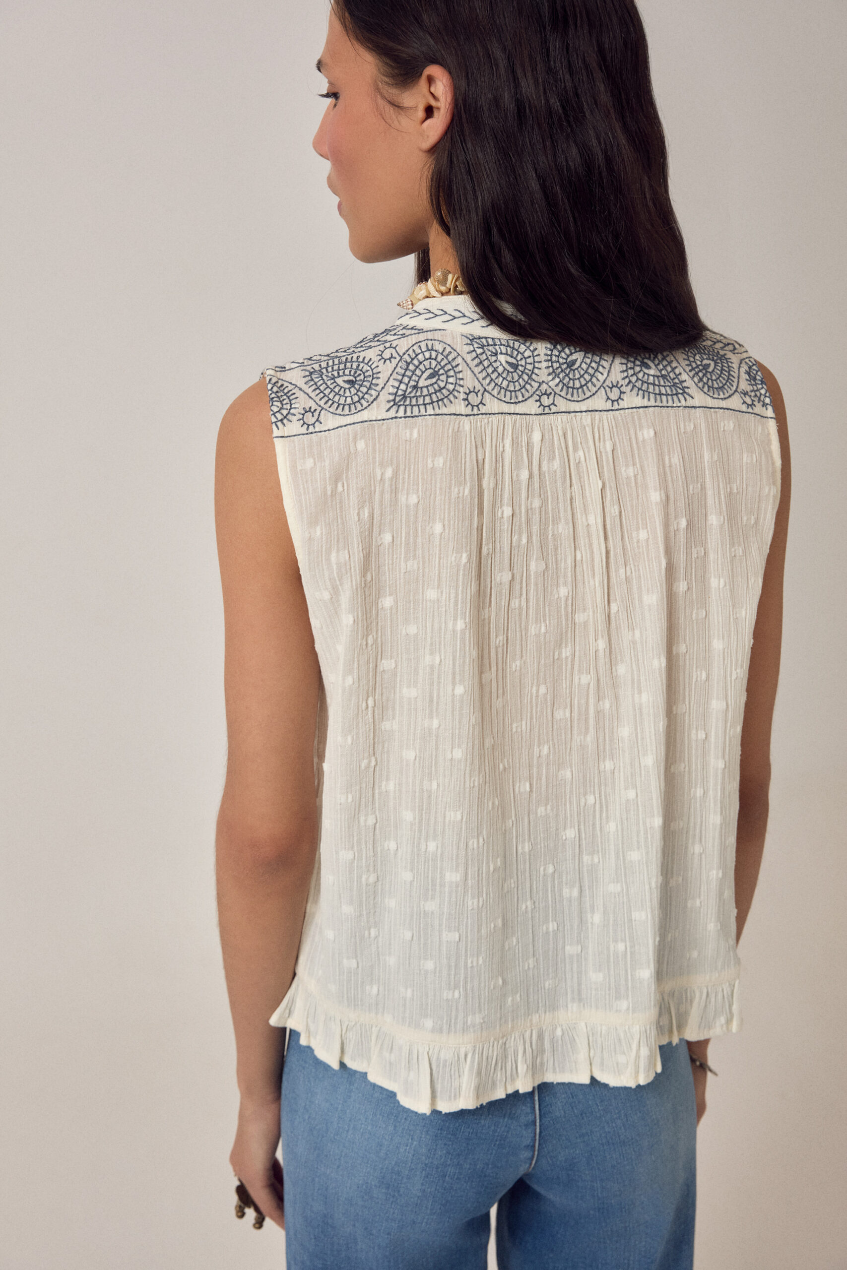 Sleeveless blouse in soft cream cotton gauze with navy embroidery covering the front panel. Round neckline with embroidered trim, button-down front, fitted through the body, finished with a ruffle at the hem. Sleeveless with embroidered detail framing the central panel.