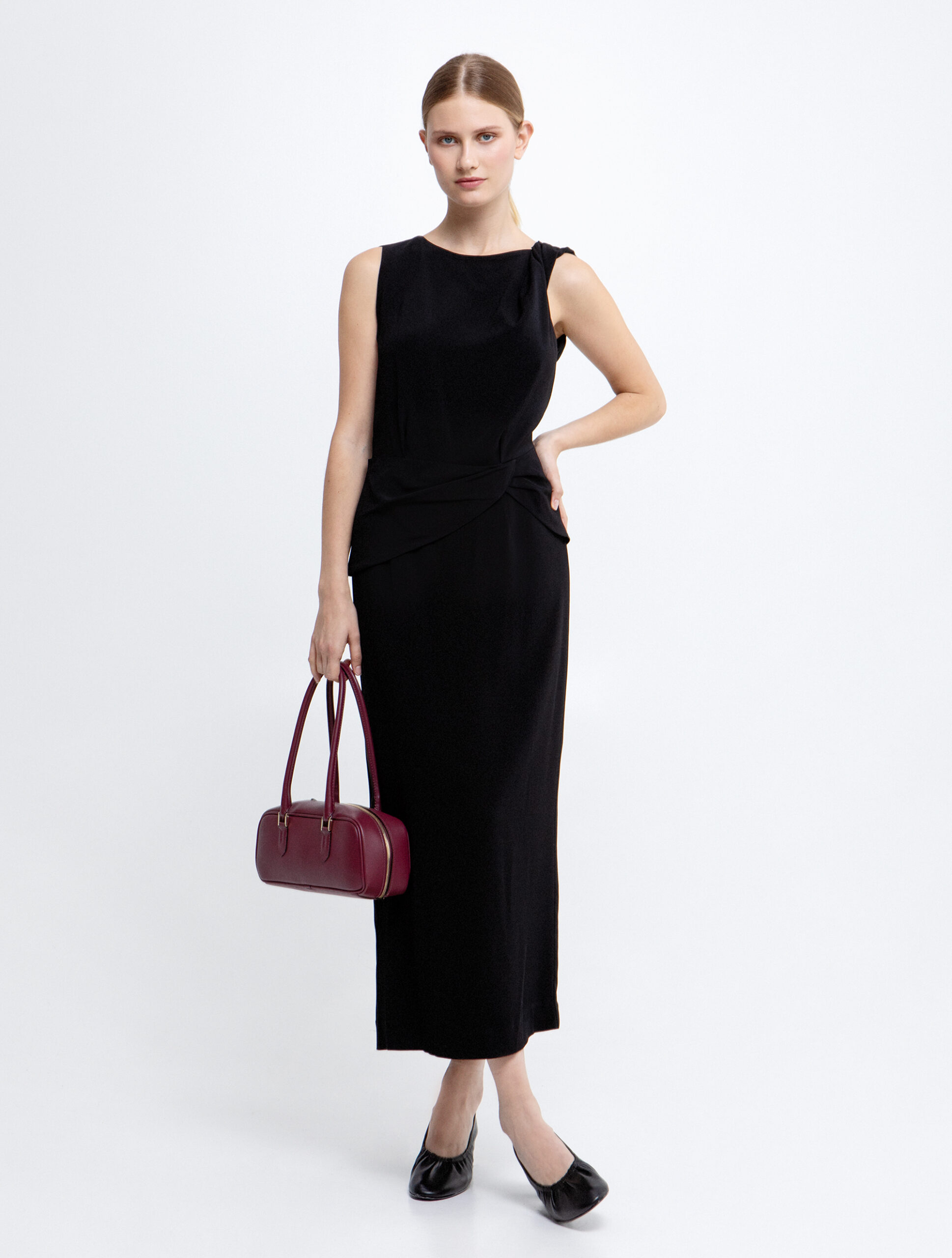 μίντι φόρεμα με ντραπέ λαιμόκοψη και ασύμμετρη μέση