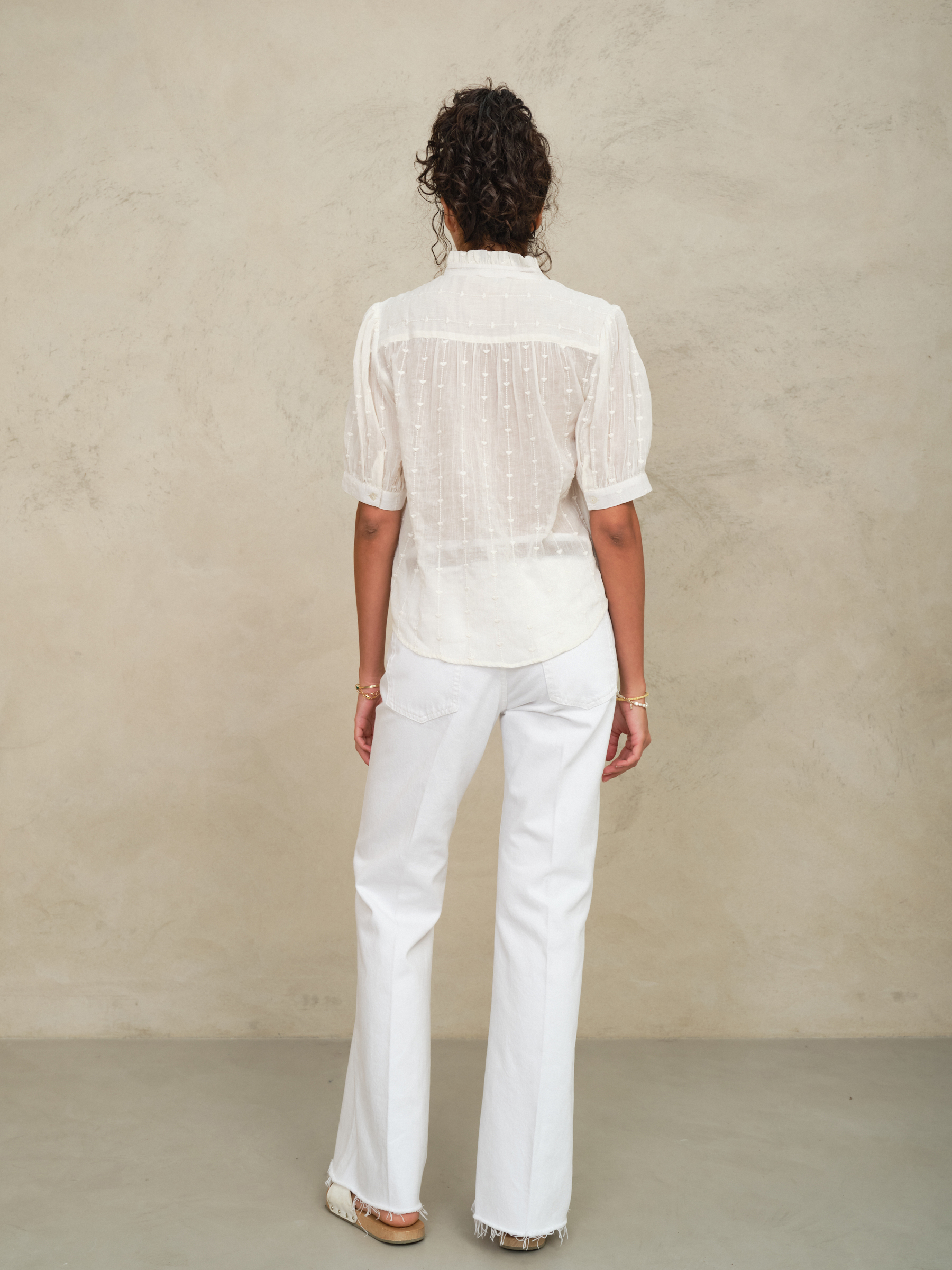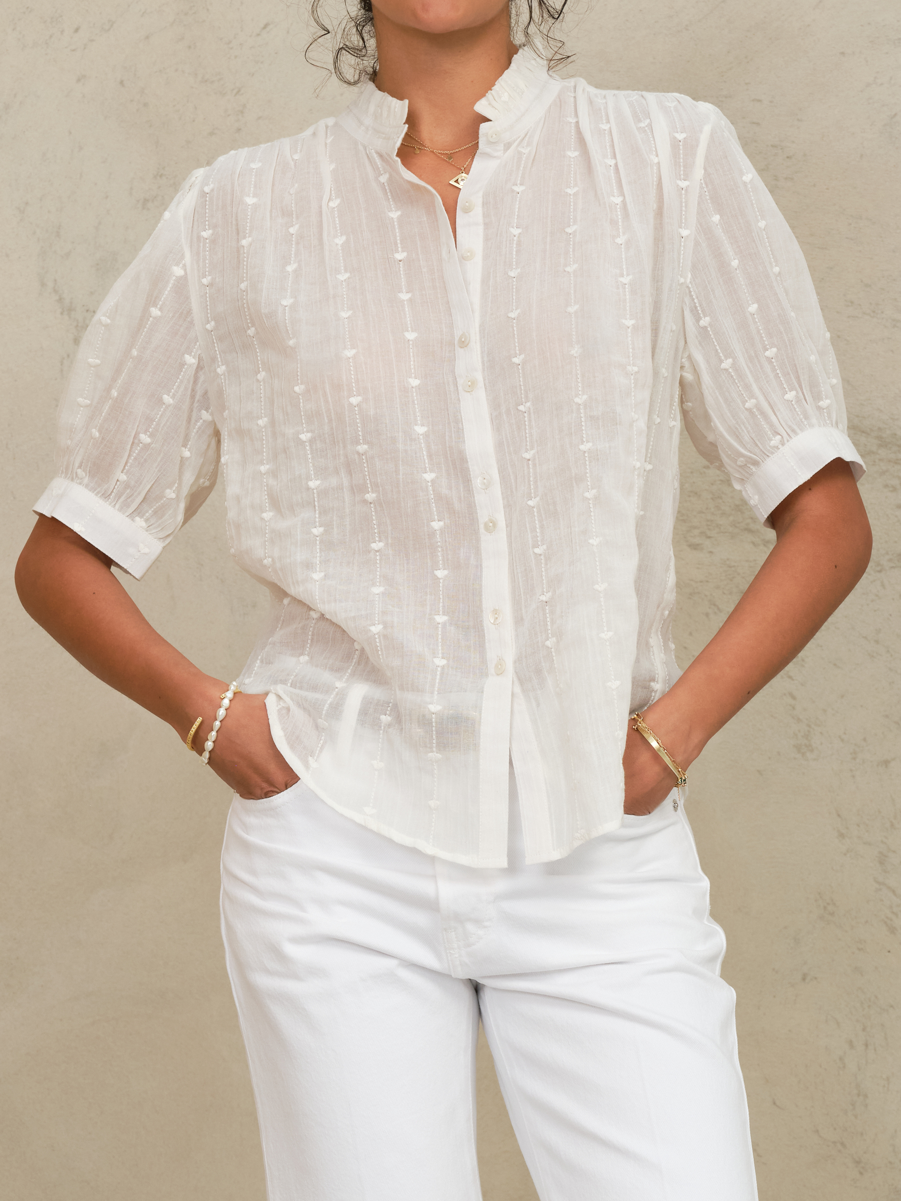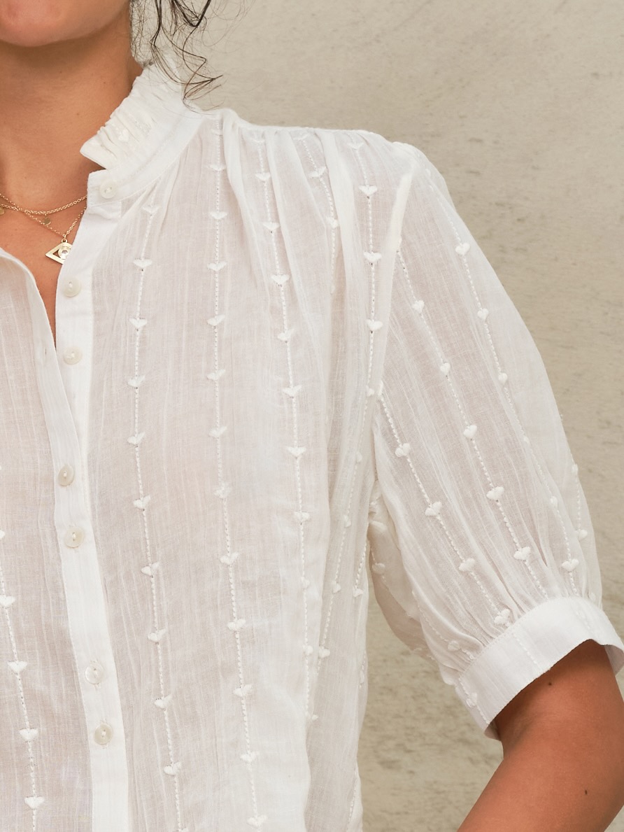 Designed with a pretty running stitch and heart patterned embroidery the Alli top is detailed with a frill collar, button fastening and pretty half sleeves to make a really easy addition to your summer wardrobe.