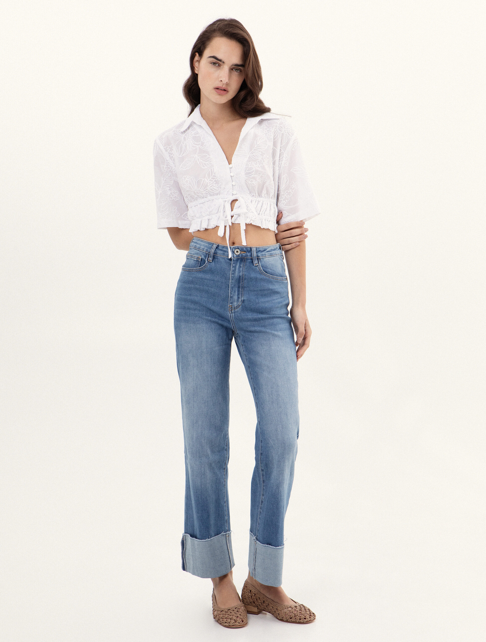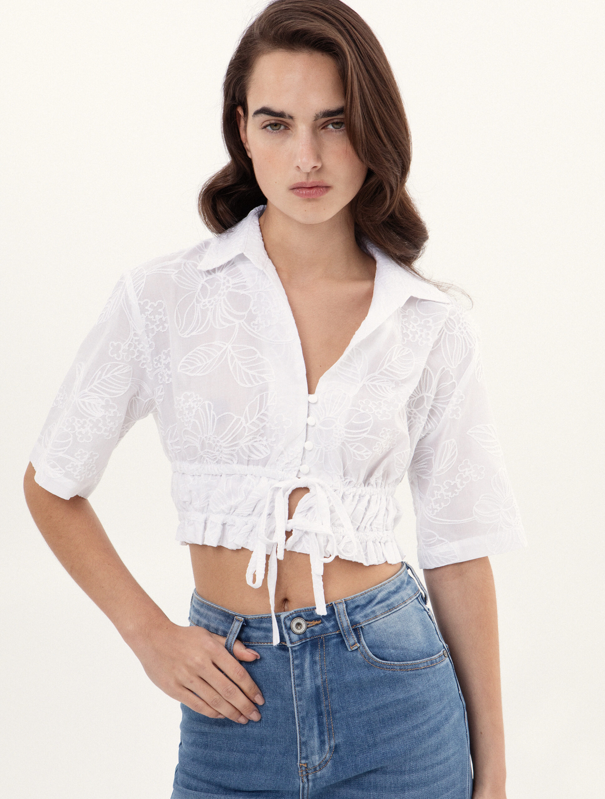 Λευκό cropped πουκάμισο, που συνδυάζει τον διαχρονικό σχεδιασμό με μια μοντέρνα, ανάγλυφη ύφανση. Το ιδιαίτερο ύφασμα με τα διακριτικά σχέδια προσδίδει βάθος και μια premium αίσθηση, κάνοντας το το απόλυτο κομμάτι για τις καλοκαιρινές σας εμφανίσεις. Διαθέτει κλασικό γιακά πουκαμίσου και κολακευτικό V-neckline που καταλήγει σε ρυθμιζόμενα κουμπιά και κορδόνι στο μπροστινό μέρος. Το σούρωμα στην μέση επιτρέπει να το προσαρμόσετε ακριβώς στο σώμα σας. Κομψά μανίκια που φτάνουν έως τον αγκώνα.