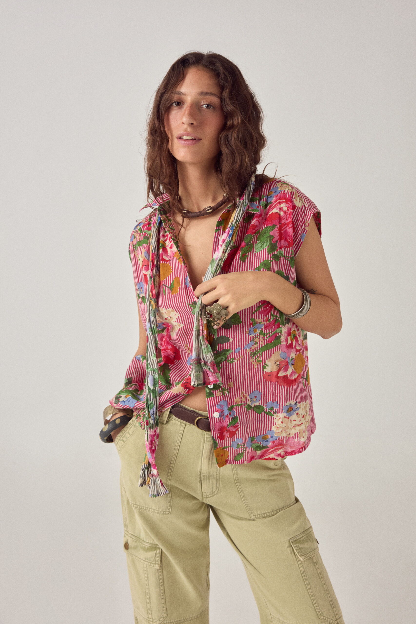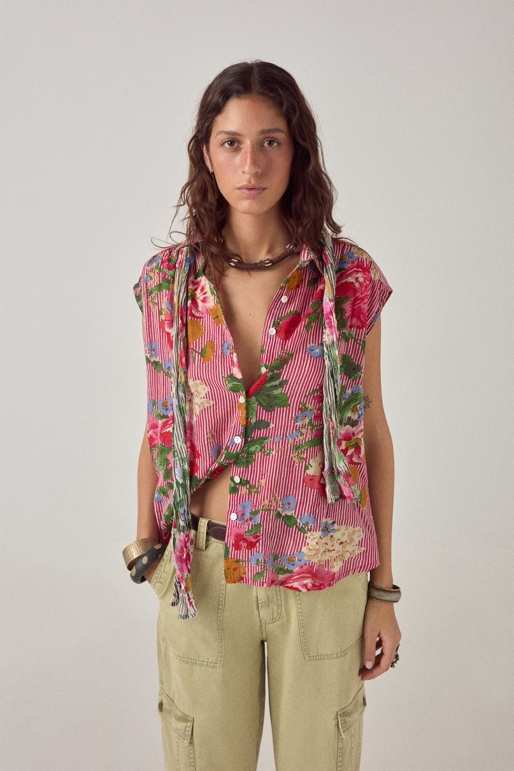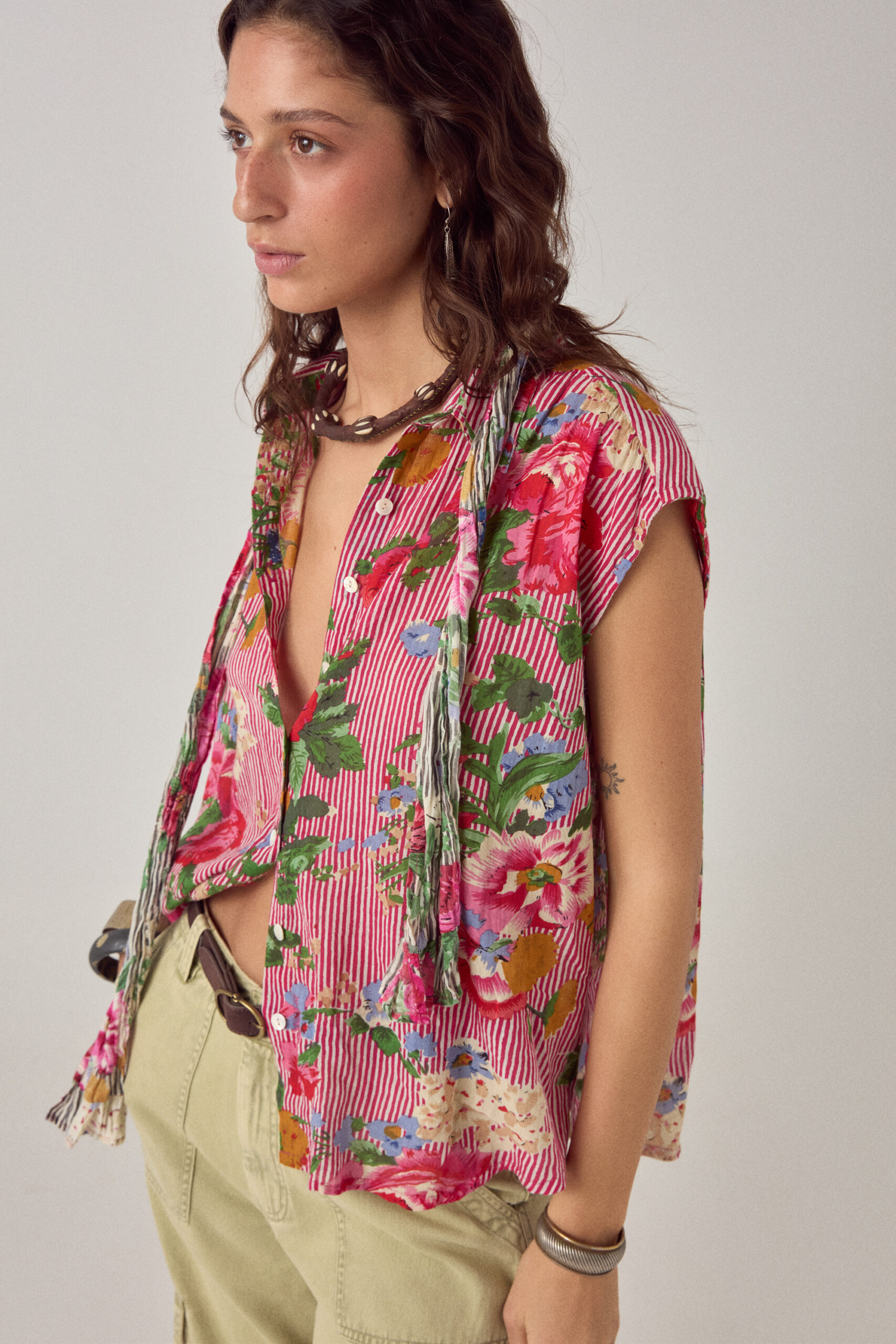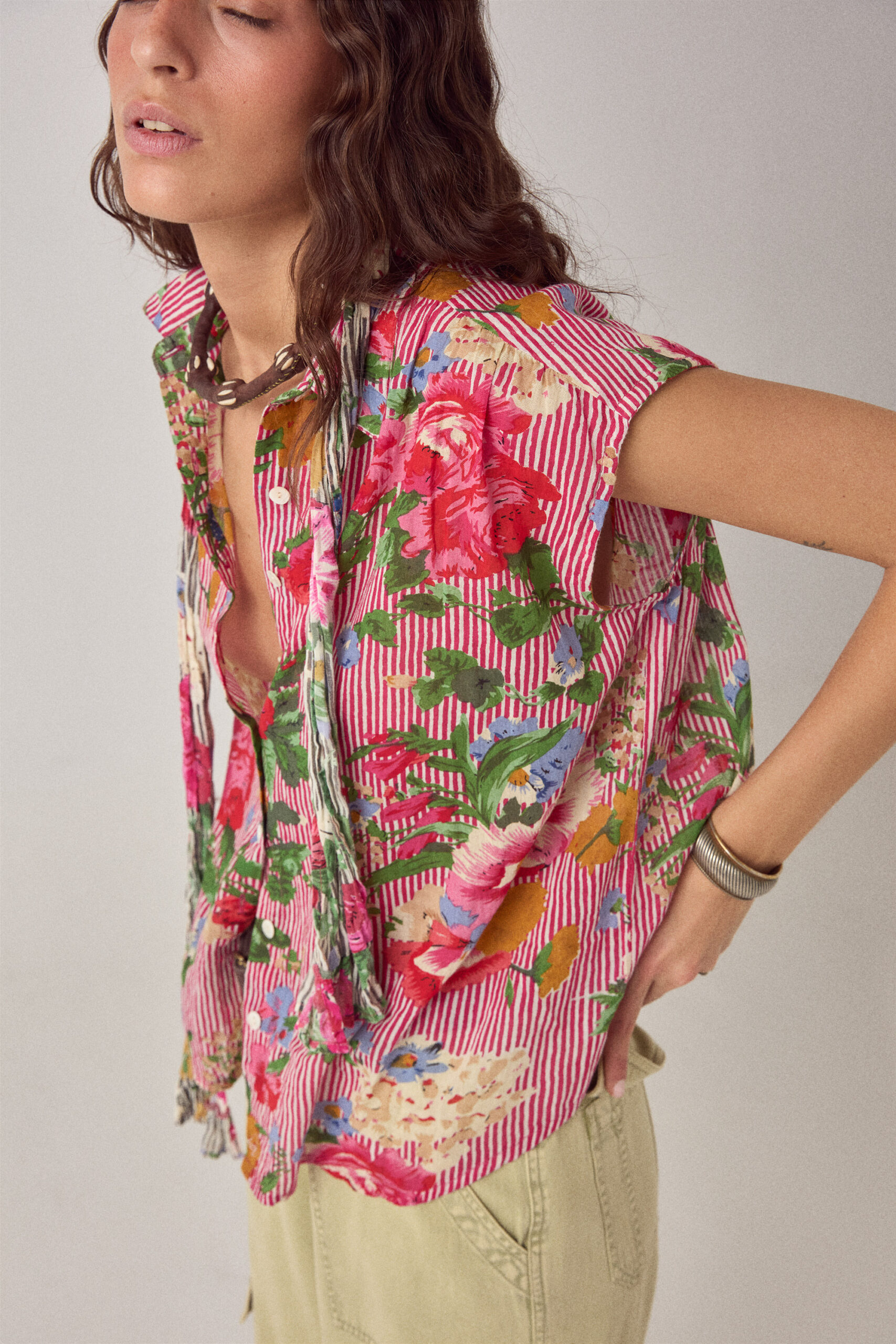 Finished with a buttoned front and a clean collar, the blouse balances graphic impact with a controlled silhouette. A strong, wearable piece where print leads and form follows