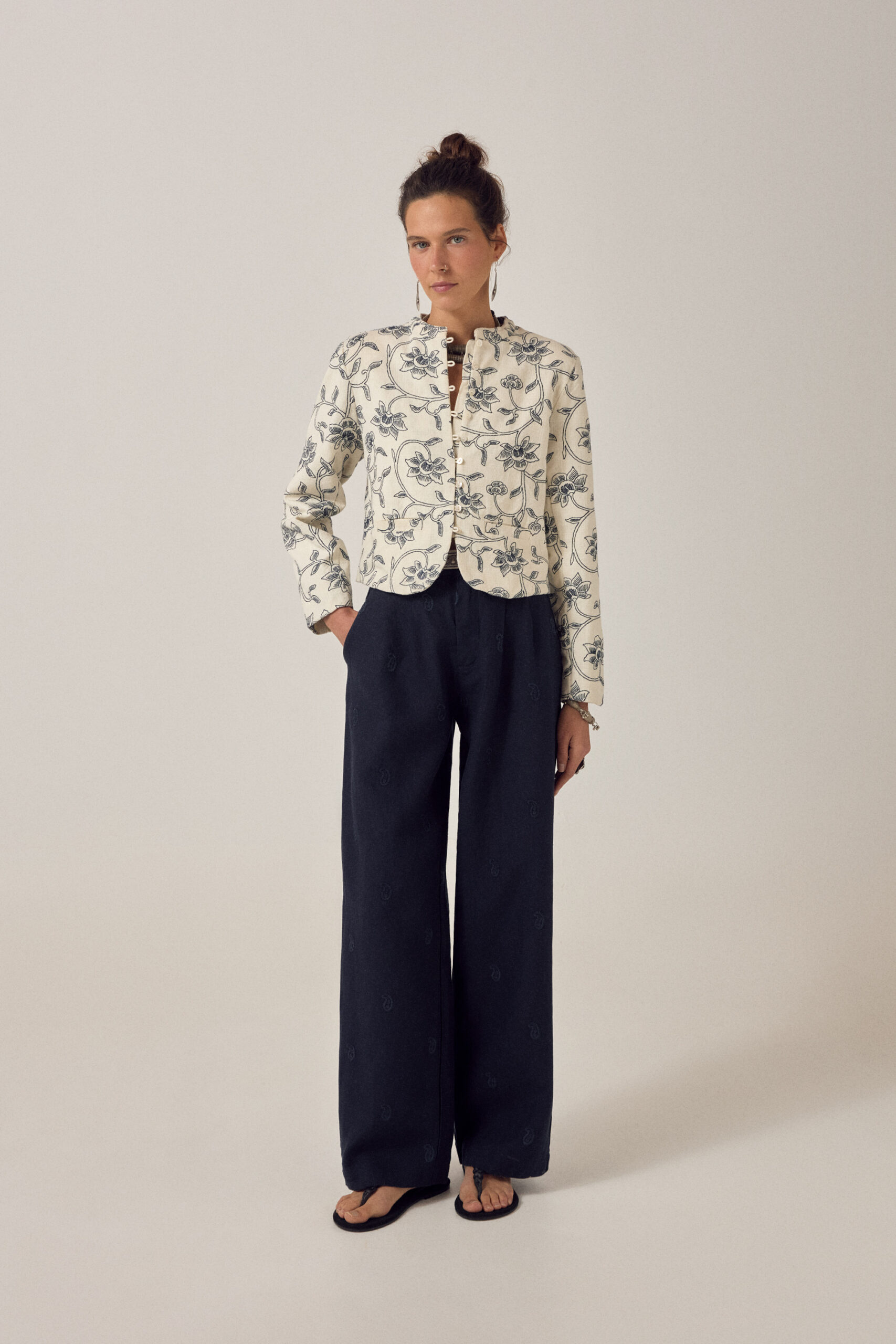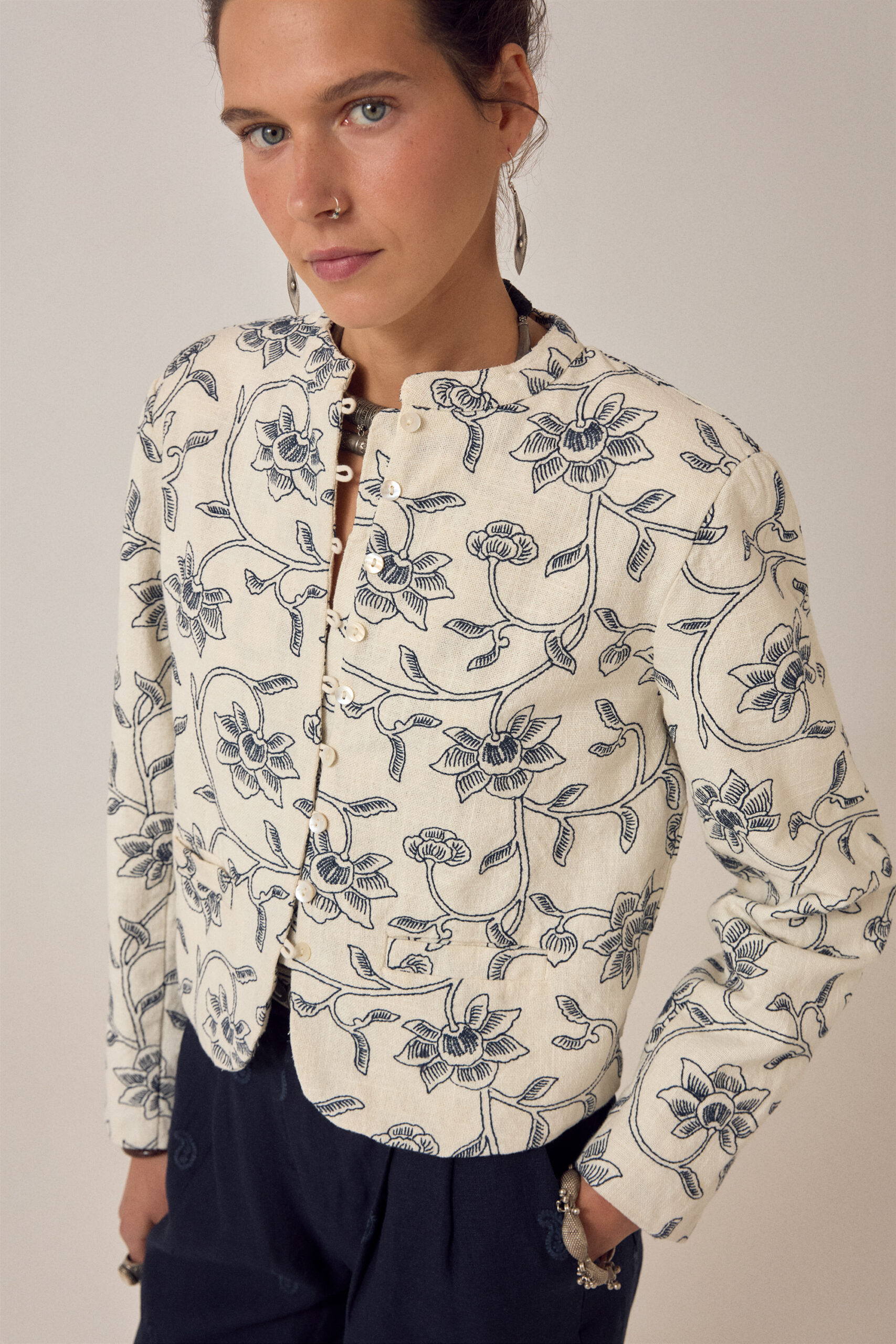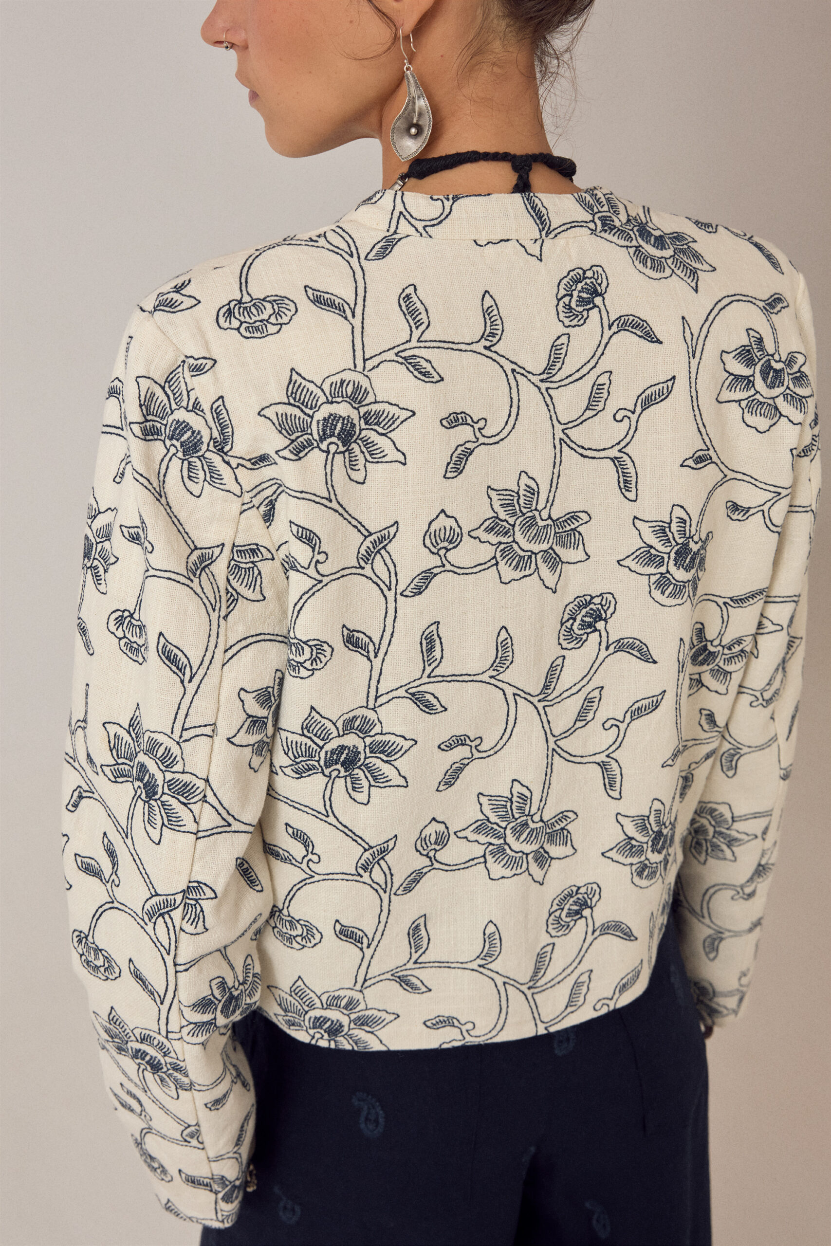 Jacket in cotton slub. Round neck, button-down front, long sleeves, patch pockets at the front. Clean, relaxed silhouette that sits easily on the body and layers without effort. Hand-painted motifs scattered across the surface.