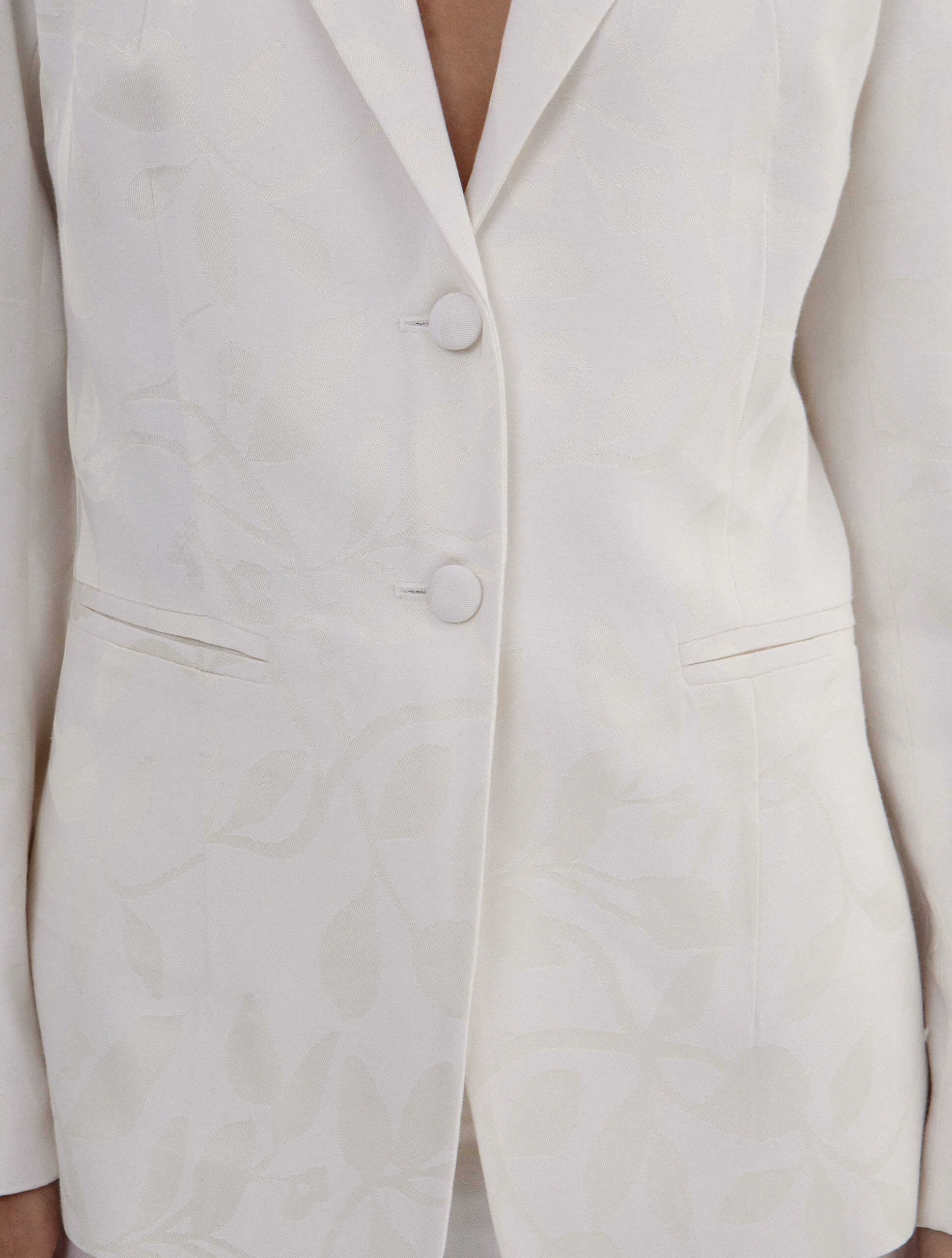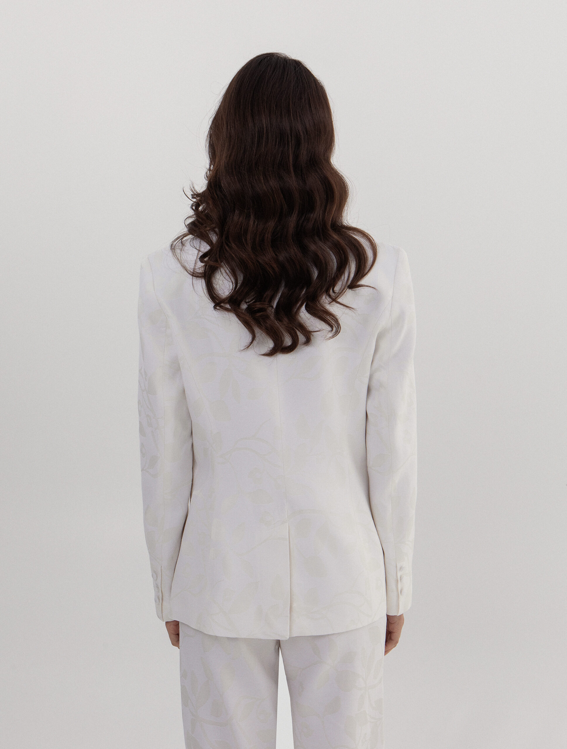 Μεσάτο σακάκι με ιδιαίτερη ύφανση από ανάγλυφα λουλούδια στην ίδια απόχρωση, που δίνουν μια πολυτελή, τρισδιάστατη όψη στο κλασικό λευκό κοστούμι.