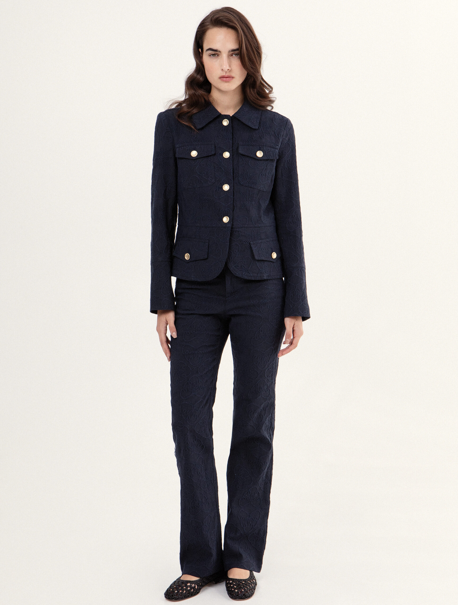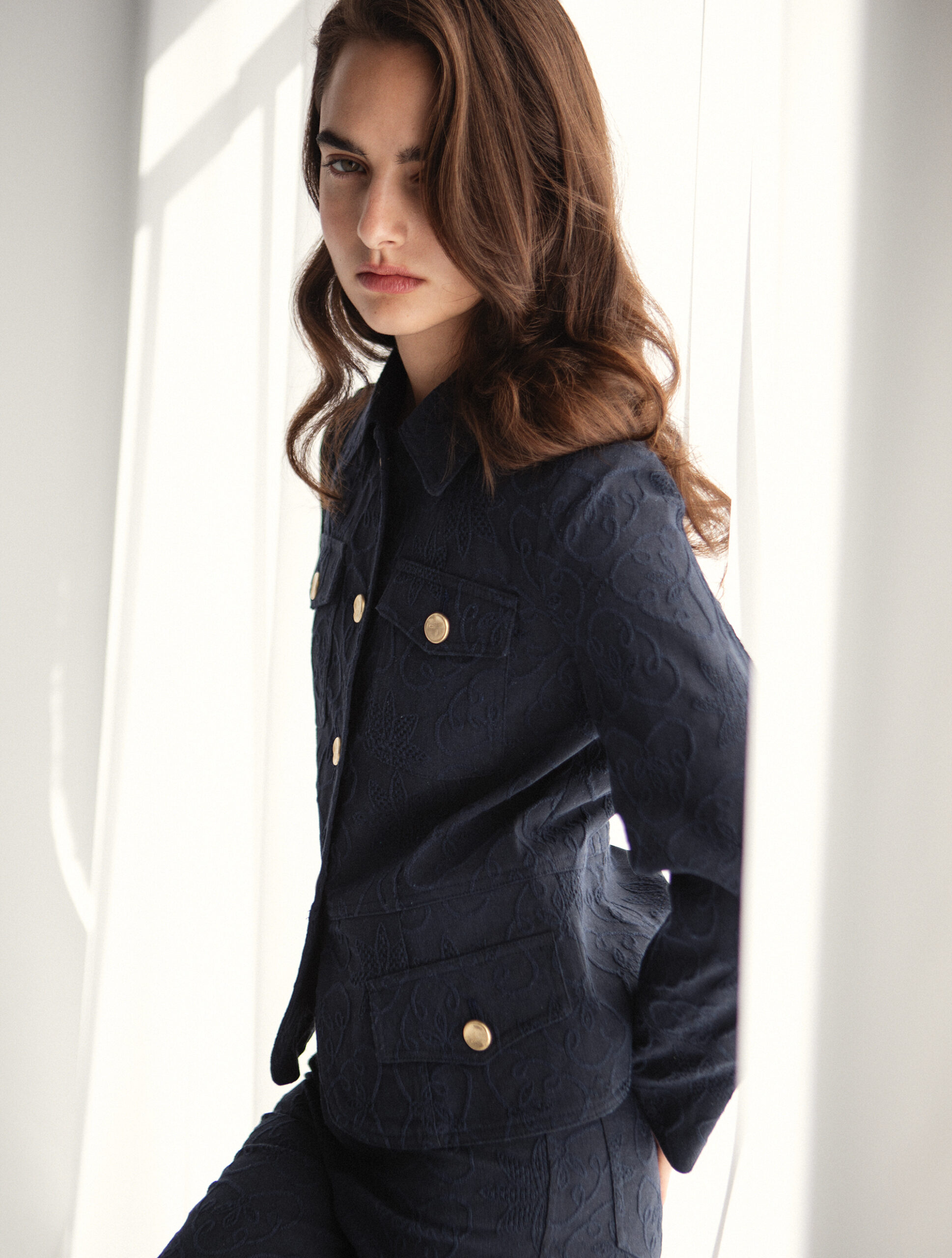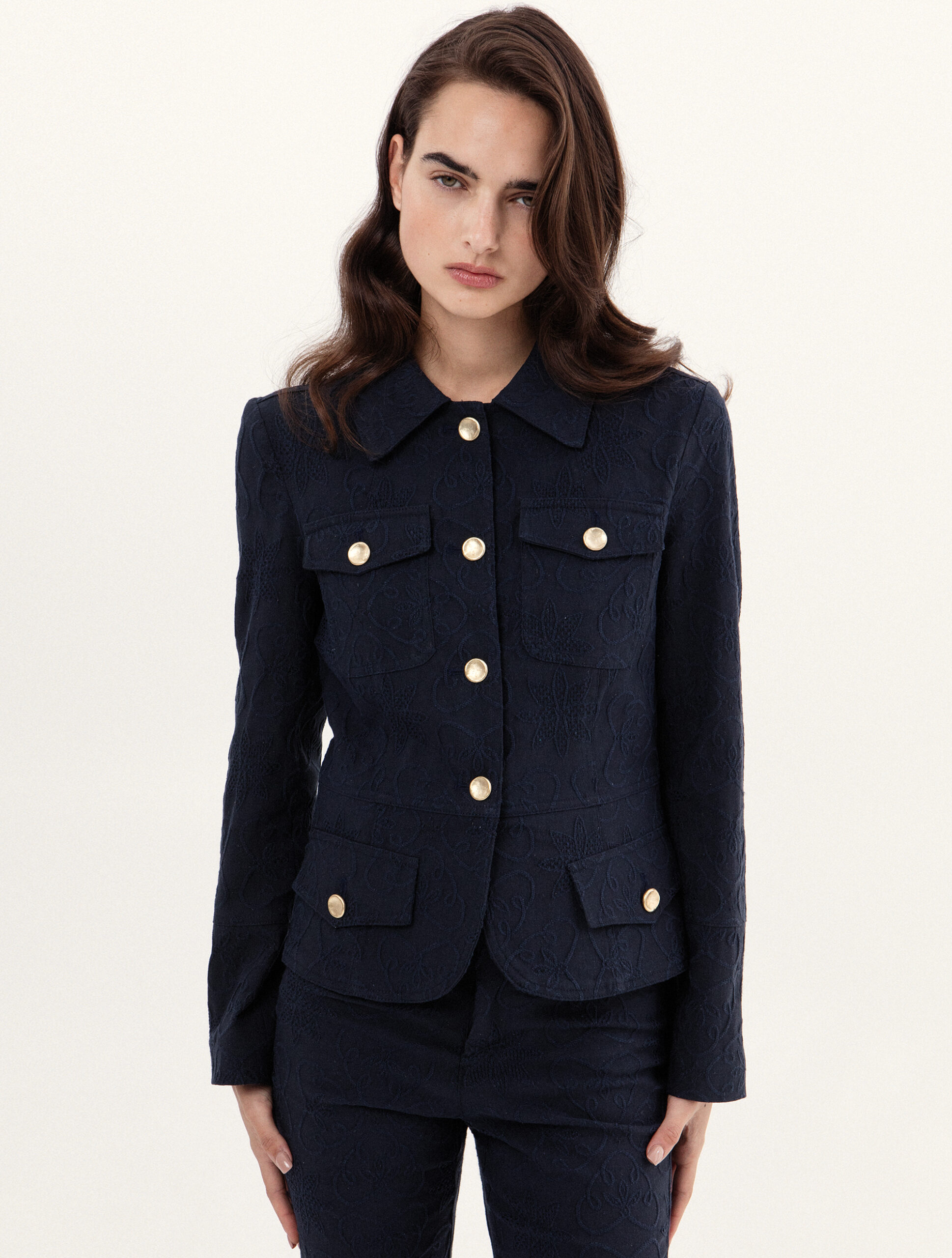 Μεσάτο σακάκι με μπροστινές τσέπες και tailored γραμμή που αγκαλιάζει την σιλουέτα. Το ύφασμα διαθέτει μια ανάγλυφη υφή που προσφέρει βάθος και μια premium αίσθηση στην αφή. Διακοσμημένο με χρυσά κουμπιά που προσφέρουν μια λάμψη στο σύνολο.