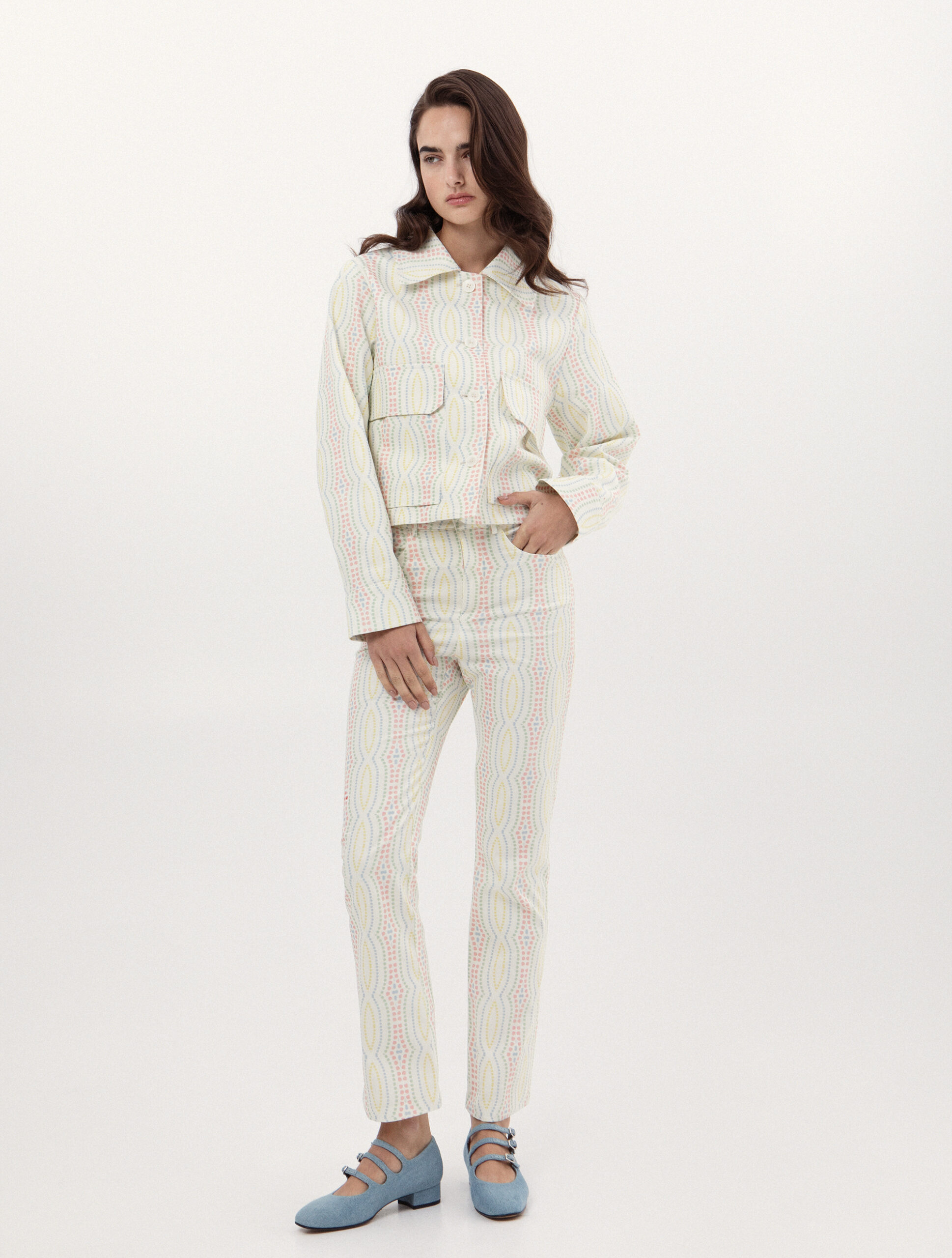 Παντελόνι με print και ιδιαίτερο μοτίβο σε παστέλ τόνους. Η slim-fit γραμμή του που ανοίγει ελαφρώς στο κάτω μέρος δημιουργεί μια σύγχρονη σιλουέτα, ενώ το βαμβακερό ύφασμα προσφέρει την ιδανική ισορροπία μεταξύ σταθερότητας και άνεσης. Συνδυάζεται τέλεια με το αντίστοιχο peplum τοπ για ένα εντυπωσιακό total look.