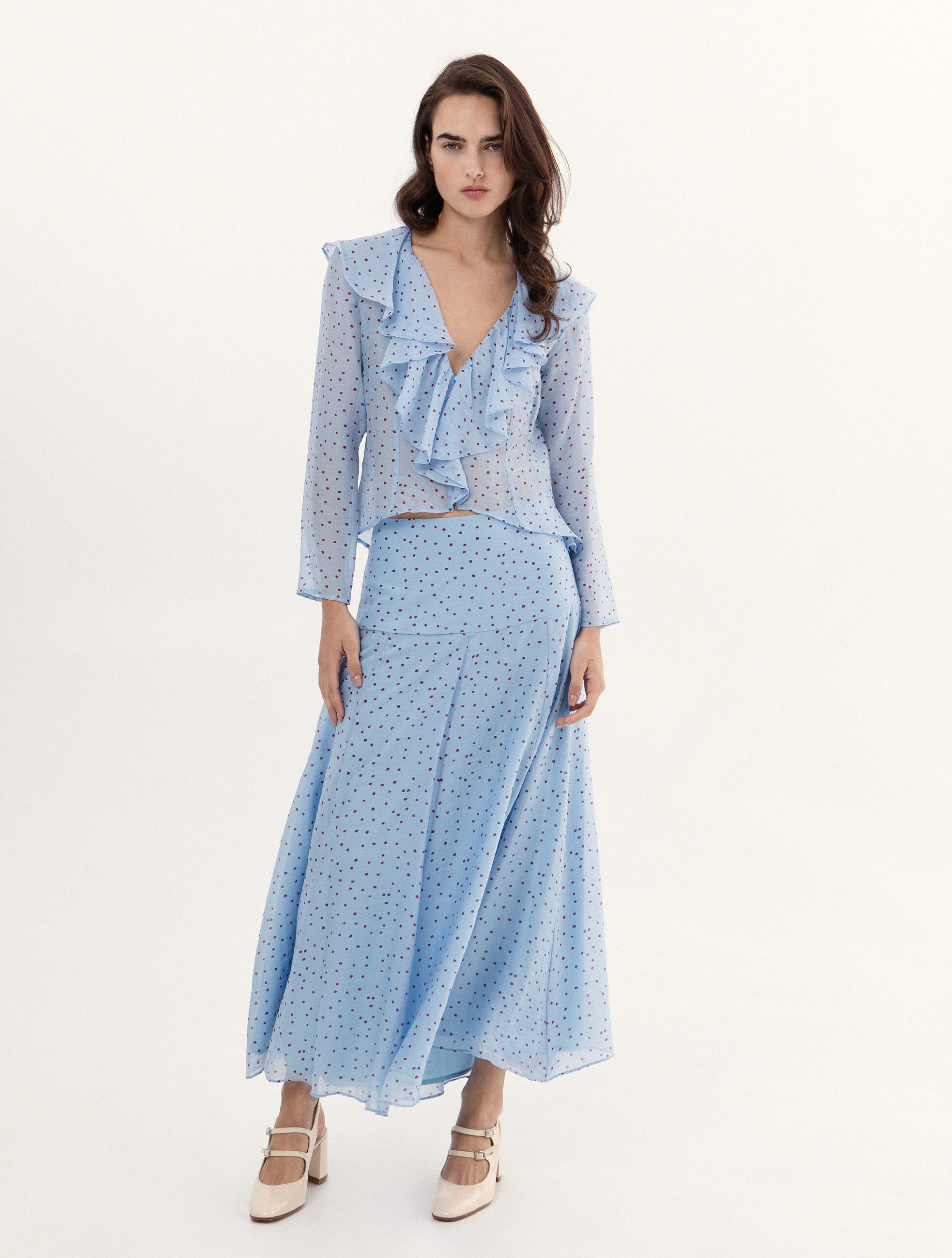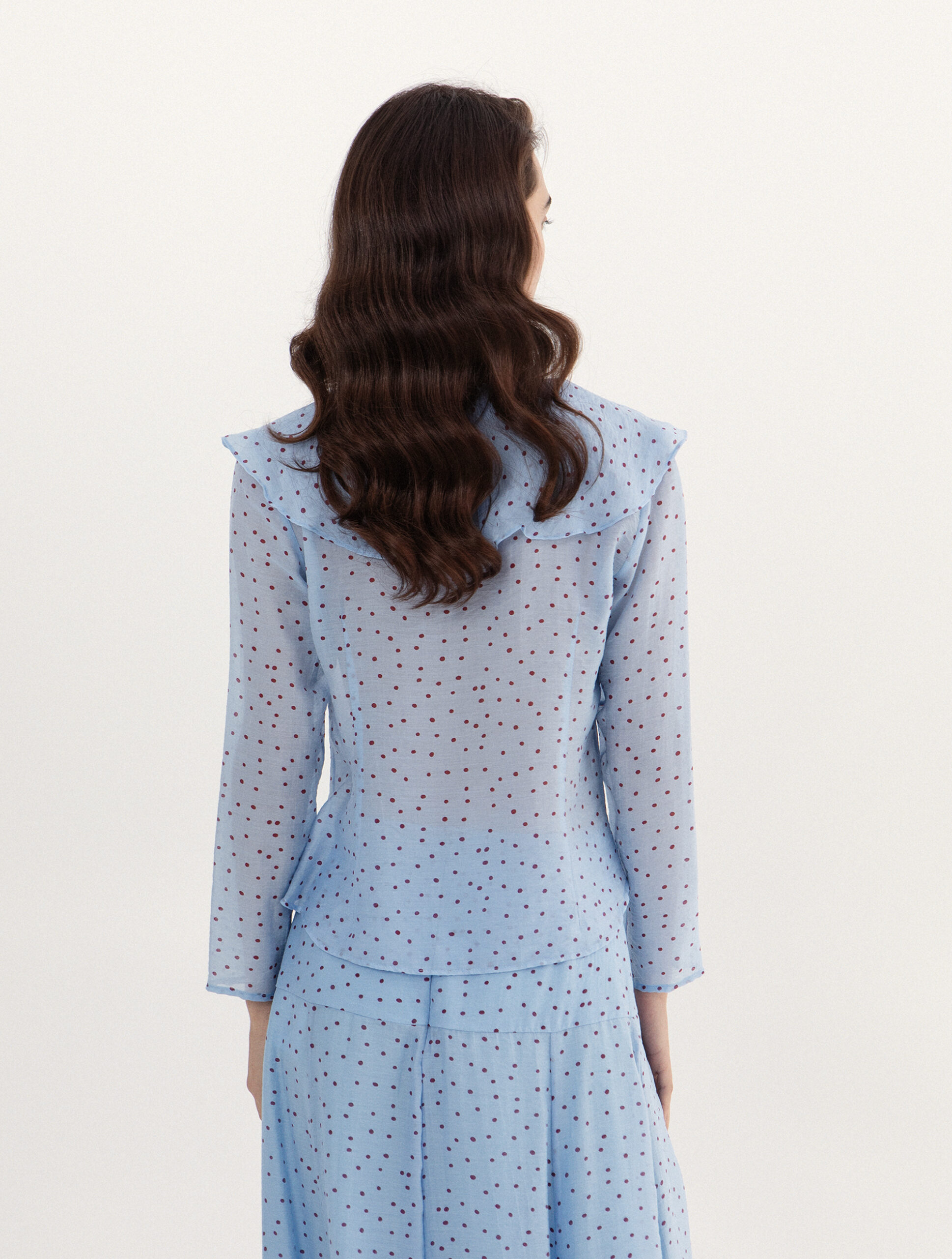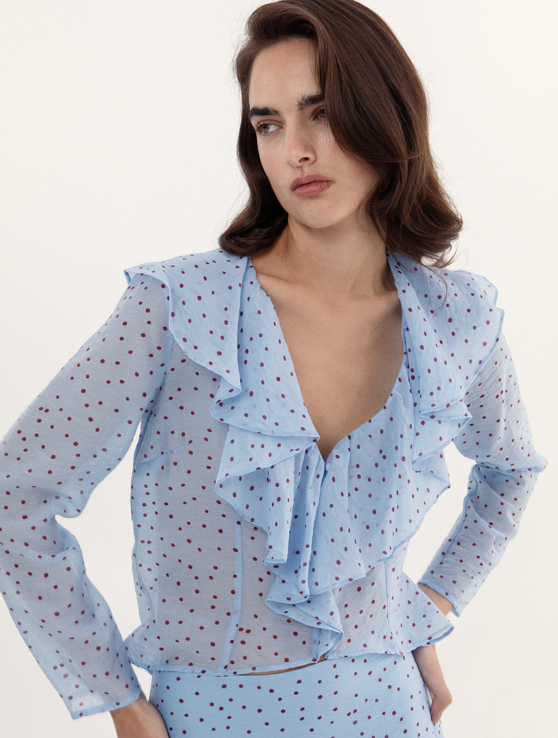 Αέρινη πουά μπλούζα με βολάν, που συνδυάζει τον διαχρονικό ρομαντισμό με μια σύγχρονη υφή. Τα εντυπωσιακά βολάν και το polka dot print την καθιστούν το απόλυτο statement κομμάτι για τις ανοιξιάτικες και καλοκαιρινές σας εμφανίσεις.
