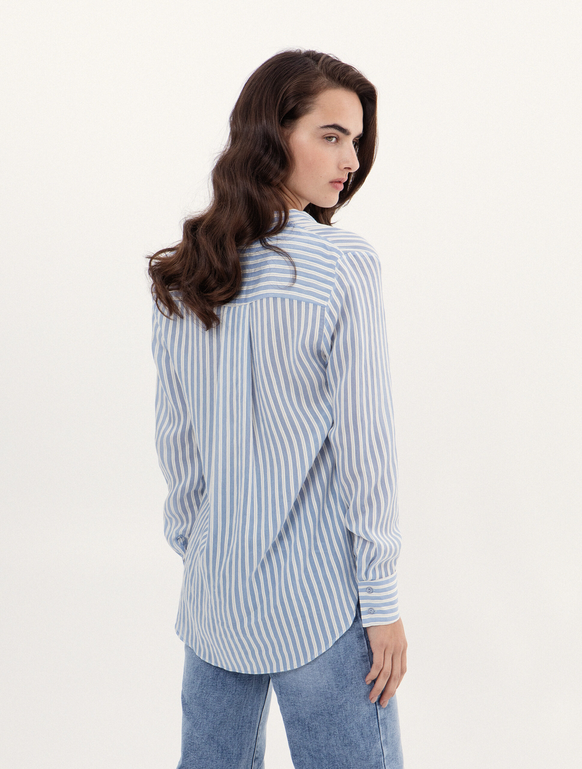 Αέρινο πουκάμισο με γιακά μάο, με ημιδιάφανη όψη και κάθετες ανάγλυφες ρίγες που χαρίζουν μια αίσθηση πολυτέλειας και άνεσης, καθιστώντας το ιδανικό για layering ή για να φορεθεί μόνο του.