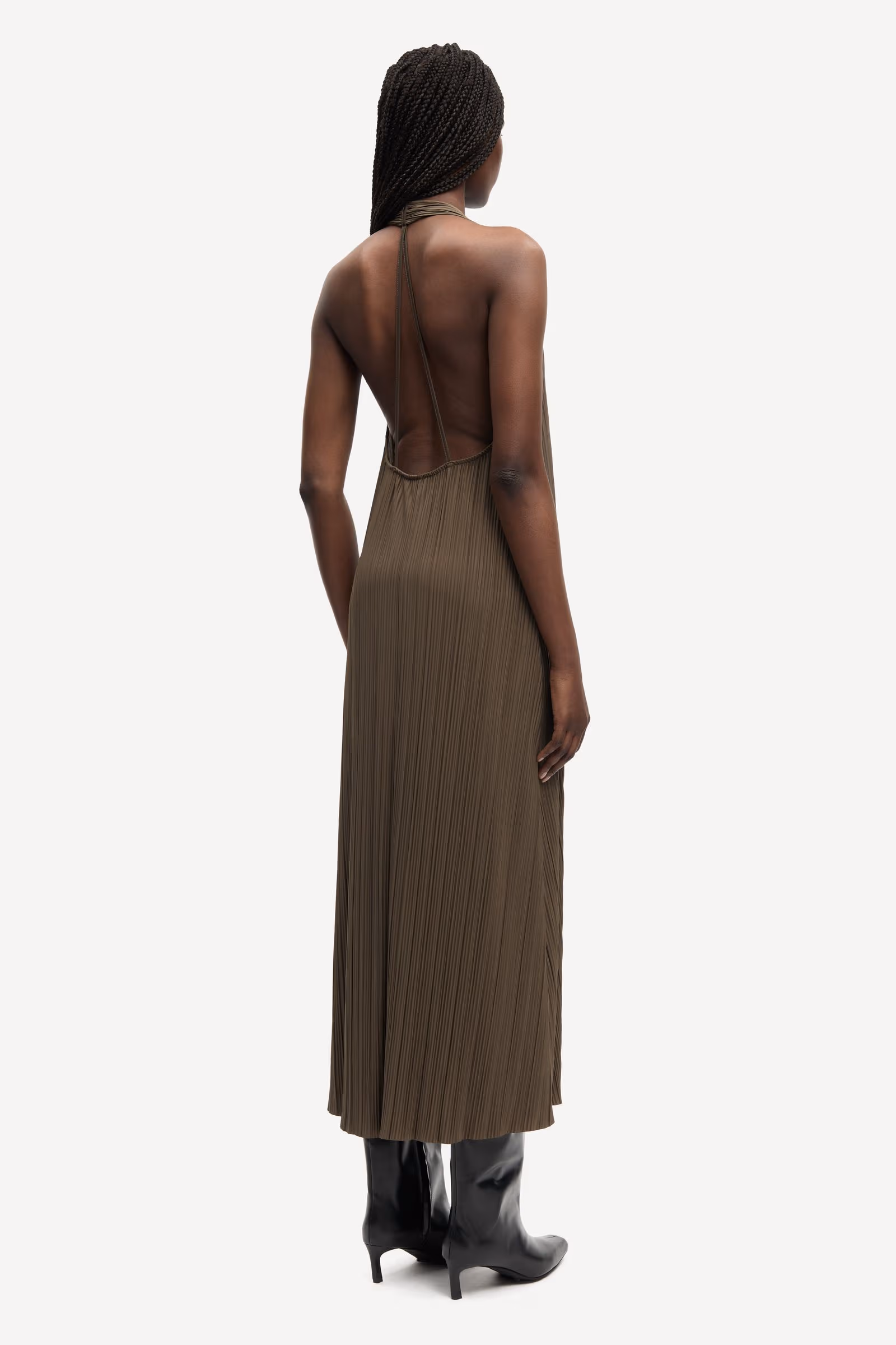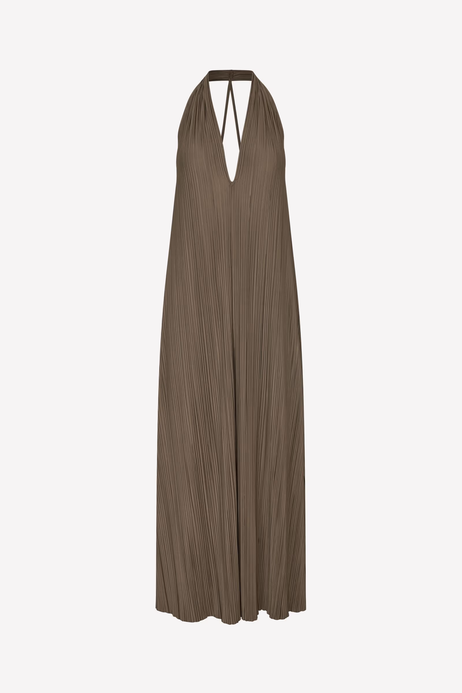 Sleeveless pleated jersey maxi dress with a loose fit and A-line skirt. Halter straps. V-neck and open back. Main material made from an elastic blend of recycled polyester.