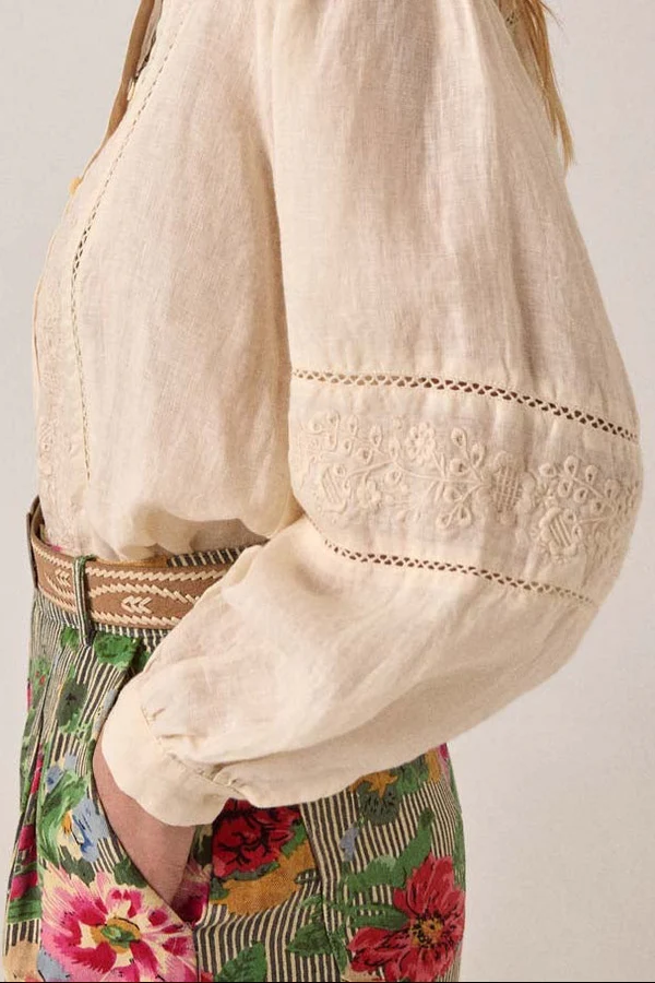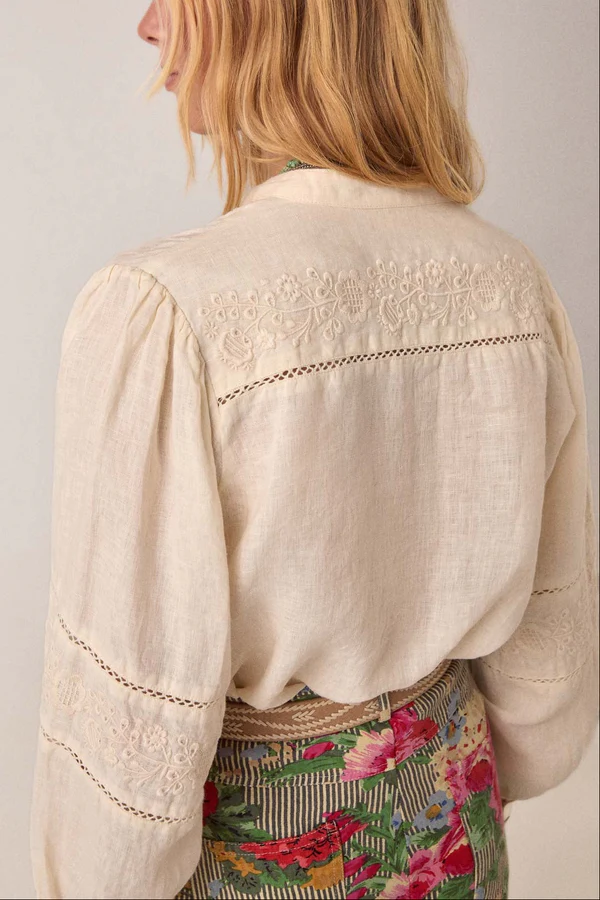 Relaxed blouse in cotton-linen blend with delicate embroidered details. Classic collar, button-down front, long sleeves with gentle volume. Cotton-linen breathable and fresh, natural texture improves with wear.