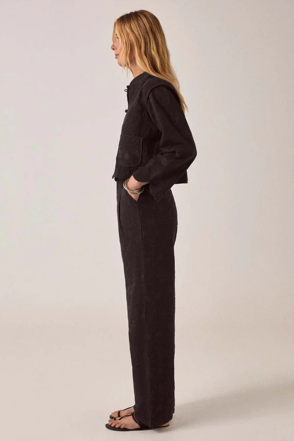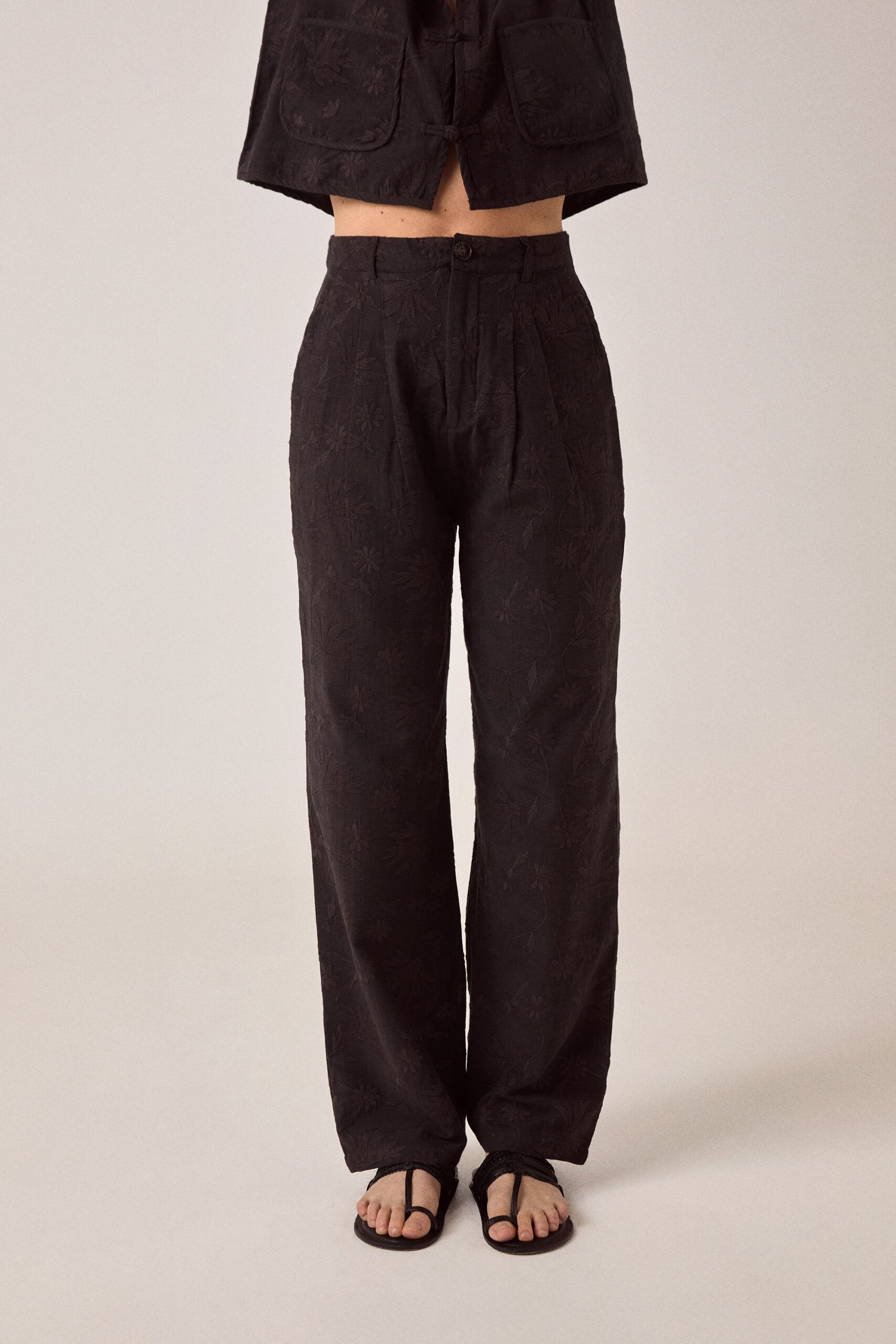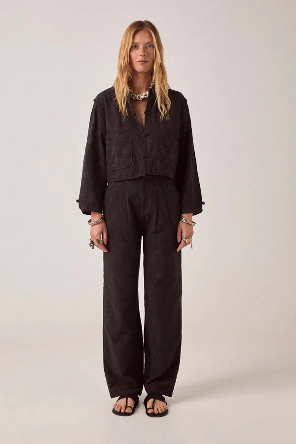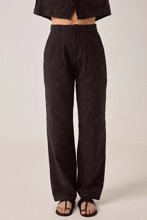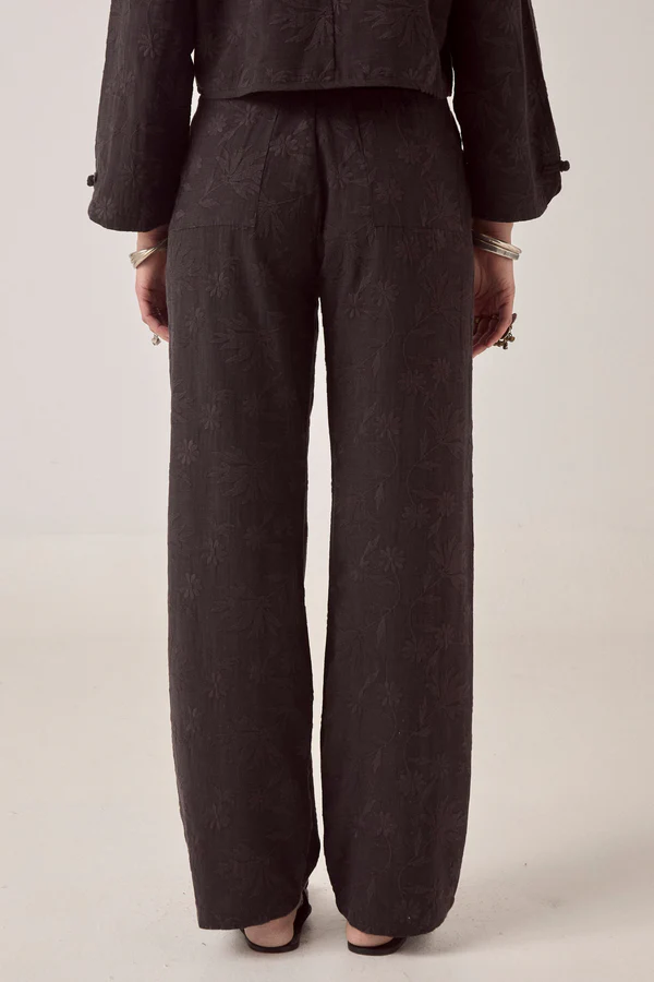 The embroidery is subtle—tone-on-tone black so it reads as texture. Viscose slub has weight without being heavy, holds the wide leg without collapsing. The pleats add structure at the waist.