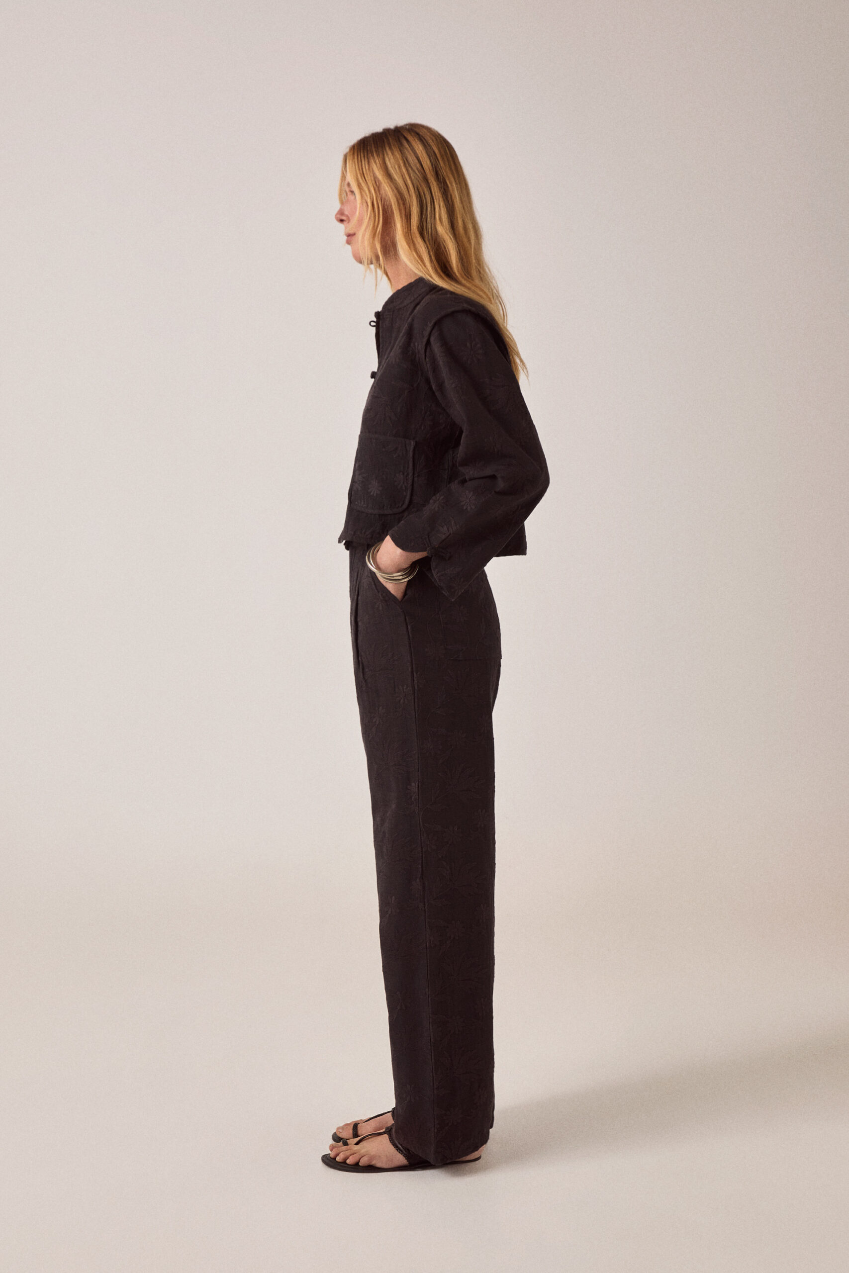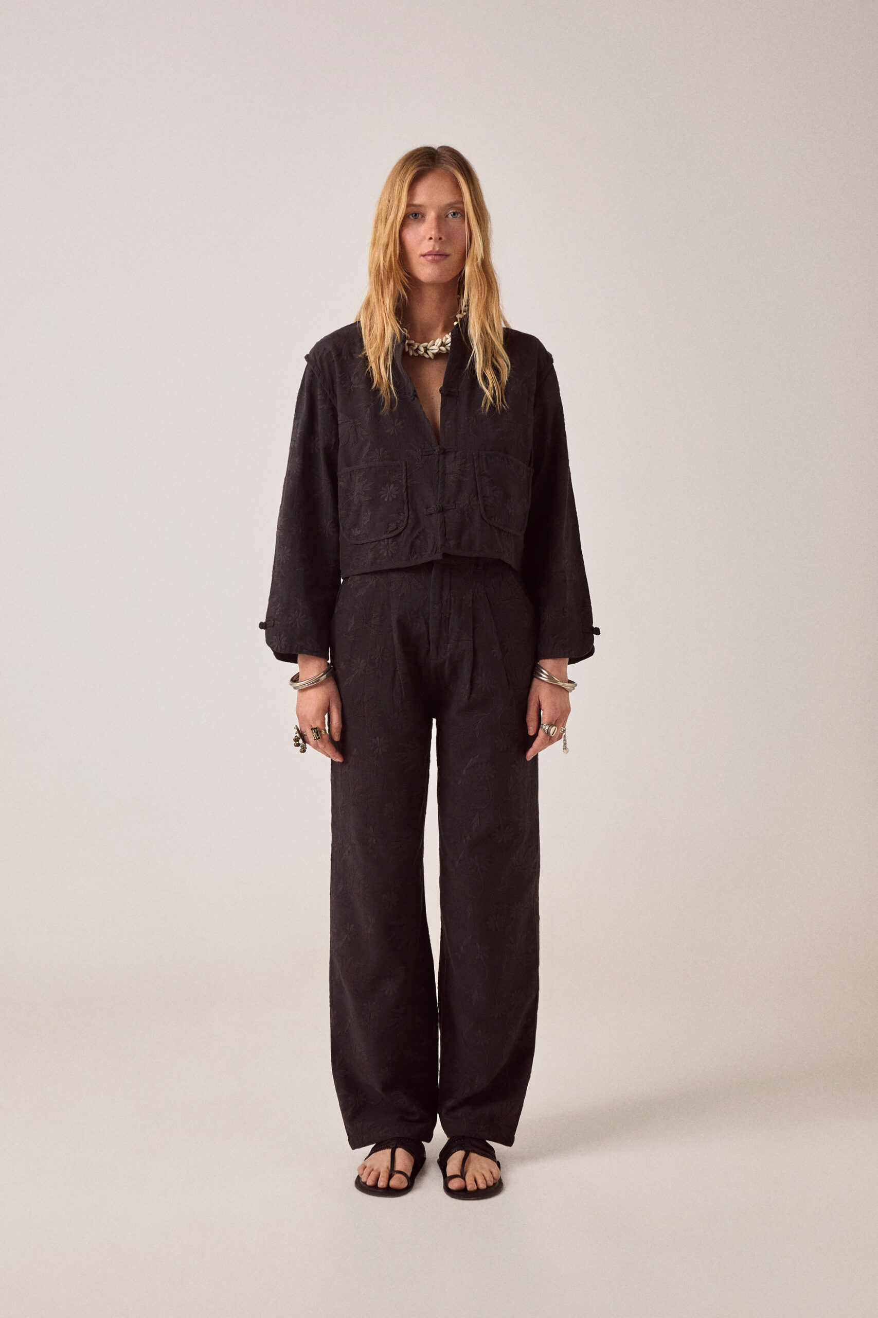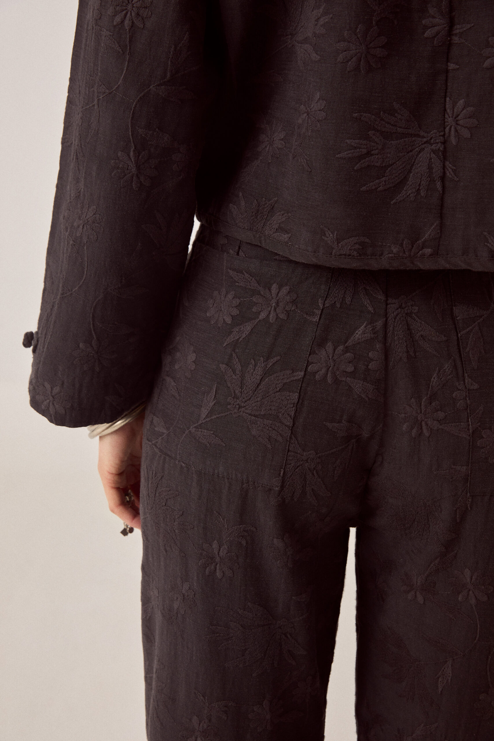 The embroidery is subtle—tone-on-tone black so it reads as texture. Viscose slub has weight without being heavy, holds the wide leg without collapsing. The pleats add structure at the waist.